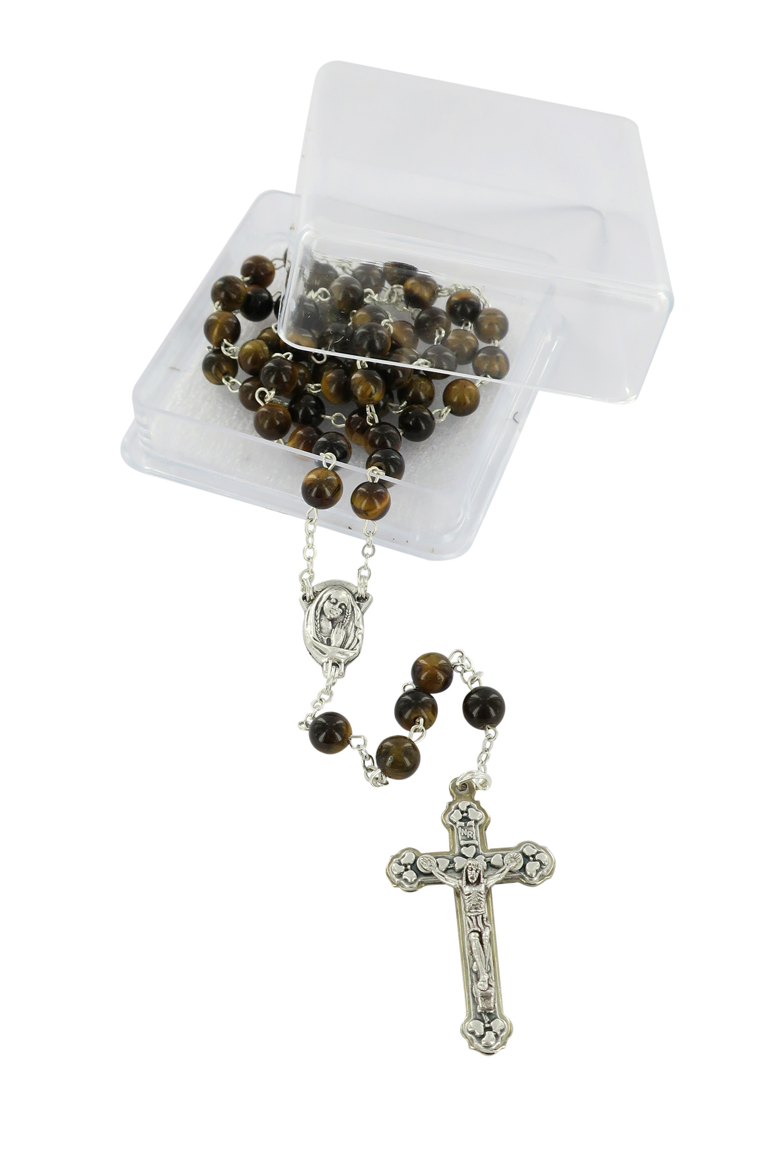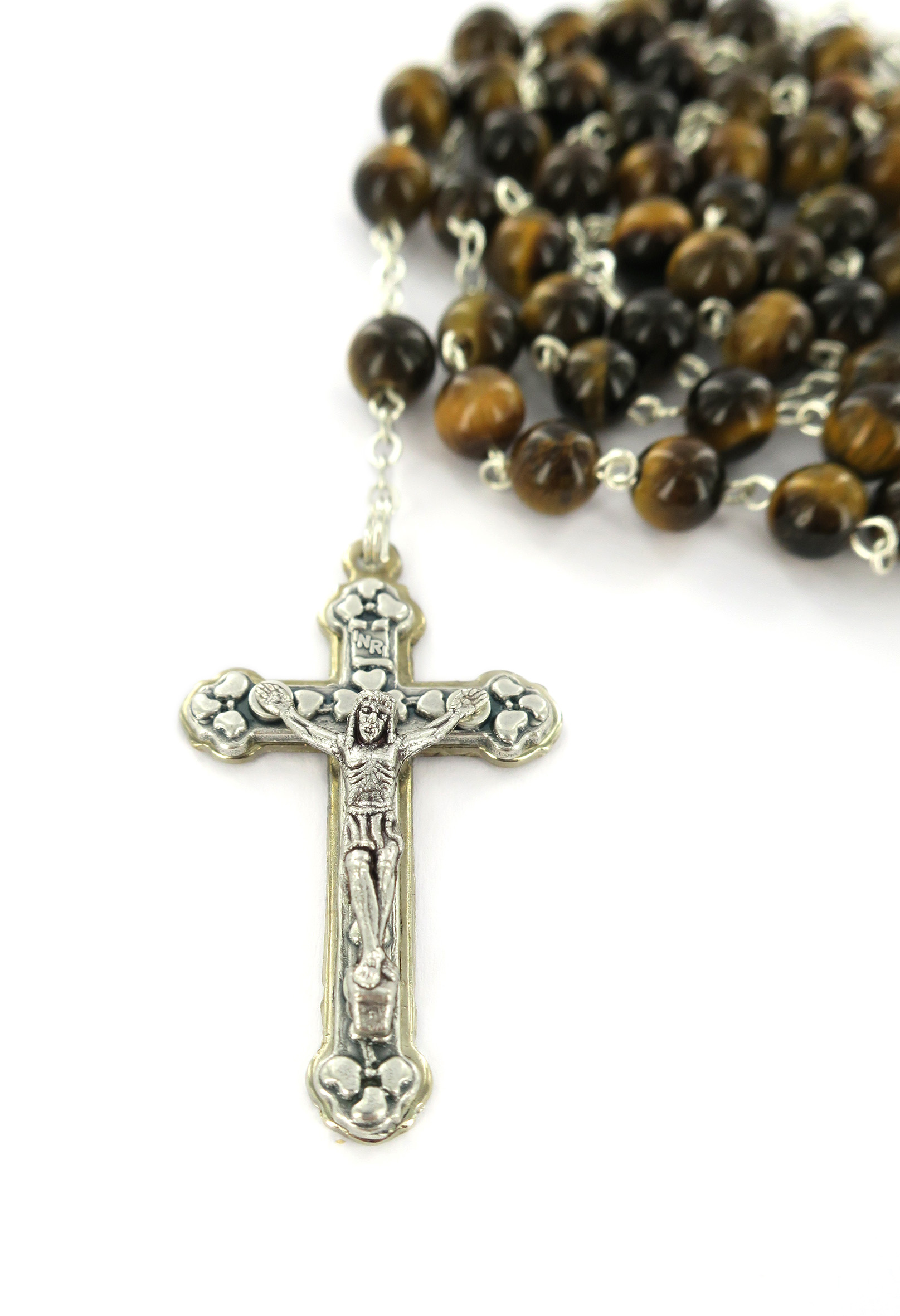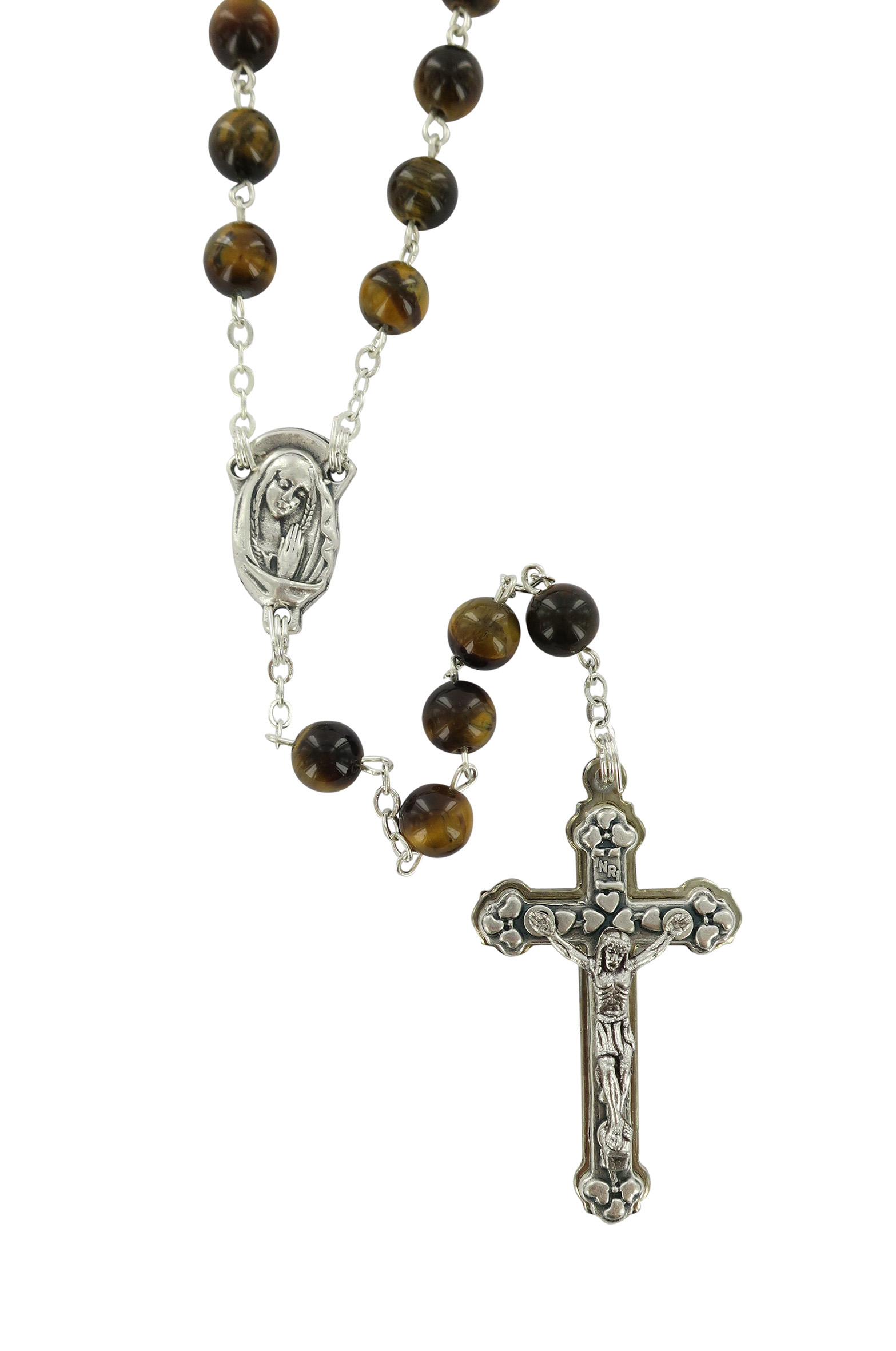 Il rosario è in legatura a mano con filo di metallo argentato, e i grani di mm 6 sono in vero occhio di tigre. Croce con Cristo riportato e crociera ovale con Madonnina pregante e su retro di essa vi è il Sacro Cuore di Gesù.