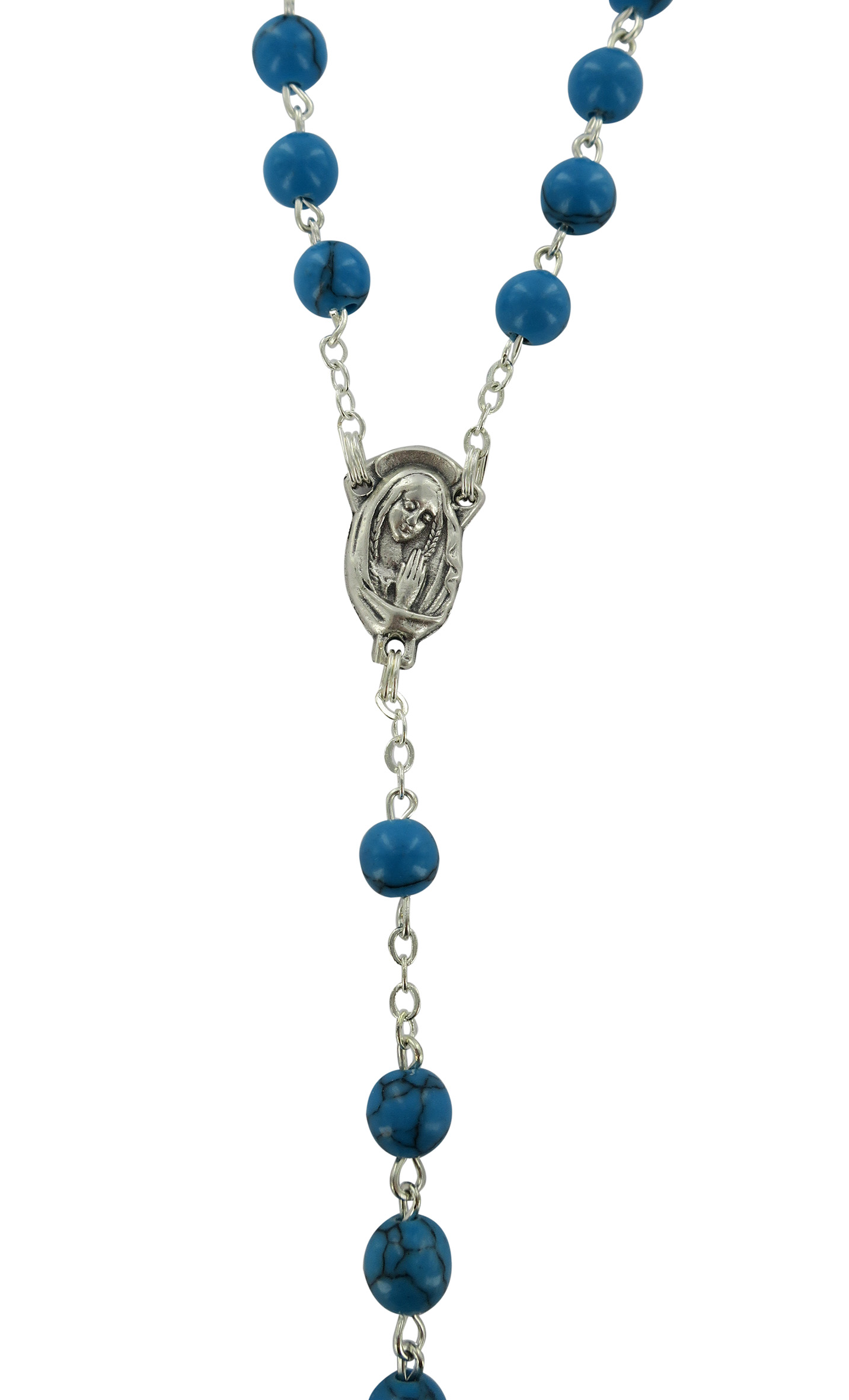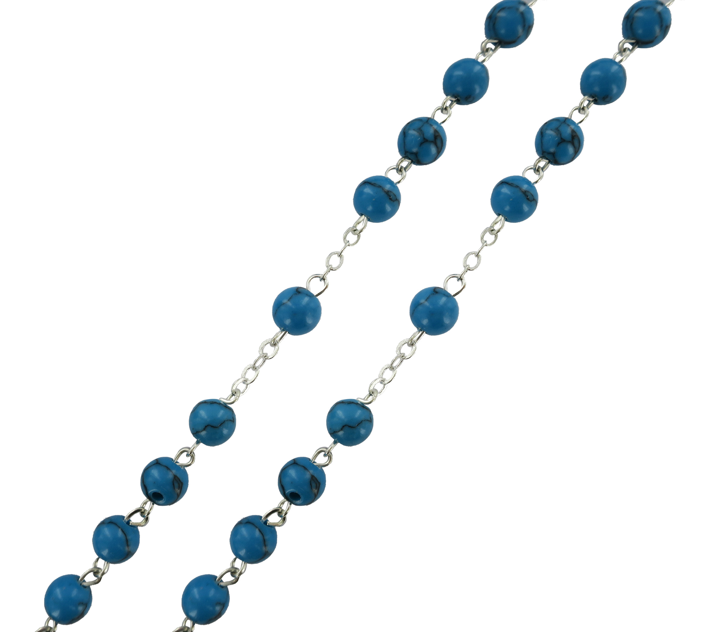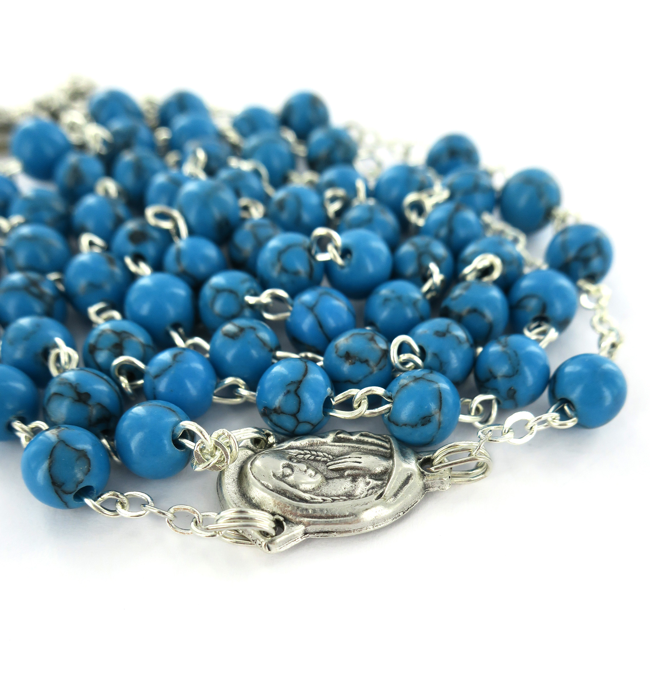 Il rosario è in legatura a mano con filo di metallo argentato, e i grani di mm 6 sono in vero turchese. Croce con Cristo riportato e crociera ovale con Madonnina pregante e su retro di essa vi è il Sacro Cuore di Gesù.