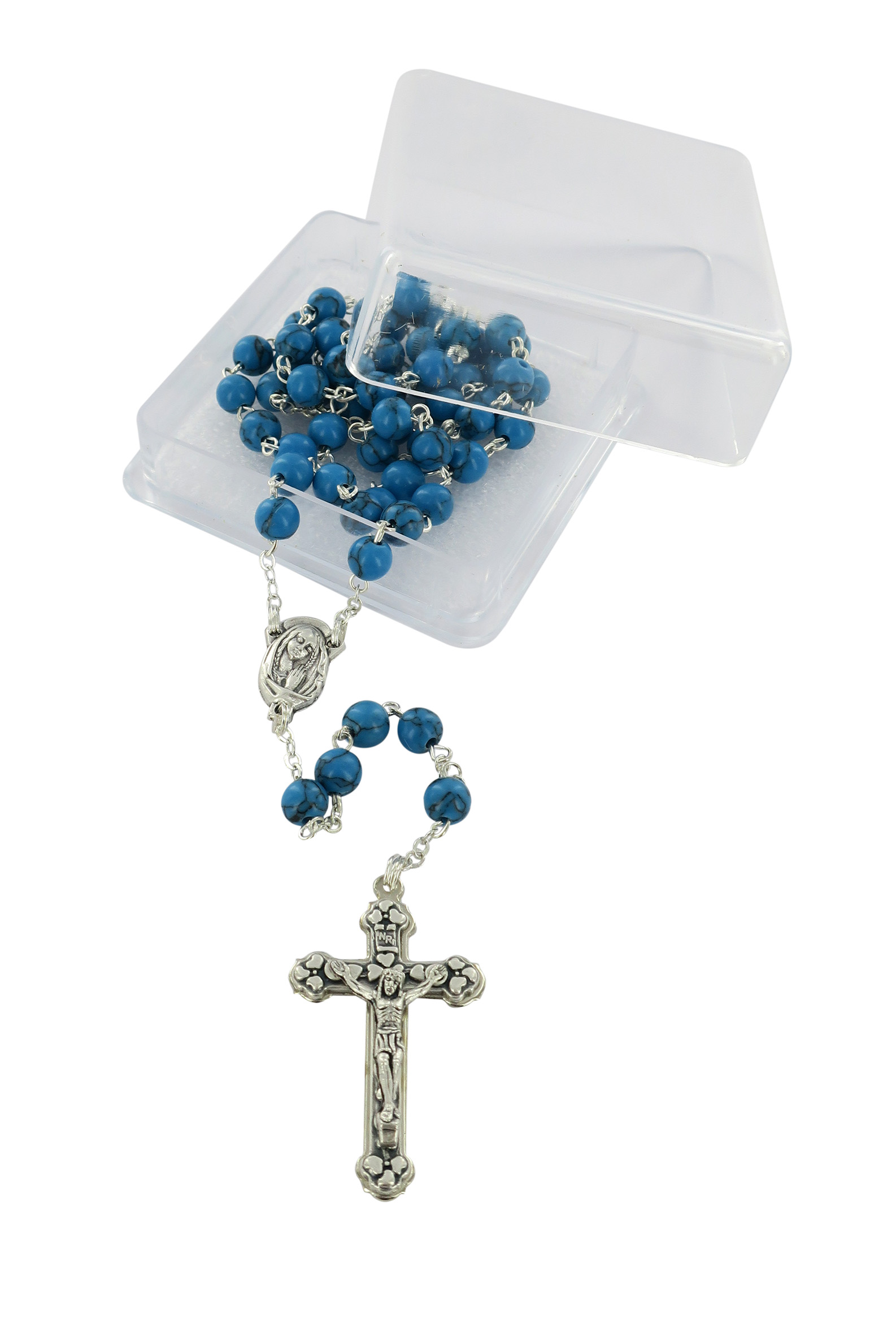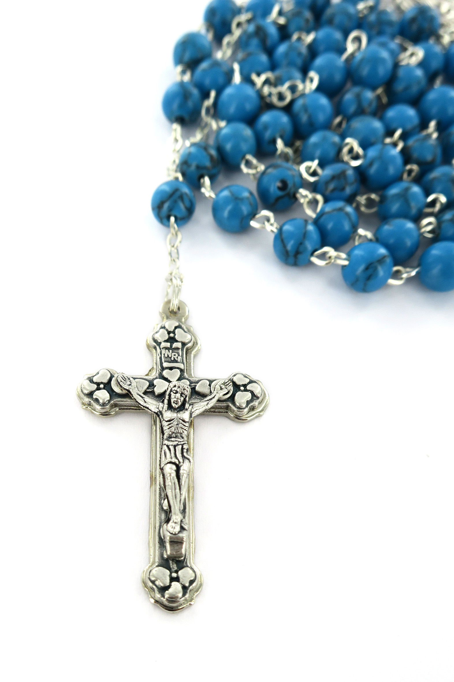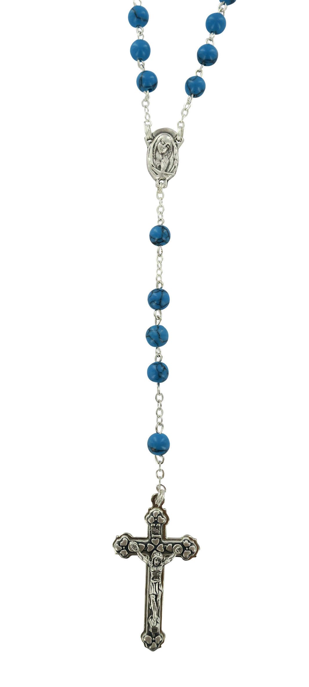 Il rosario è in legatura a mano con filo di metallo argentato, e i grani di mm 6 sono in vero turchese. Croce con Cristo riportato e crociera ovale con Madonnina pregante e su retro di essa vi è il Sacro Cuore di Gesù.