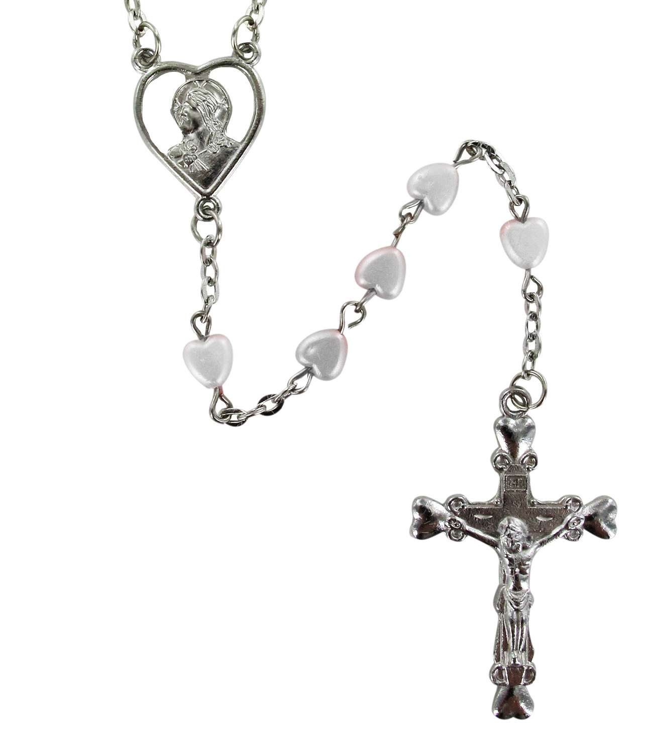 Rosario in plastica bianco a forma di cuoricino con legatura in metallo