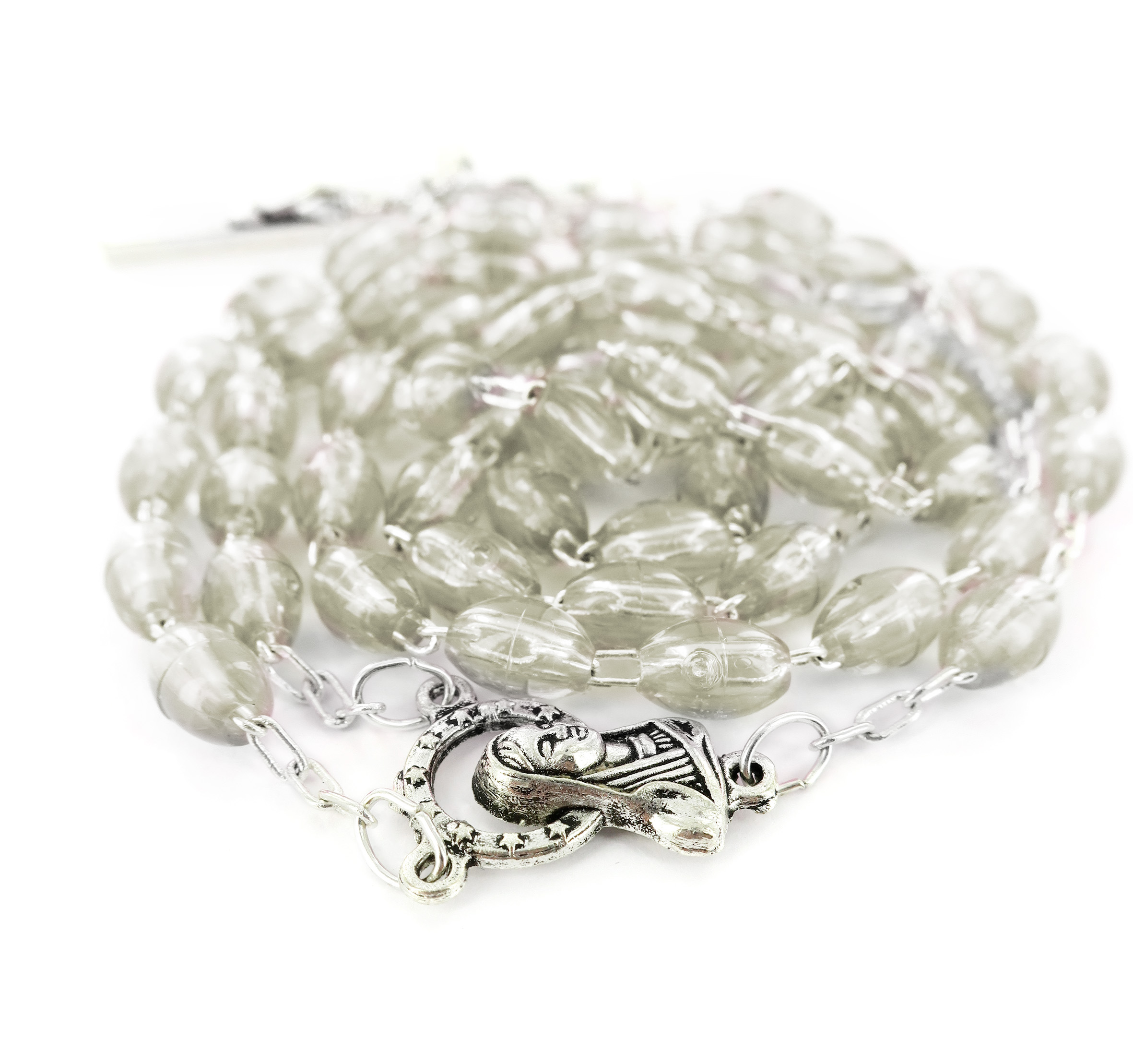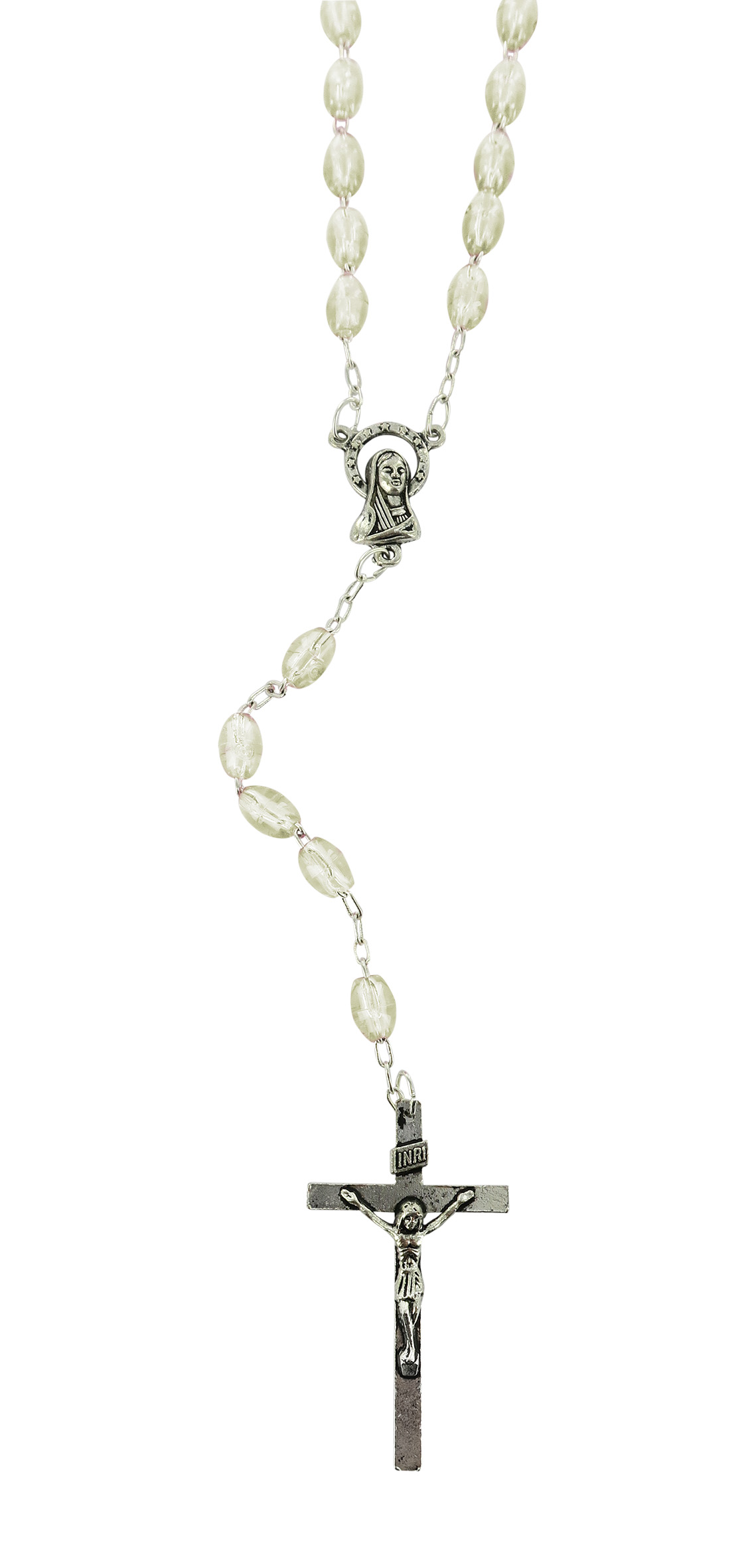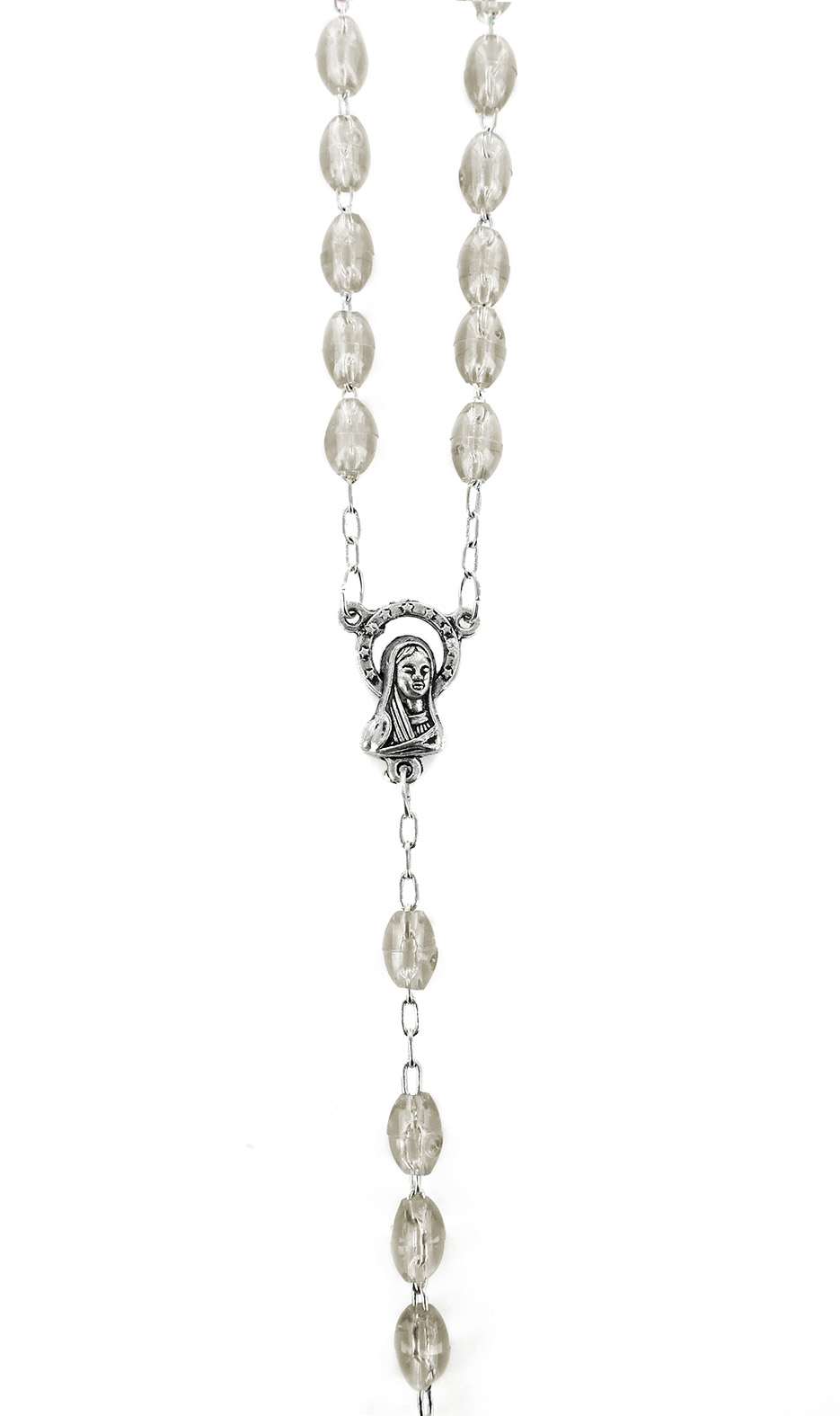 Rosario con legatura a macchina con grani ovali in plastica trasparente. Sulla Crociera è visibile da un lato l'immagine della Madonna e dall'altro l'immagine del Sacro cuore di Gesù. Il prodotto è completamente realizzato in Italia. Il Santo Rosario è stato l'oggetto delle più vigile attenzione e premurosa sollecitudine da parte di tutti i Pontefici, che hanno visto il Rosario come una preghiera contemplativa che è insieme di lode e di supplica, efficace nel promuovere la vita cristiana e l'impegno apostolico. Anche Paolo VI e Giovanni Paolo II più volte hanno rivolto ai cristiani un appello perchè fossero innalzate supplici preghiere alla Beata Vergine del Rosario, per implorare da Dio il bene supremo della pace e il risveglio della vita cristiana.