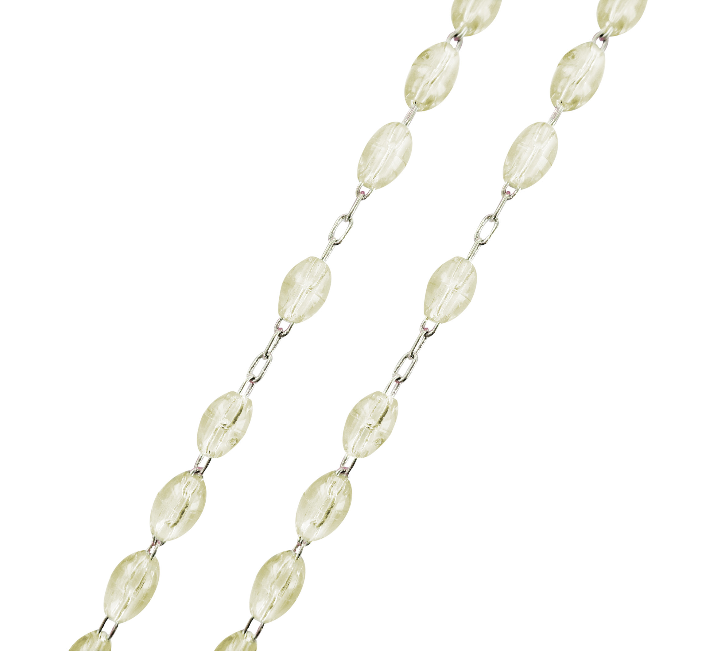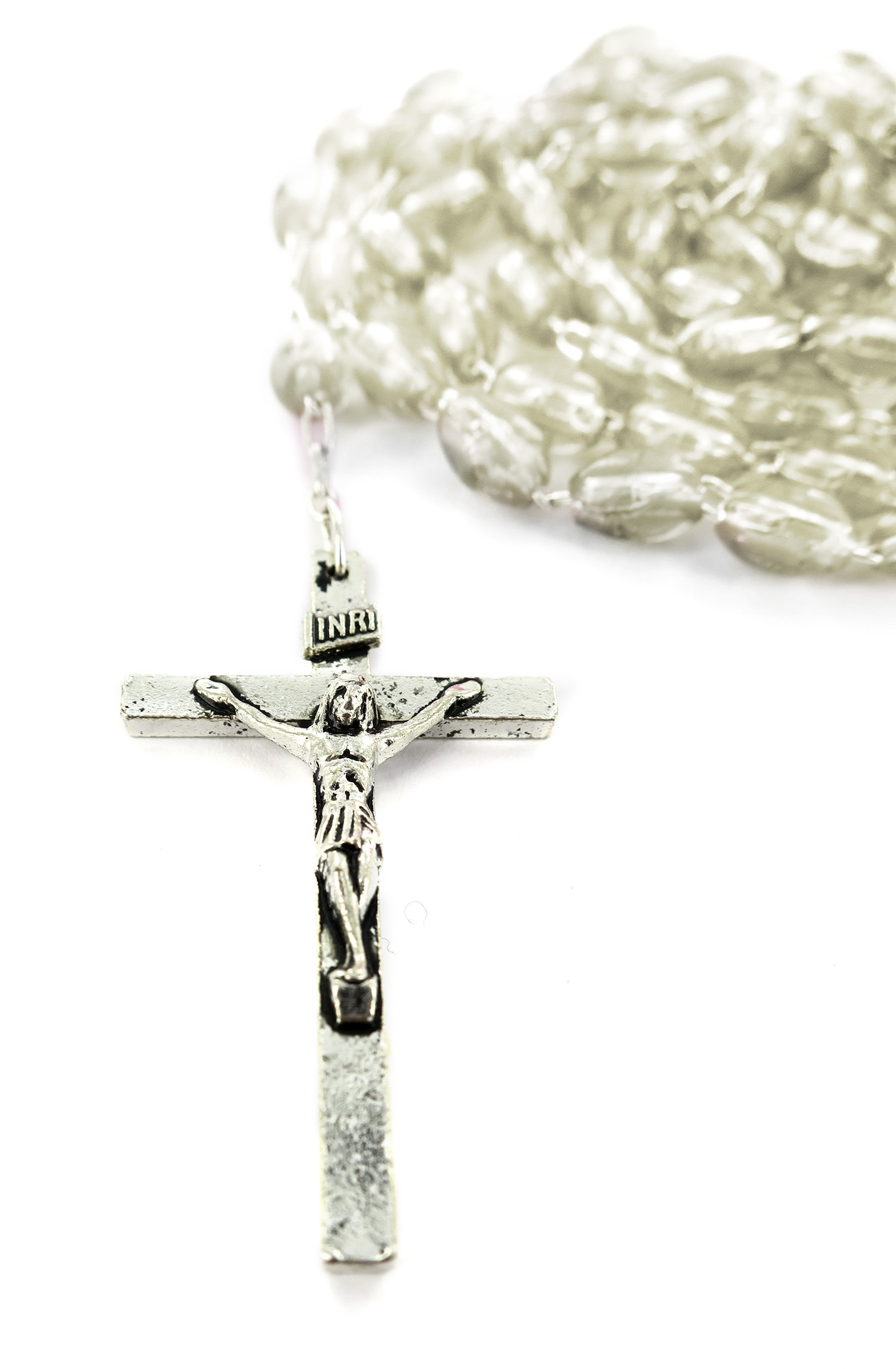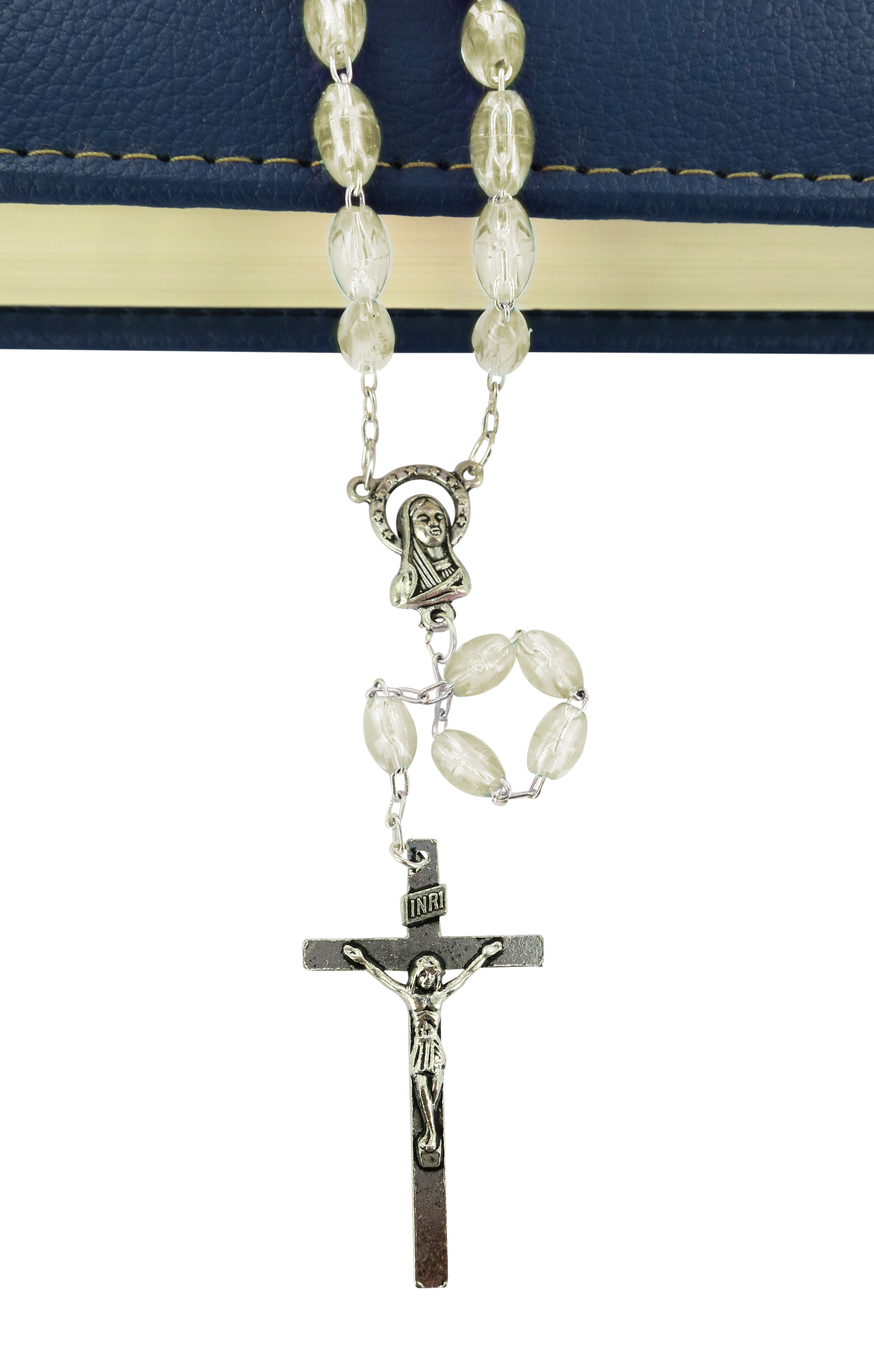 Rosario con legatura a macchina con grani ovali in plastica trasparente. Sulla Crociera è visibile da un lato l'immagine della Madonna e dall'altro l'immagine del Sacro cuore di Gesù. Il prodotto è completamente realizzato in Italia. Il Santo Rosario è stato l'oggetto delle più vigile attenzione e premurosa sollecitudine da parte di tutti i Pontefici, che hanno visto il Rosario come una preghiera contemplativa che è insieme di lode e di supplica, efficace nel promuovere la vita cristiana e l'impegno apostolico. Anche Paolo VI e Giovanni Paolo II più volte hanno rivolto ai cristiani un appello perchè fossero innalzate supplici preghiere alla Beata Vergine del Rosario, per implorare da Dio il bene supremo della pace e il risveglio della vita cristiana.