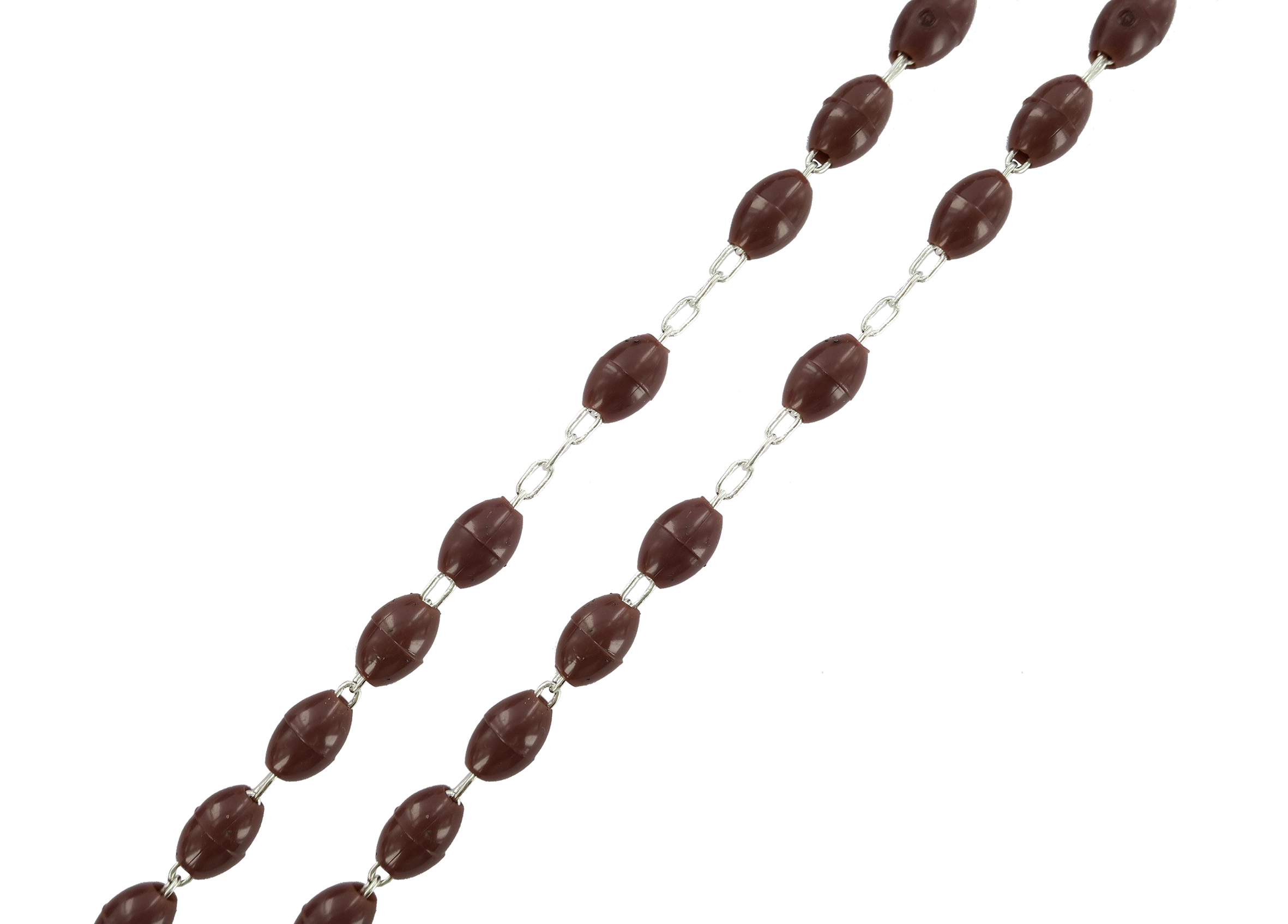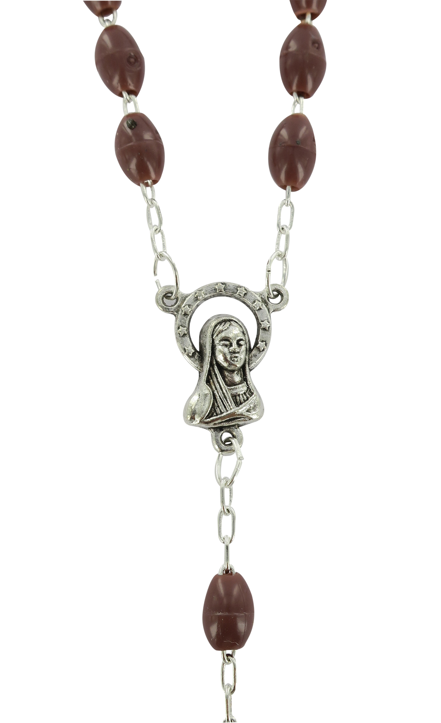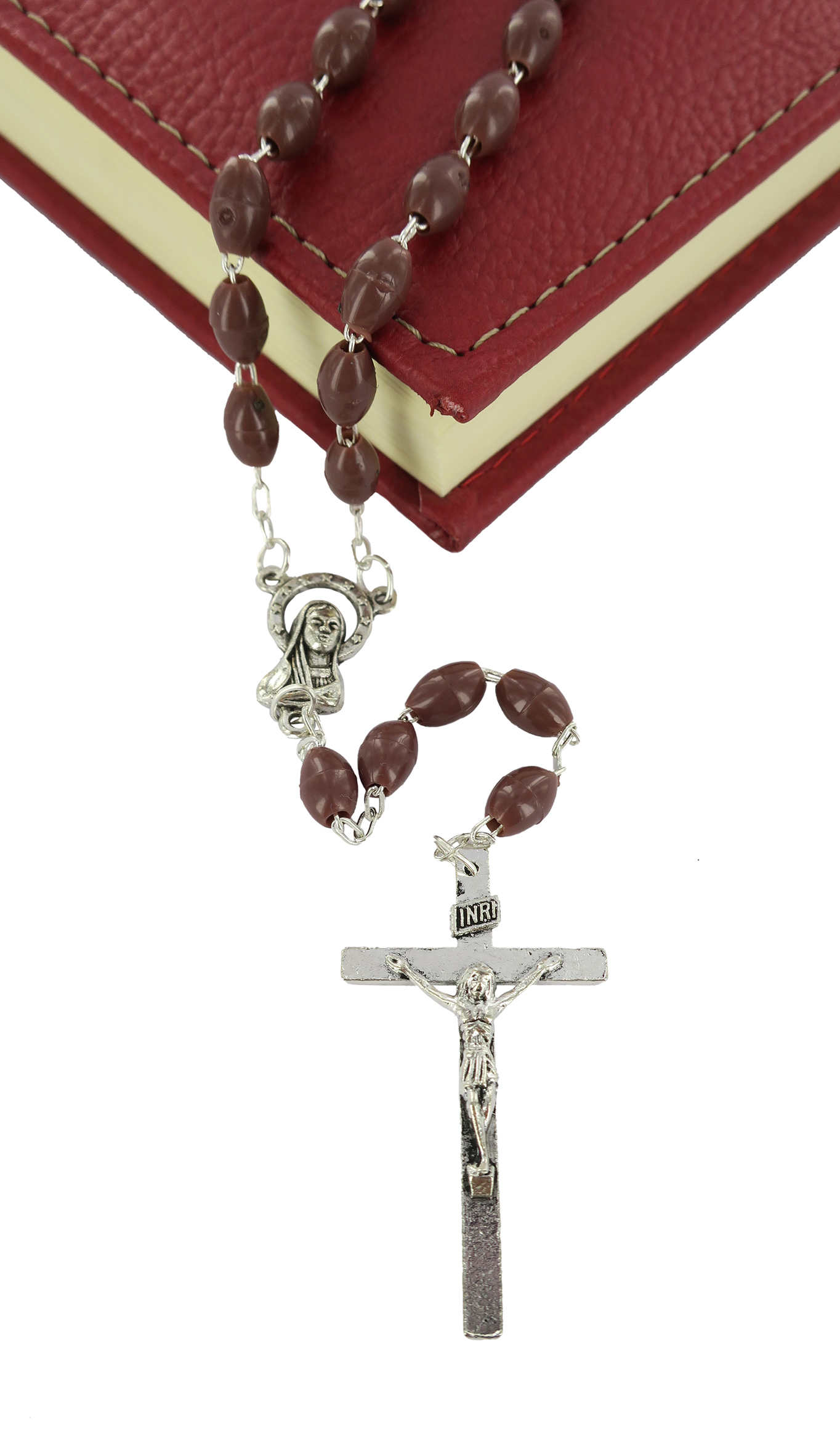 Rosario con legatura a macchina con grani ovali in plastica di colore marrone. Sulla Crociera è visibile da un lato l'immagine della Madonna e dall'altro l'immagine del Sacro cuore di Gesù. Il prodotto è completamente realizzato in Italia. Il Santo Rosario è stato l'oggetto delle più vigile attenzione e premurosa sollecitudine da parte di tutti i Pontefici, che hanno visto il Rosario come una preghiera contemplativa che è insieme di lode e di supplica, efficace nel promuovere la vita cristiana e l'impegno apostolico. Anche Paolo VI e Giovanni Paolo II più volte hanno rivolto ai cristiani un appello perchè fossero innalzate supplici preghiere alla Beata Vergine del Rosario, per implorare da Dio il bene supremo della pace e il risveglio della vita cristiana.