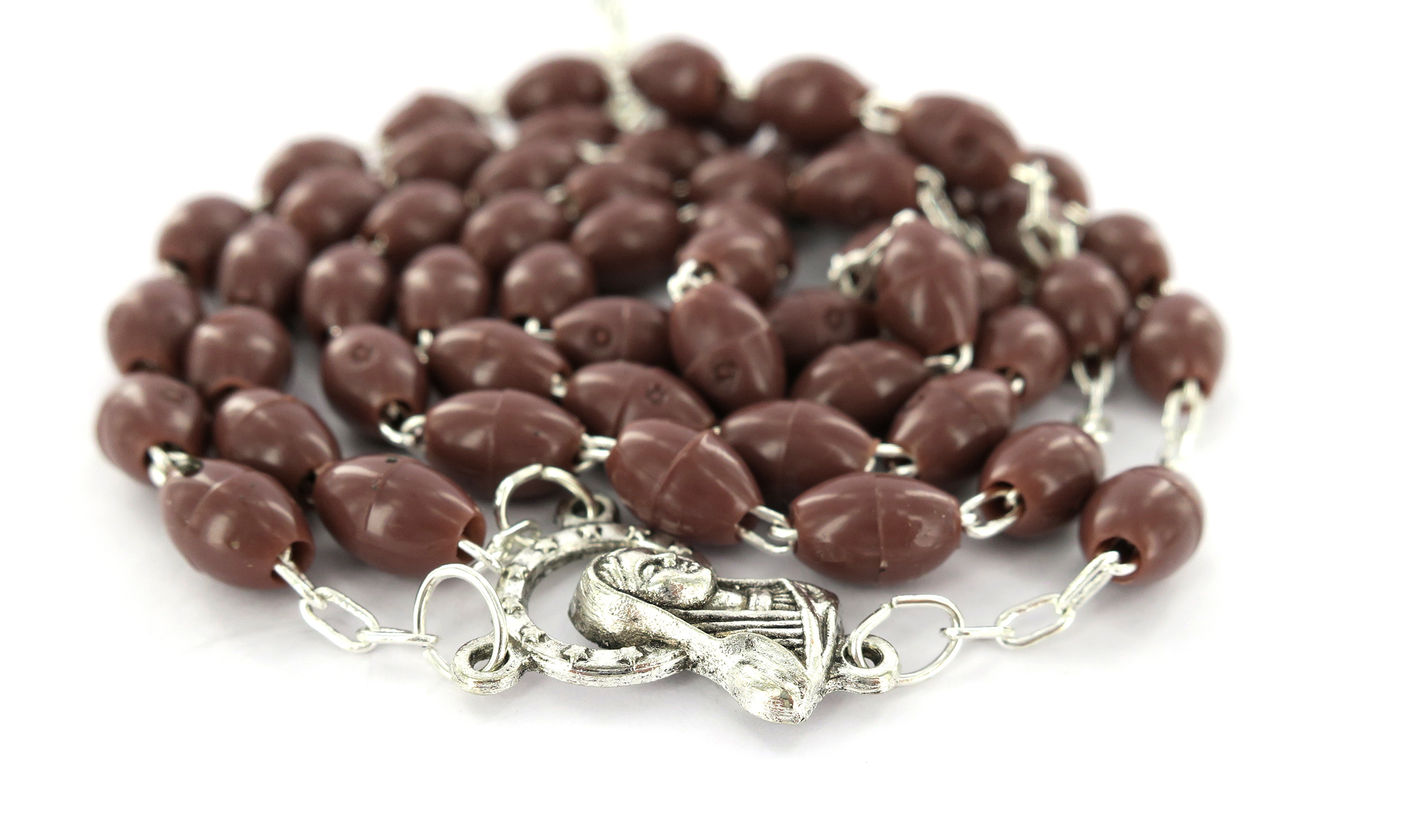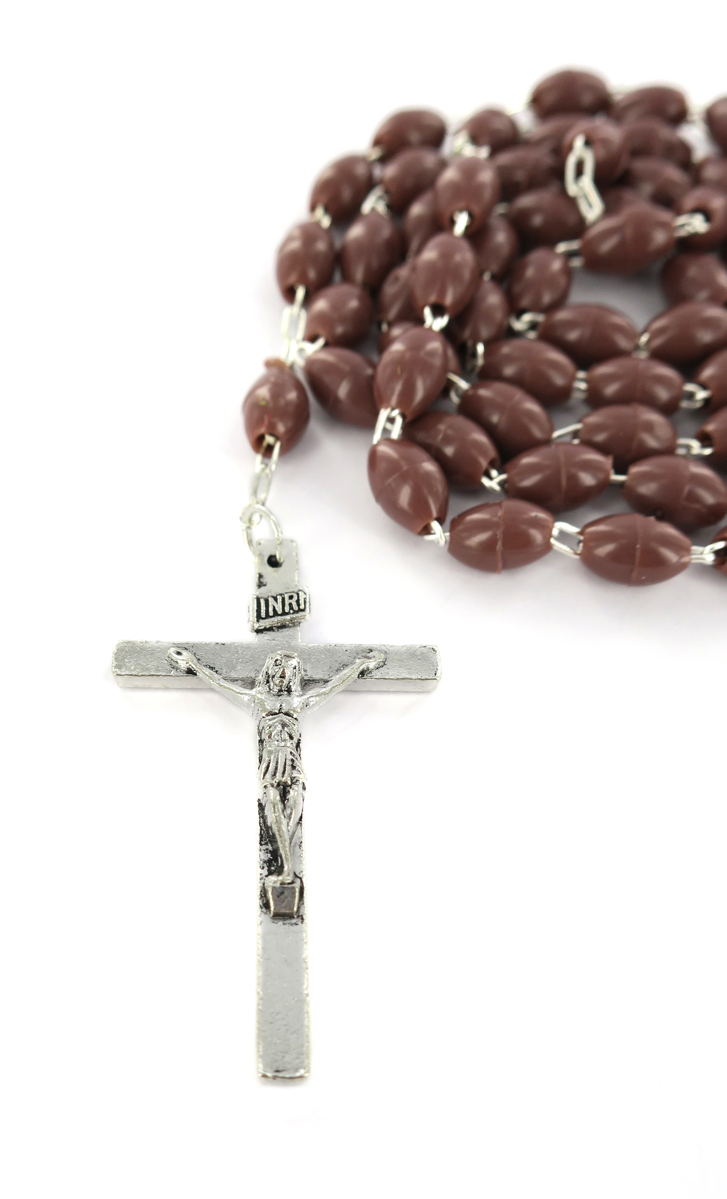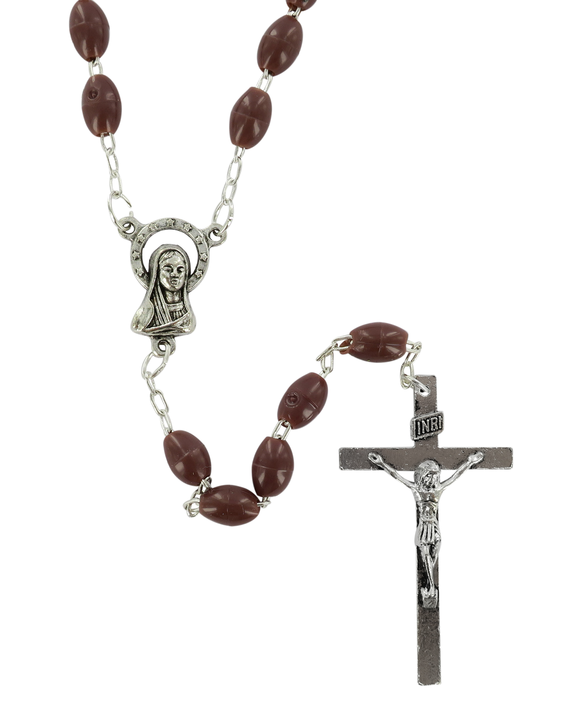 Rosario con legatura a macchina con grani ovali in plastica di colore marrone. Sulla Crociera è visibile da un lato l'immagine della Madonna e dall'altro l'immagine del Sacro cuore di Gesù. Il prodotto è completamente realizzato in Italia. Il Santo Rosario è stato l'oggetto delle più vigile attenzione e premurosa sollecitudine da parte di tutti i Pontefici, che hanno visto il Rosario come una preghiera contemplativa che è insieme di lode e di supplica, efficace nel promuovere la vita cristiana e l'impegno apostolico. Anche Paolo VI e Giovanni Paolo II più volte hanno rivolto ai cristiani un appello perchè fossero innalzate supplici preghiere alla Beata Vergine del Rosario, per implorare da Dio il bene supremo della pace e il risveglio della vita cristiana.