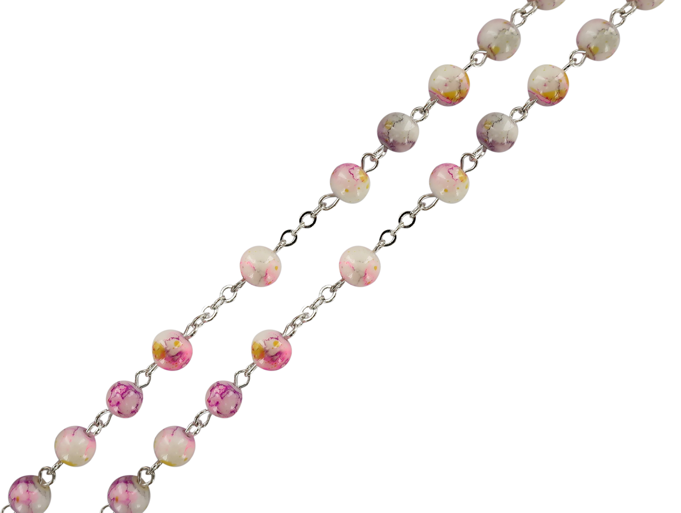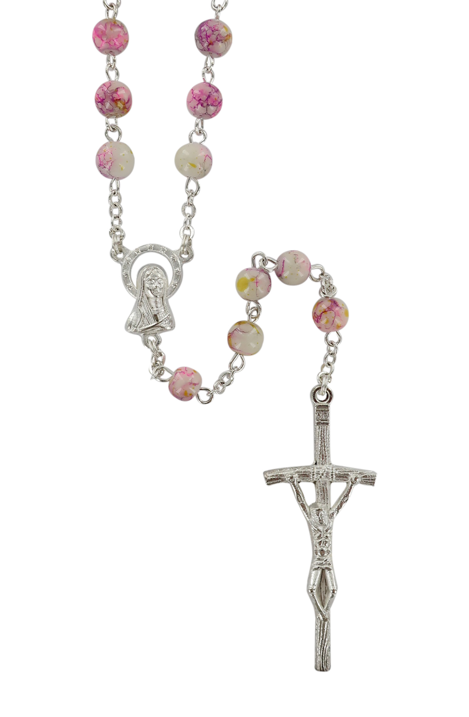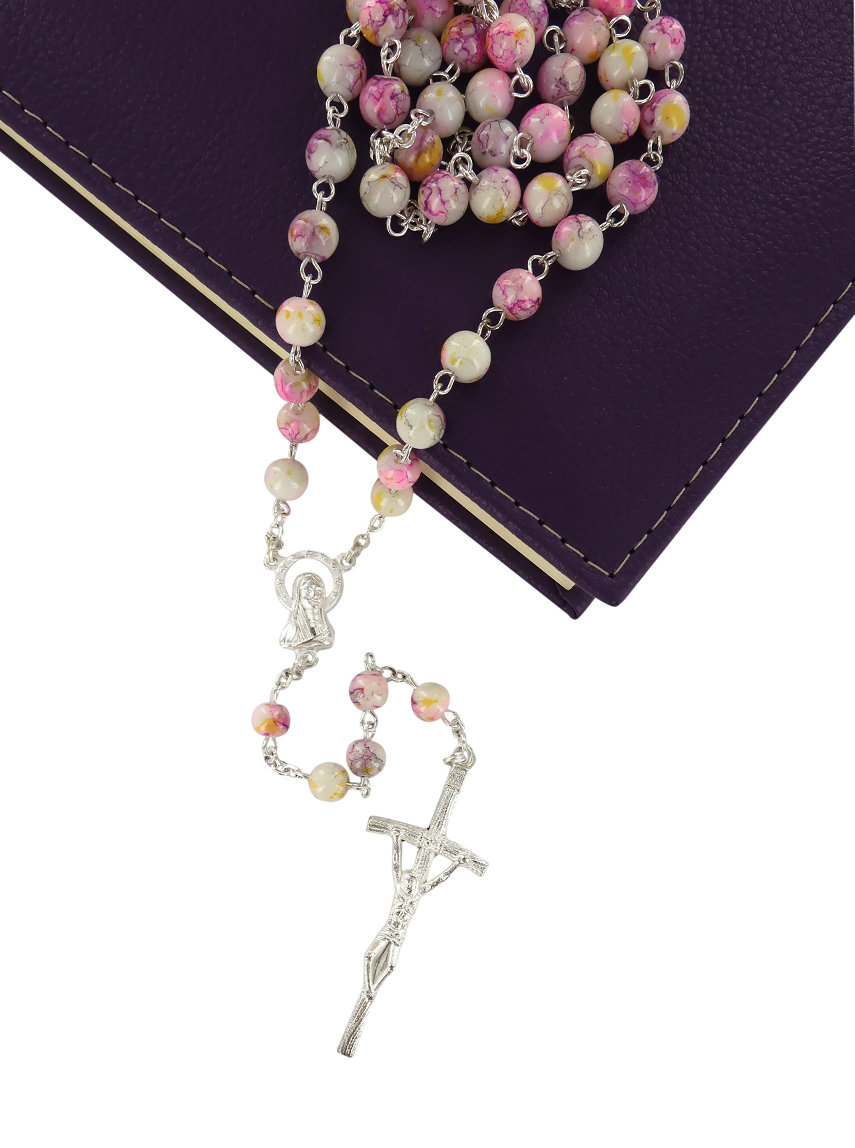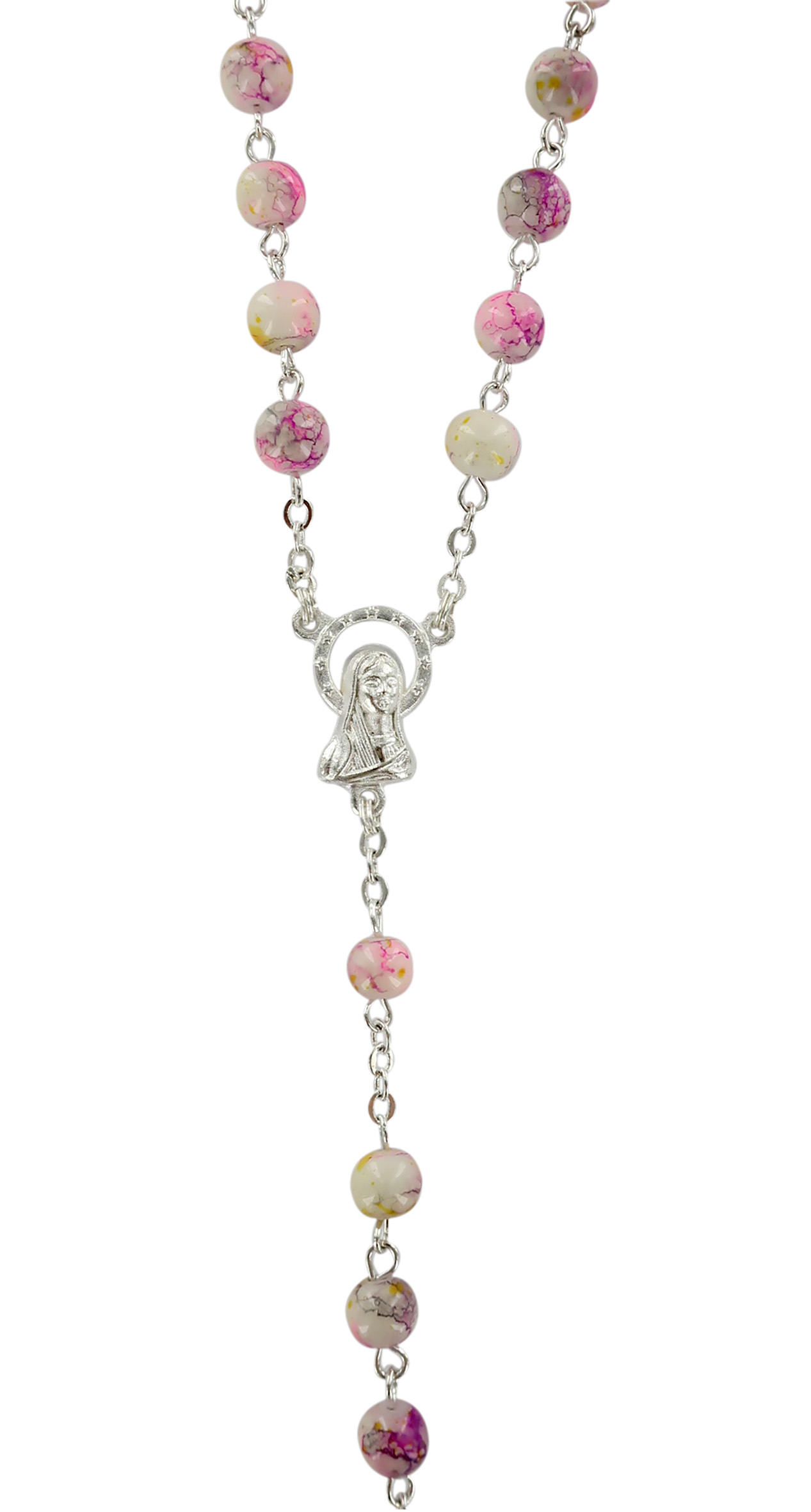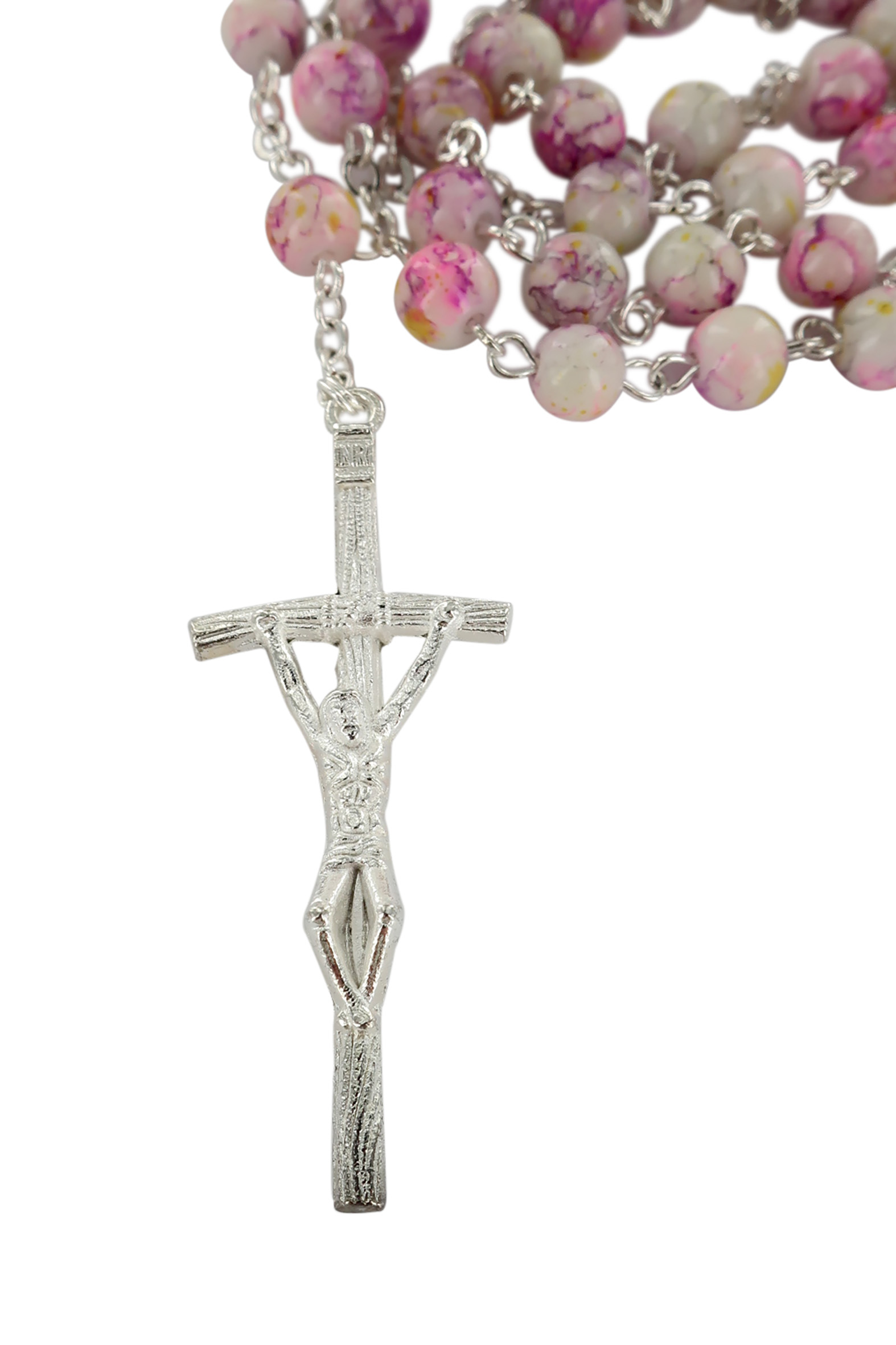 Il rosario si presenta con grani mm 6 in plastica multicolore con crociette stampate su ogni grano, il tutto rilegato a mano con filo in metallo argentato. Croce con Cristo riportato e crociera con il Volto di Maria.