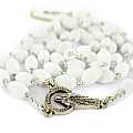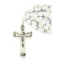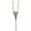 Rosario con legatura a macchina con grani ovali in plastica di colore bianco. Sulla Crociera è visibile l'immagine della Madonna di Lourdes. Il prodotto è completamente realizzato in Italia. Il Santo Rosario è stato l'oggetto delle più vigile attenzione e premurosa sollecitudine da parte di tutti i Pontefici, che hanno visto il Rosario come una preghiera contemplativa che è insieme di lode e di supplica, efficace nel promuovere la vita cristiana e l'impegno apostolico. Anche Paolo VI e Giovanni Paolo II più volte hanno rivolto ai cristiani un appello perchè fossero innalzate supplici preghiere alla Beata Vergine del Rosario, per implorare da Dio il bene supremo della pace e il risveglio della vita cristiana.