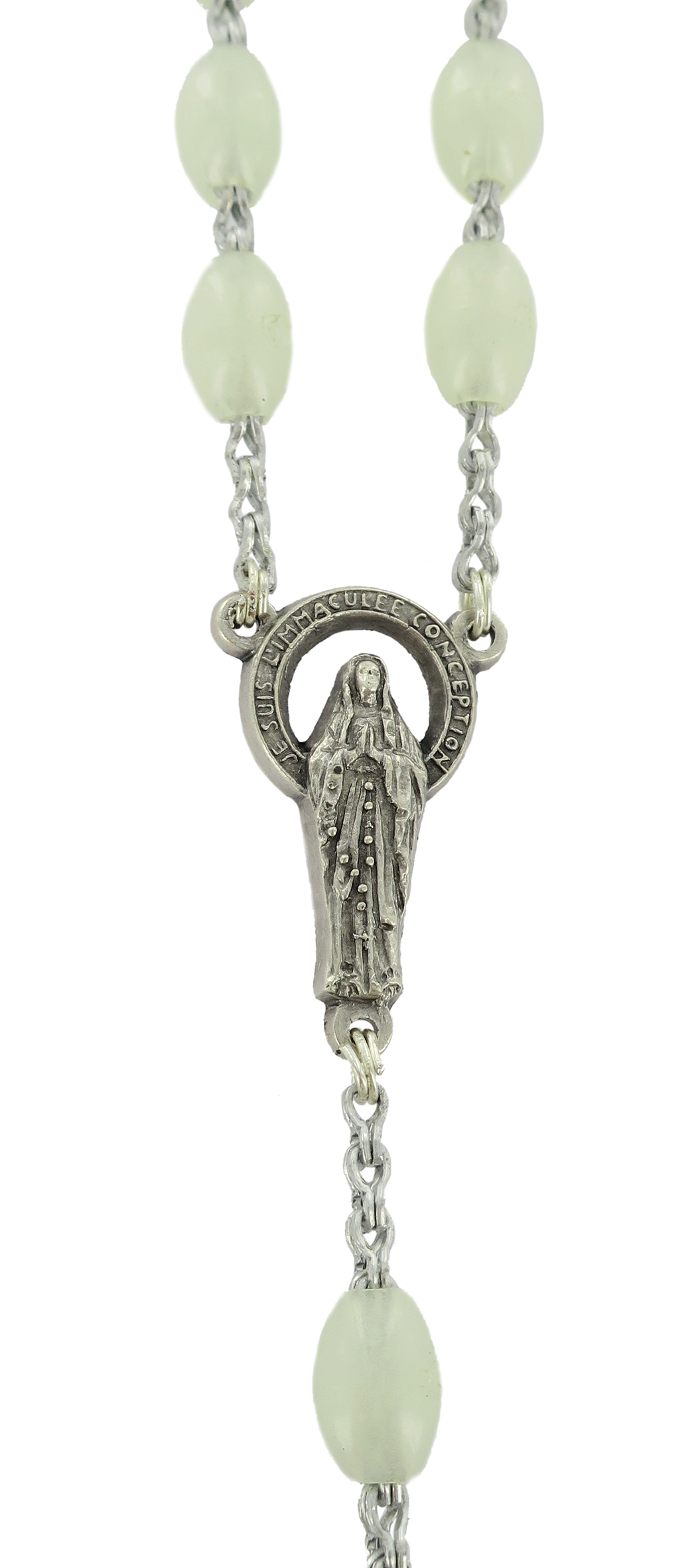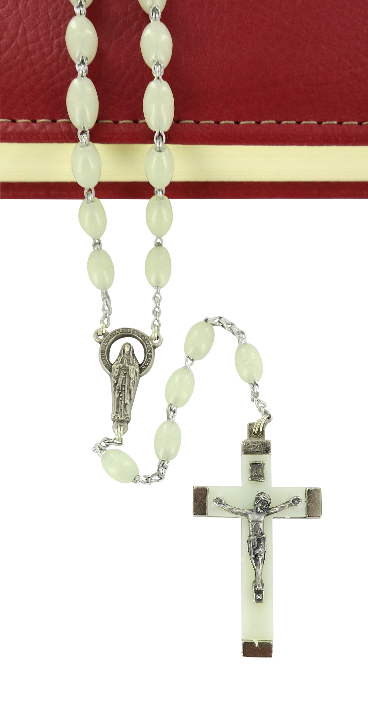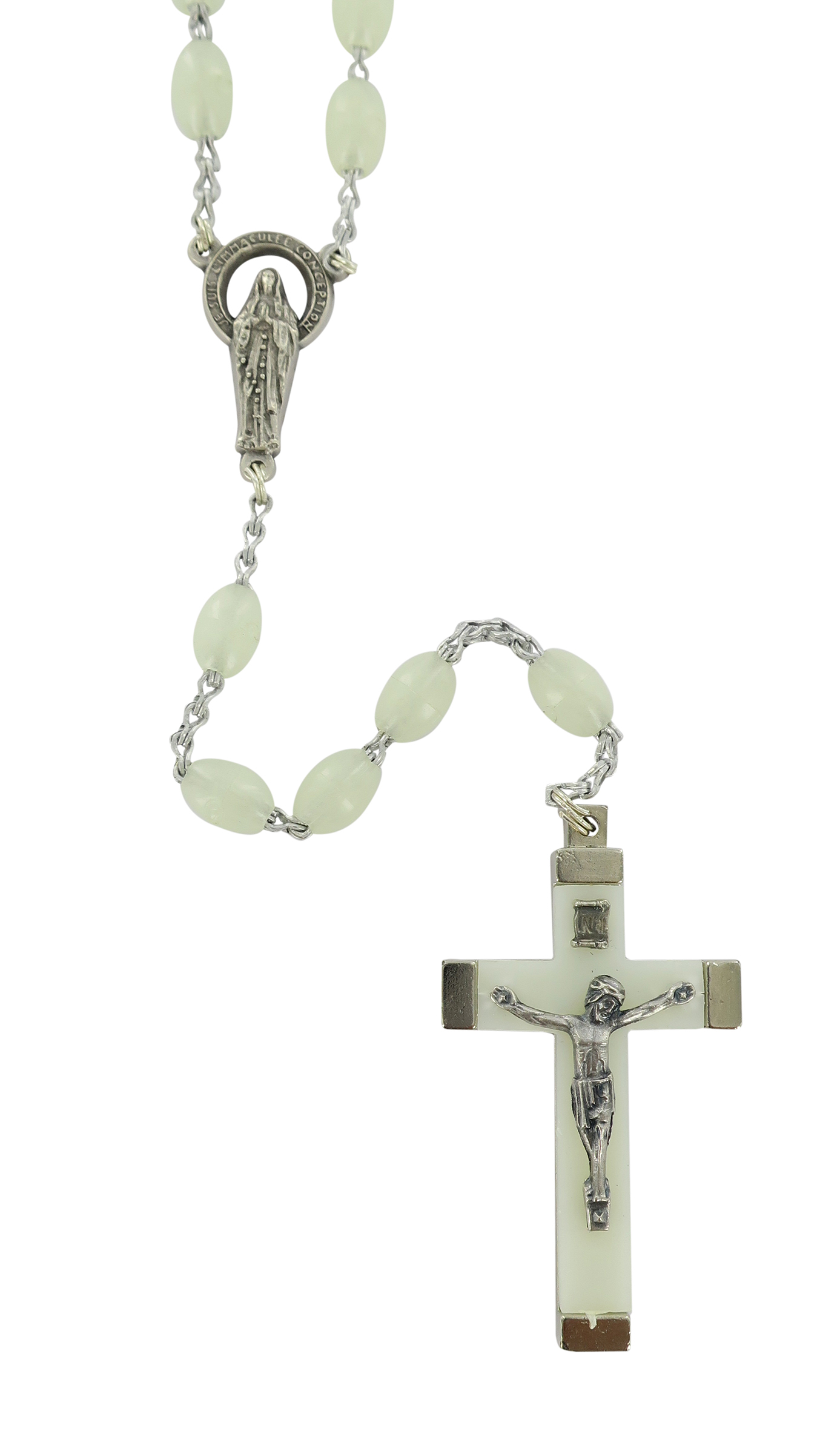 Rosario con legatura a macchina con grani ovali in plastica fosforescente. Sulla Crociera è visibile l'immagine della Madonna di Lourdes. Il prodotto è completamente realizzato in Italia. Il Santo Rosario è stato l'oggetto delle più vigile attenzione e premurosa sollecitudine da parte di tutti i Pontefici, che hanno visto il Rosario come una preghiera contemplativa che è insieme di lode e di supplica, efficace nel promuovere la vita cristiana e l'impegno apostolico. Anche Paolo VI e Giovanni Paolo II più volte hanno rivolto ai cristiani un appello perchè fossero innalzate supplici preghiere alla Beata Vergine del Rosario, per implorare da Dio il bene supremo della pace e il risveglio della vita cristiana.