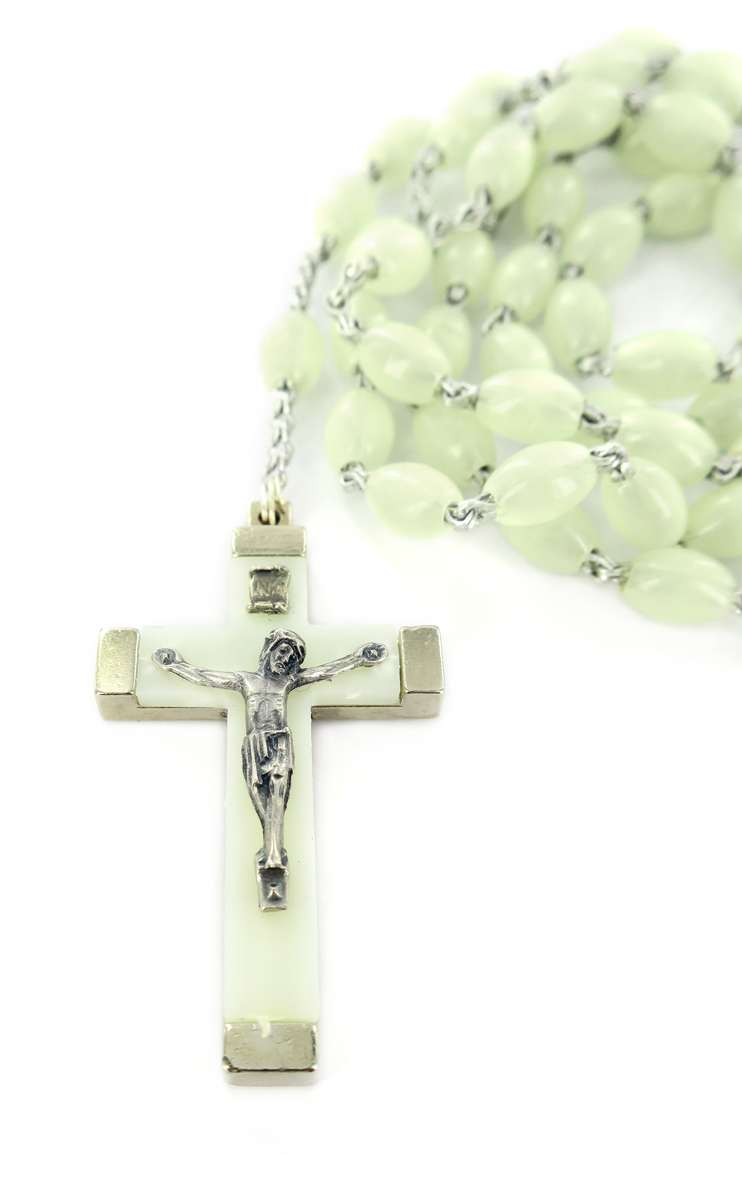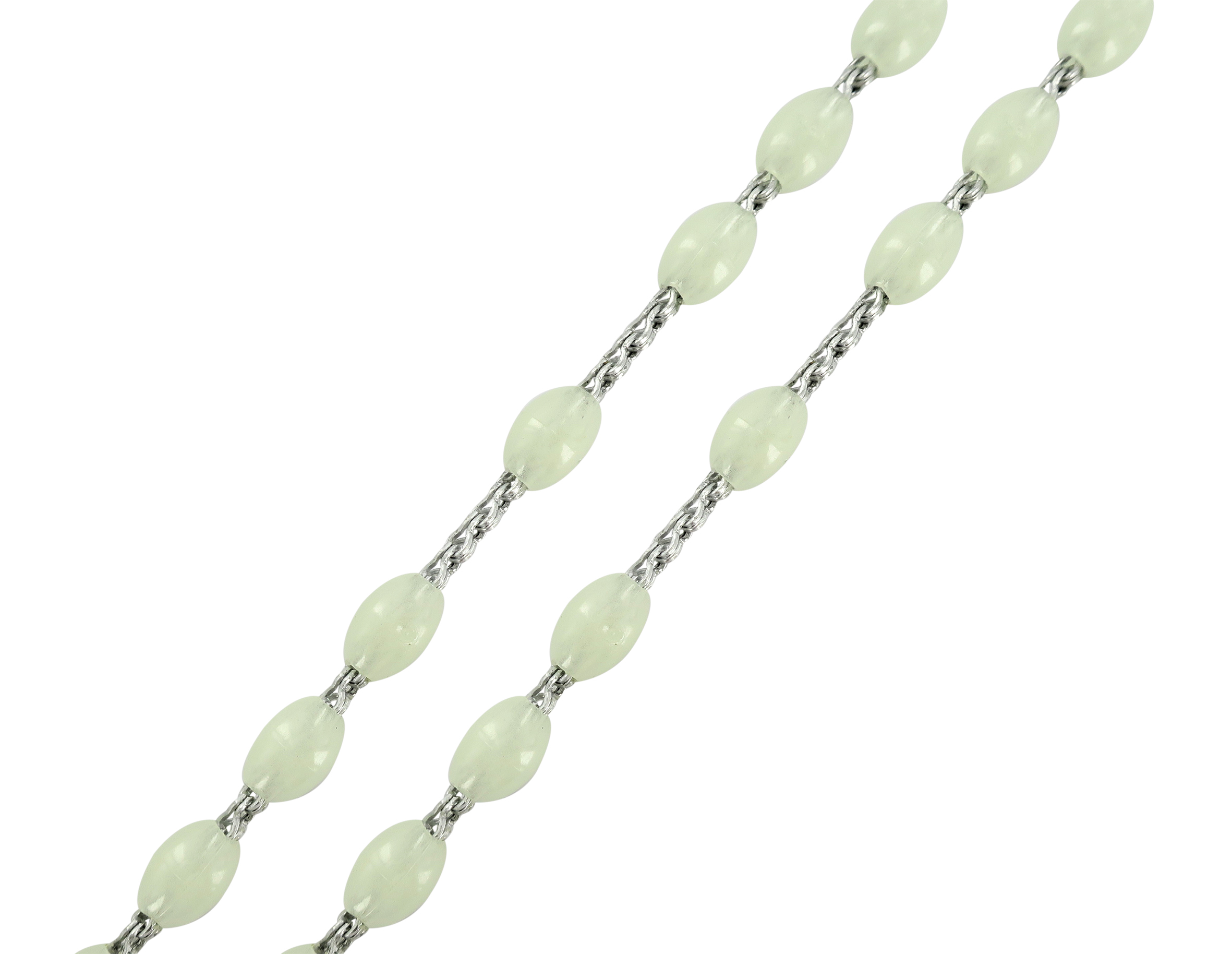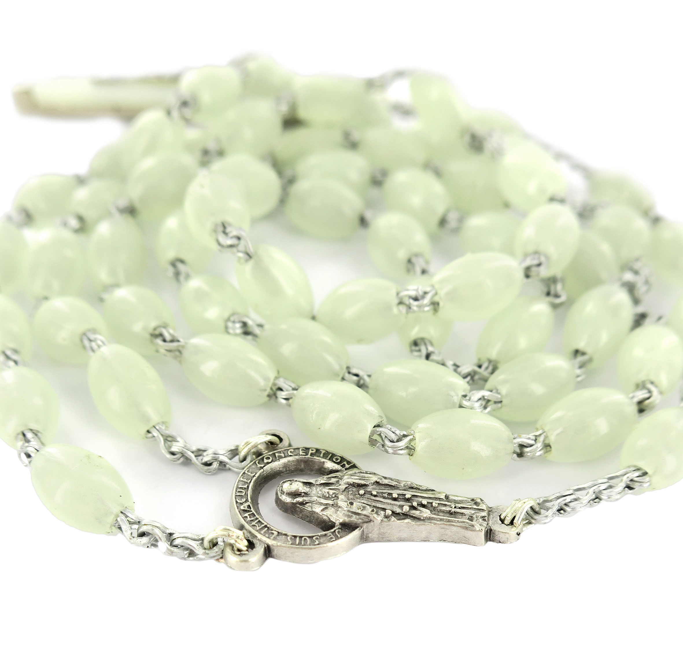 Rosario con legatura a macchina con grani ovali in plastica fosforescente. Sulla Crociera è visibile l'immagine della Madonna di Lourdes. Il prodotto è completamente realizzato in Italia. Il Santo Rosario è stato l'oggetto delle più vigile attenzione e premurosa sollecitudine da parte di tutti i Pontefici, che hanno visto il Rosario come una preghiera contemplativa che è insieme di lode e di supplica, efficace nel promuovere la vita cristiana e l'impegno apostolico. Anche Paolo VI e Giovanni Paolo II più volte hanno rivolto ai cristiani un appello perchè fossero innalzate supplici preghiere alla Beata Vergine del Rosario, per implorare da Dio il bene supremo della pace e il risveglio della vita cristiana.
