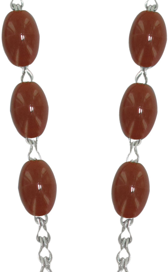 Rosario con legatura a macchina con grani ovali in plastica di colore marrone. Sulla Crociera è visibile l'immagine della Madonna di Lourdes. Il prodotto è completamente realizzato in Italia. Il Santo Rosario è stato l'oggetto delle più vigile attenzione e premurosa sollecitudine da parte di tutti i Pontefici, che hanno visto il Rosario come una preghiera contemplativa che è insieme di lode e di supplica, efficace nel promuovere la vita cristiana e l'impegno apostolico. Anche Paolo VI e Giovanni Paolo II più volte hanno rivolto ai cristiani un appello perchè fossero innalzate supplici preghiere alla Beata Vergine del Rosario, per implorare da Dio il bene supremo della pace e il risveglio della vita cristiana.