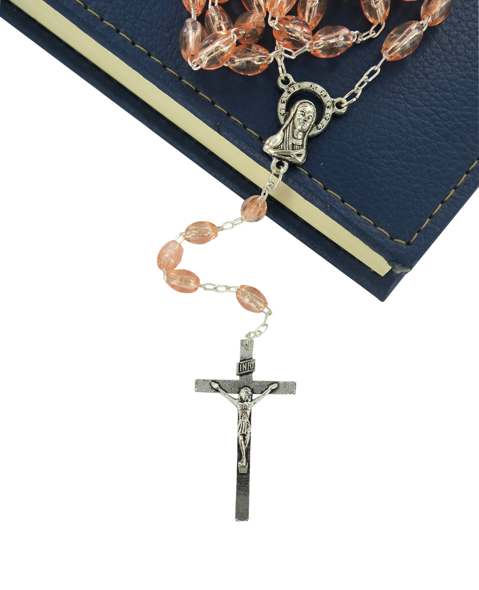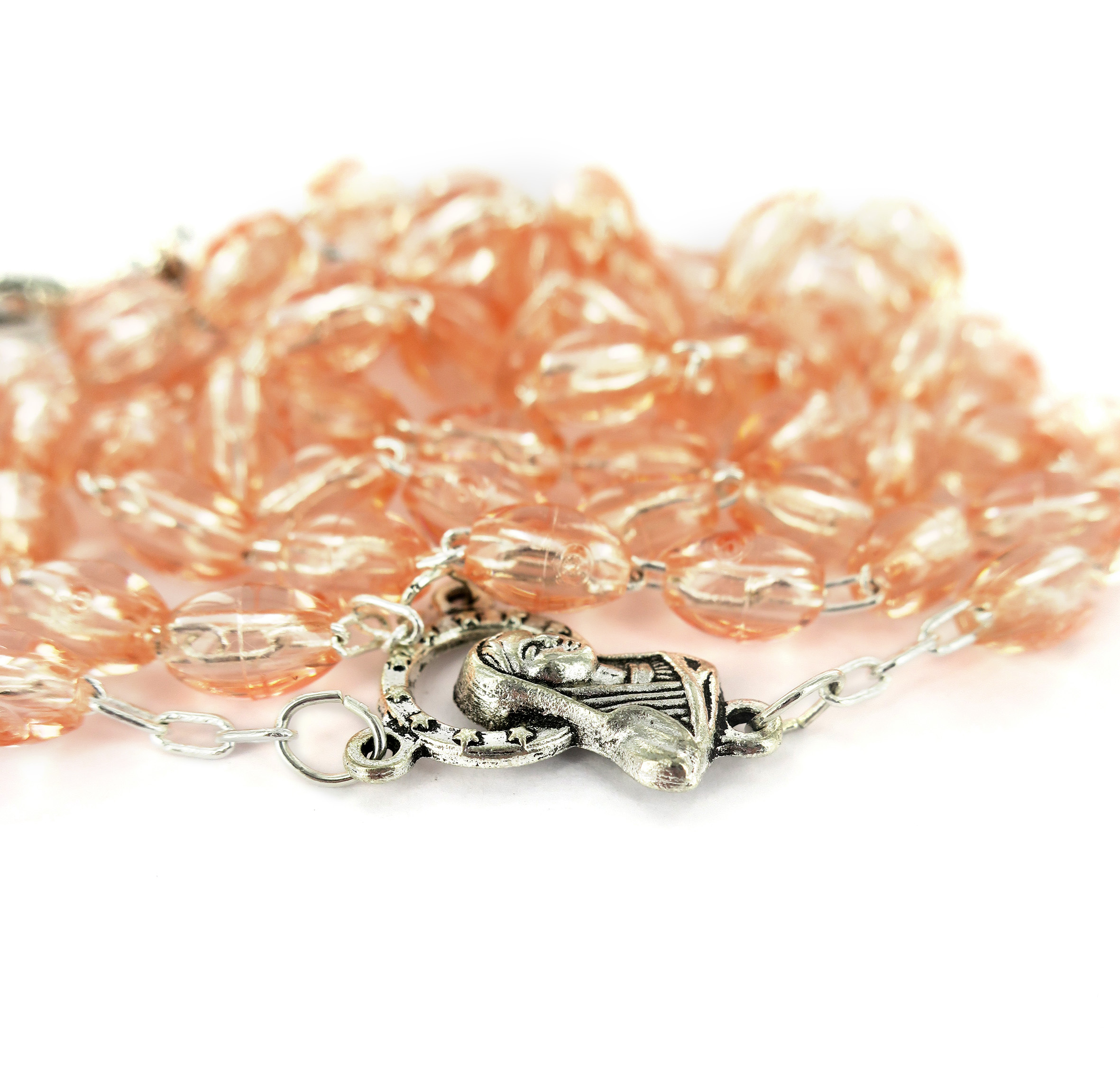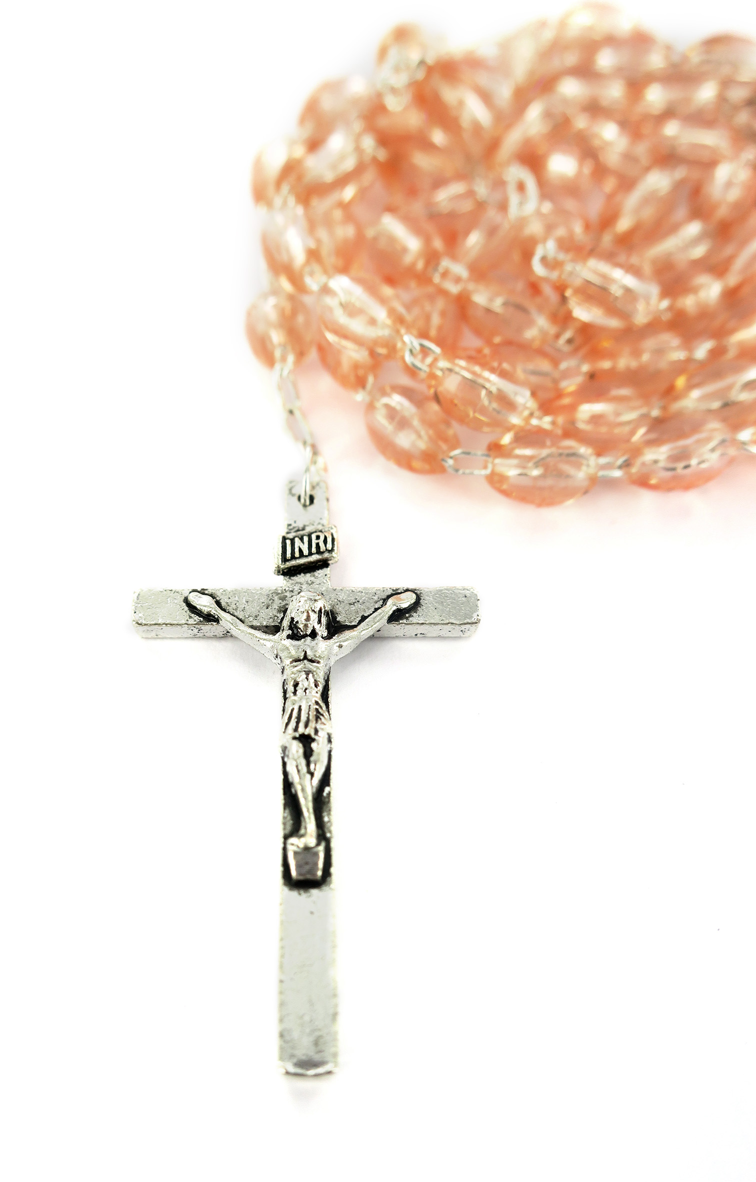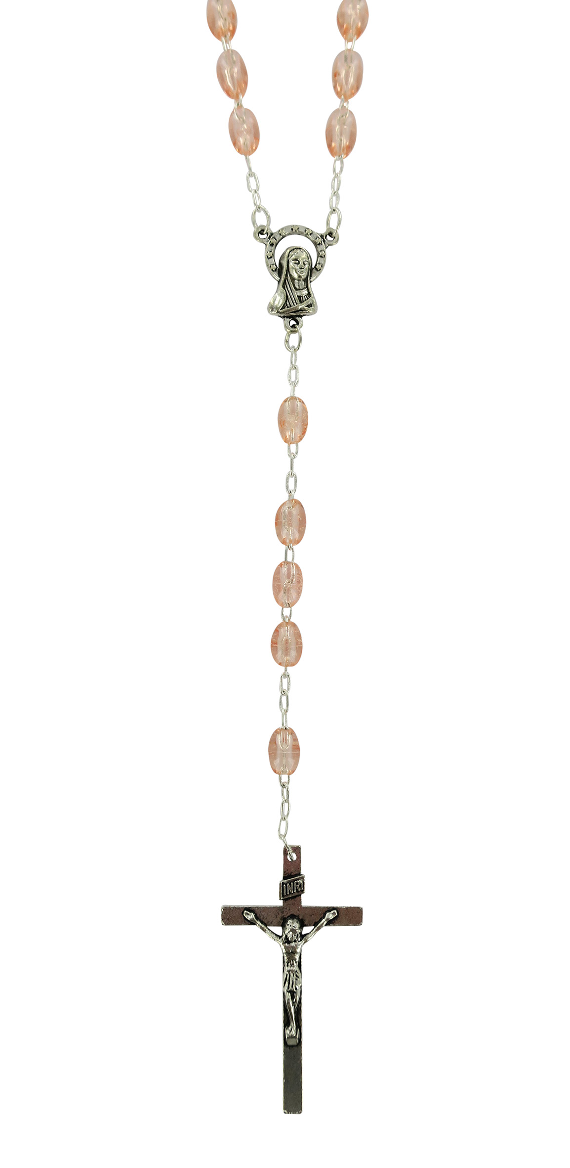 STOCK:Rosario in plastica ovale rosa trasparente con legatura a macchina