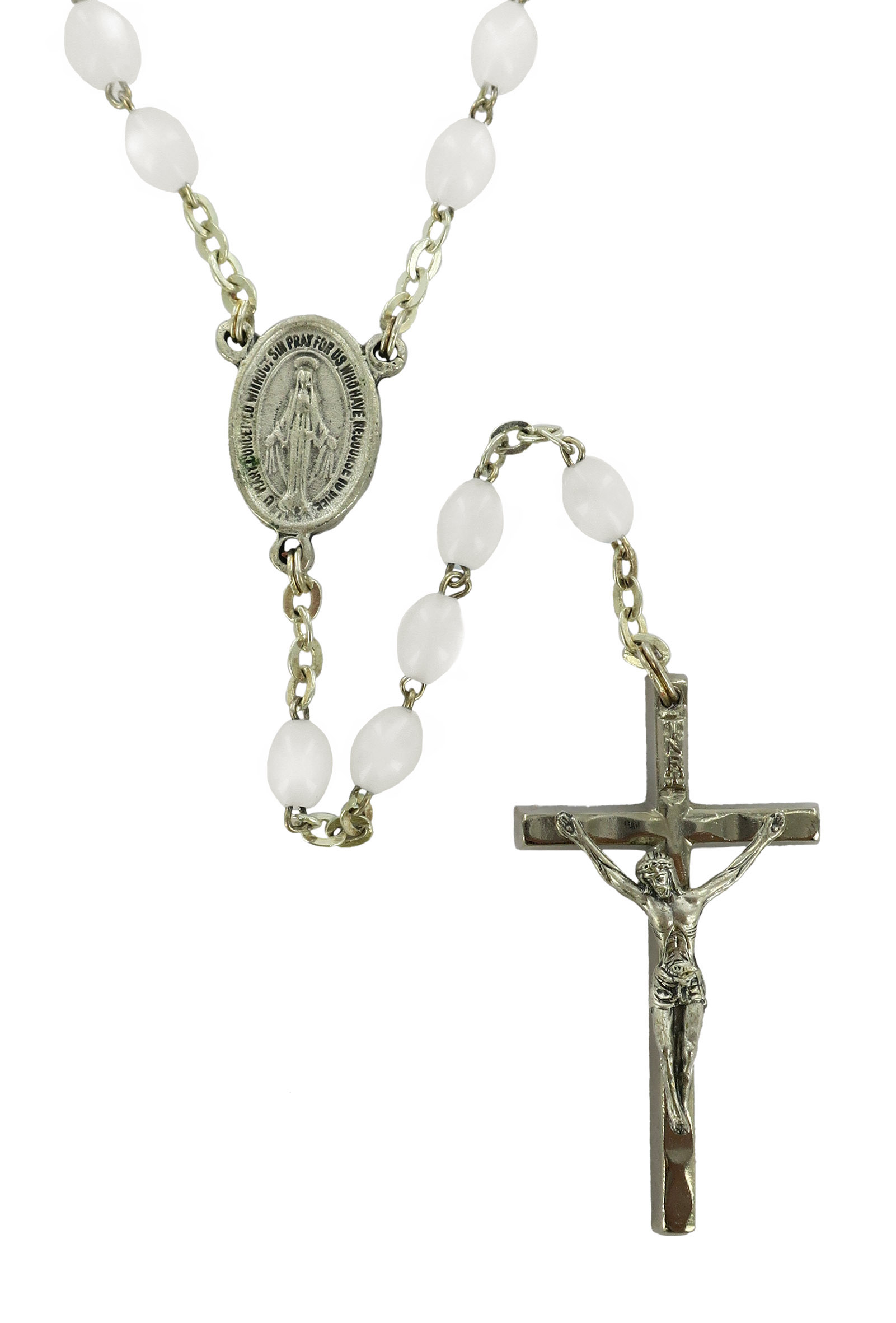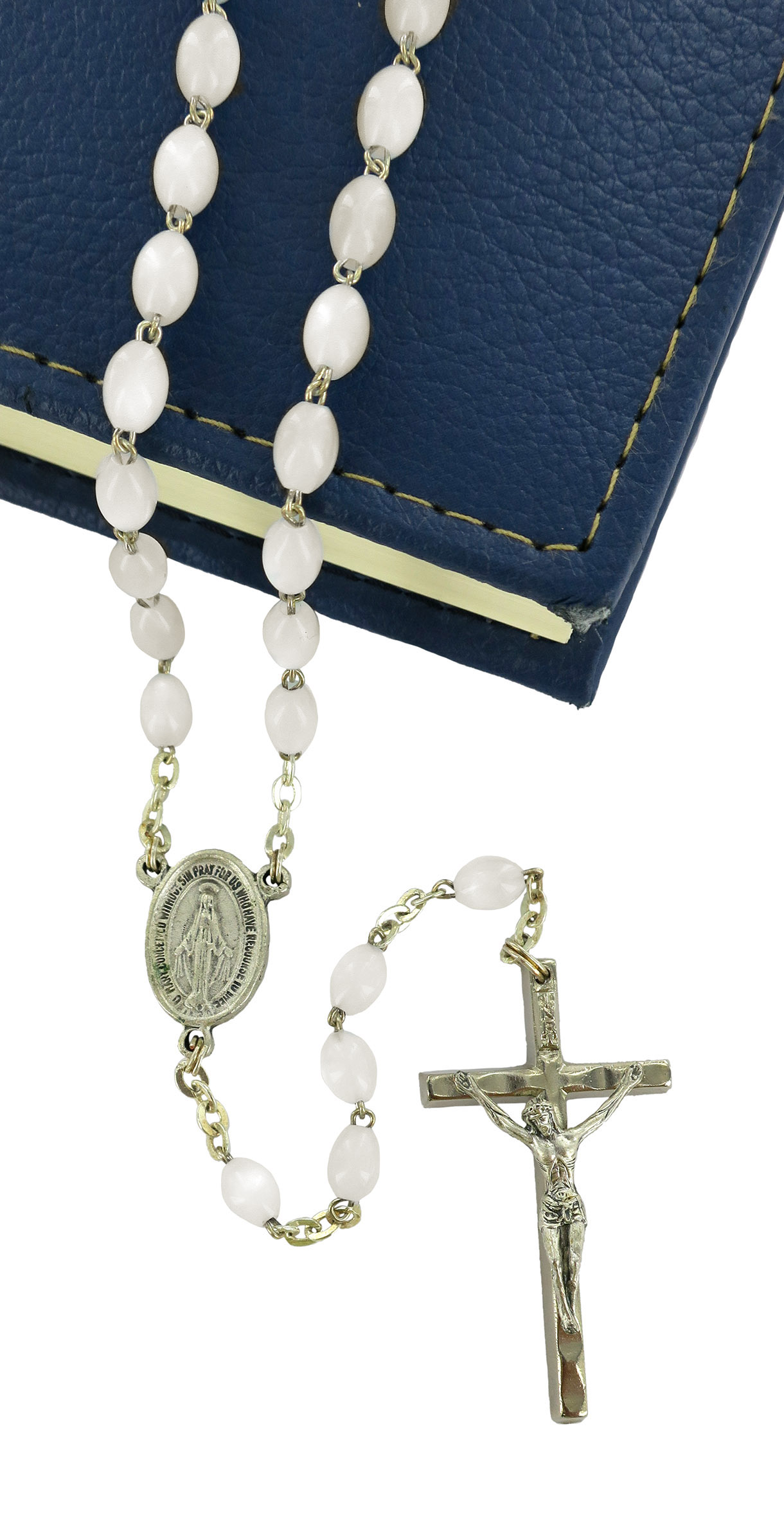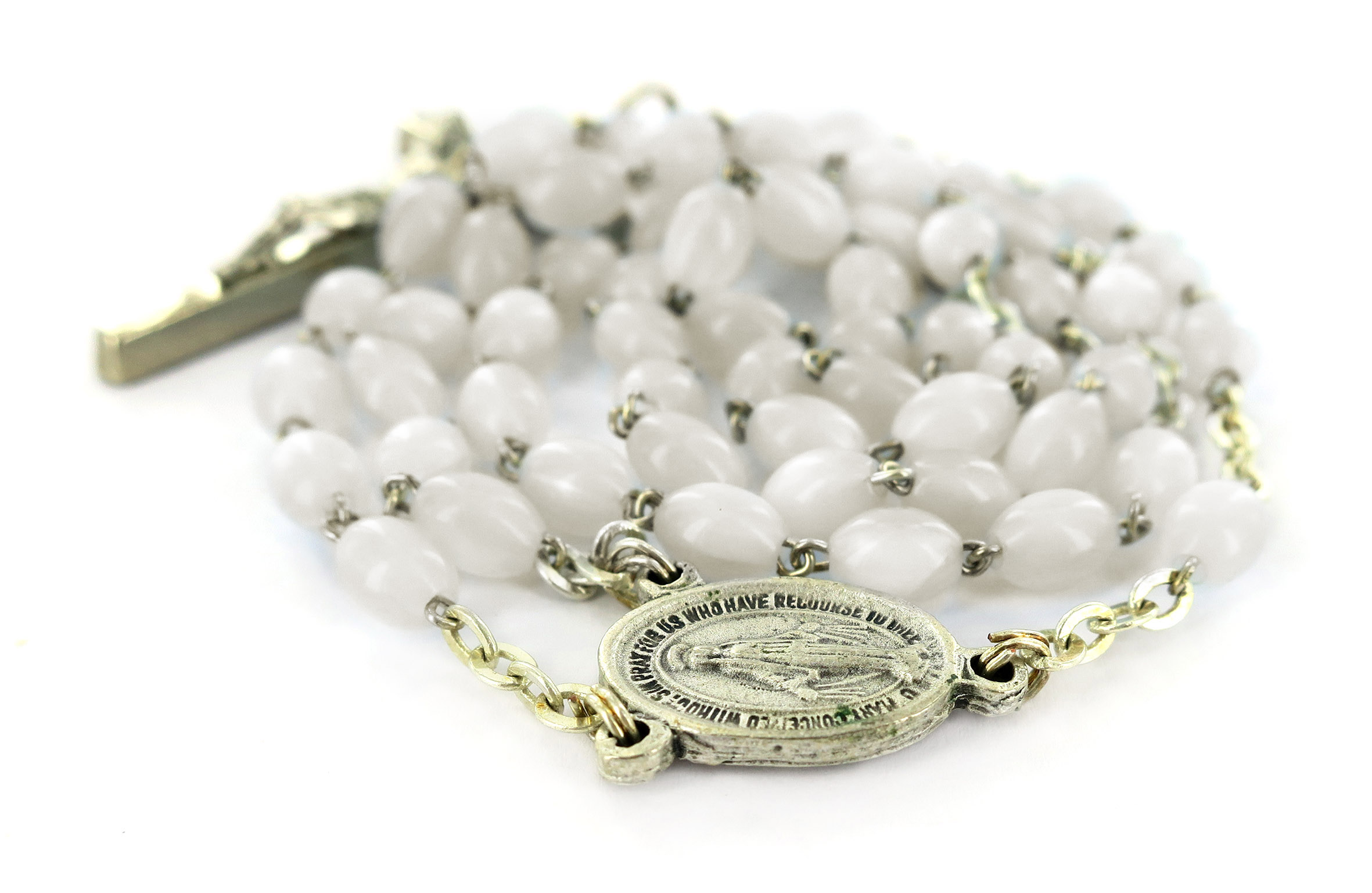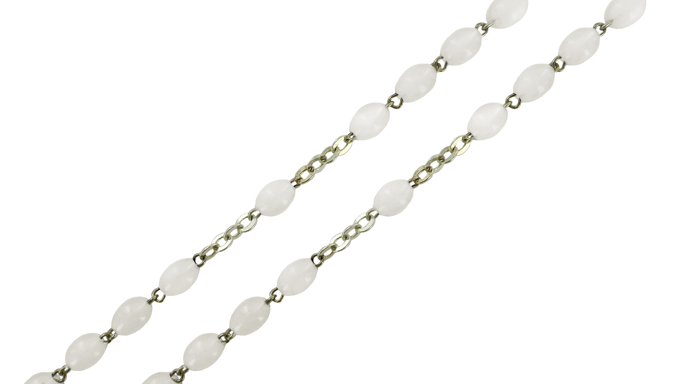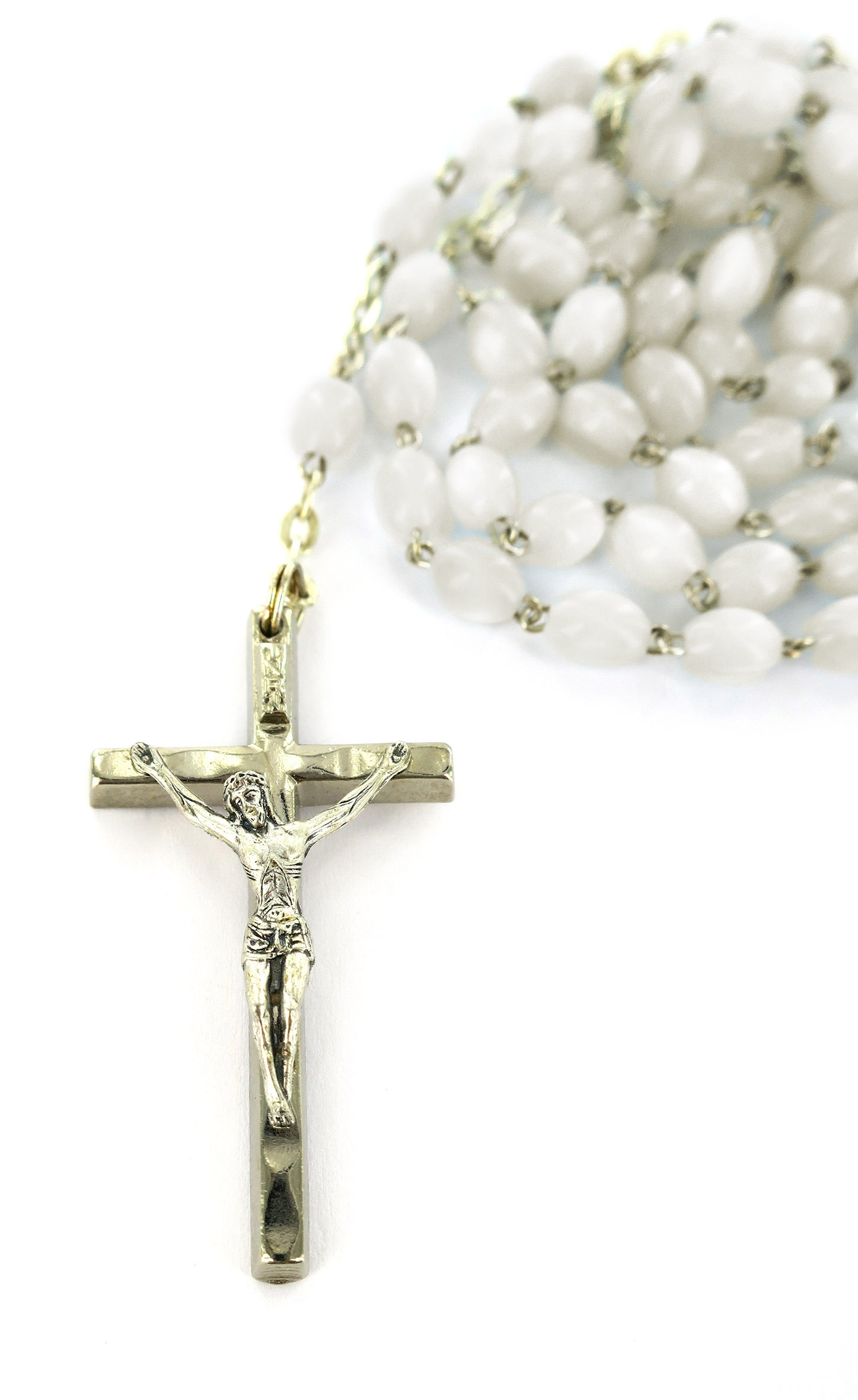 Rosario imitazione madreperla mm. 4 con legatura in ottone argentato - bianco
