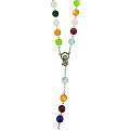 Rosario imitazione madreperla realizzato con grani tondi multicolori da mm 10 e rilegato in metallo argentato.