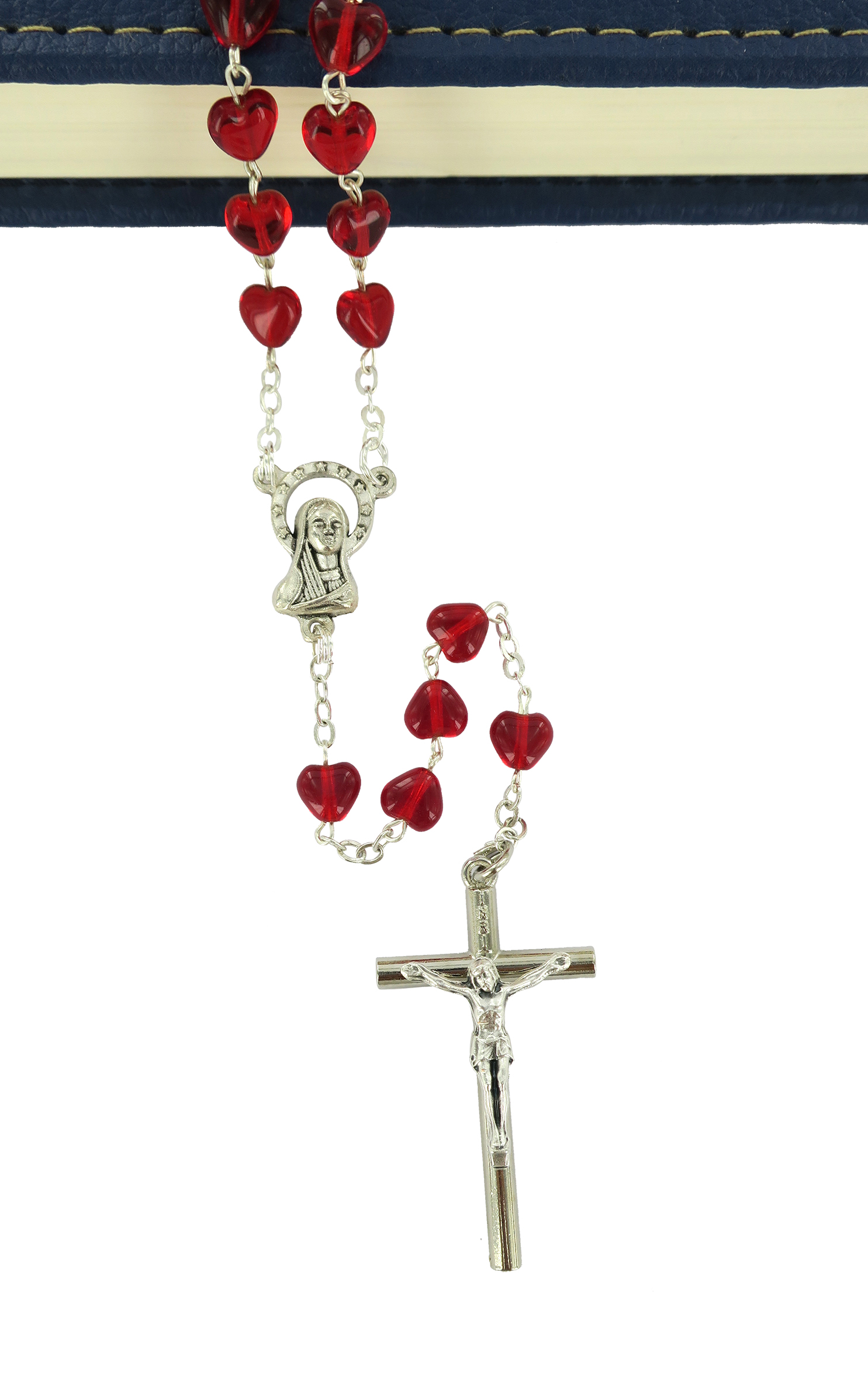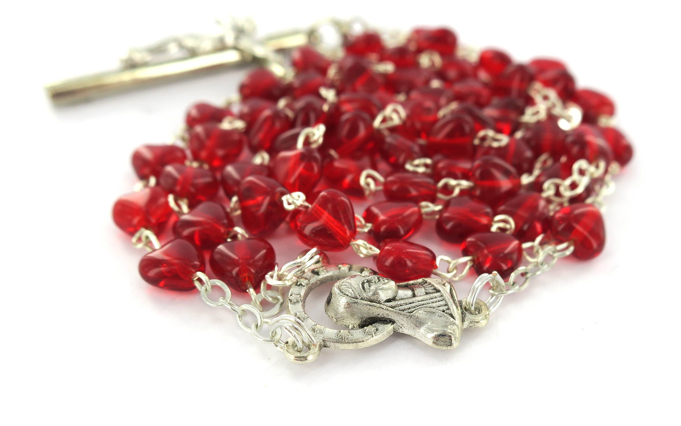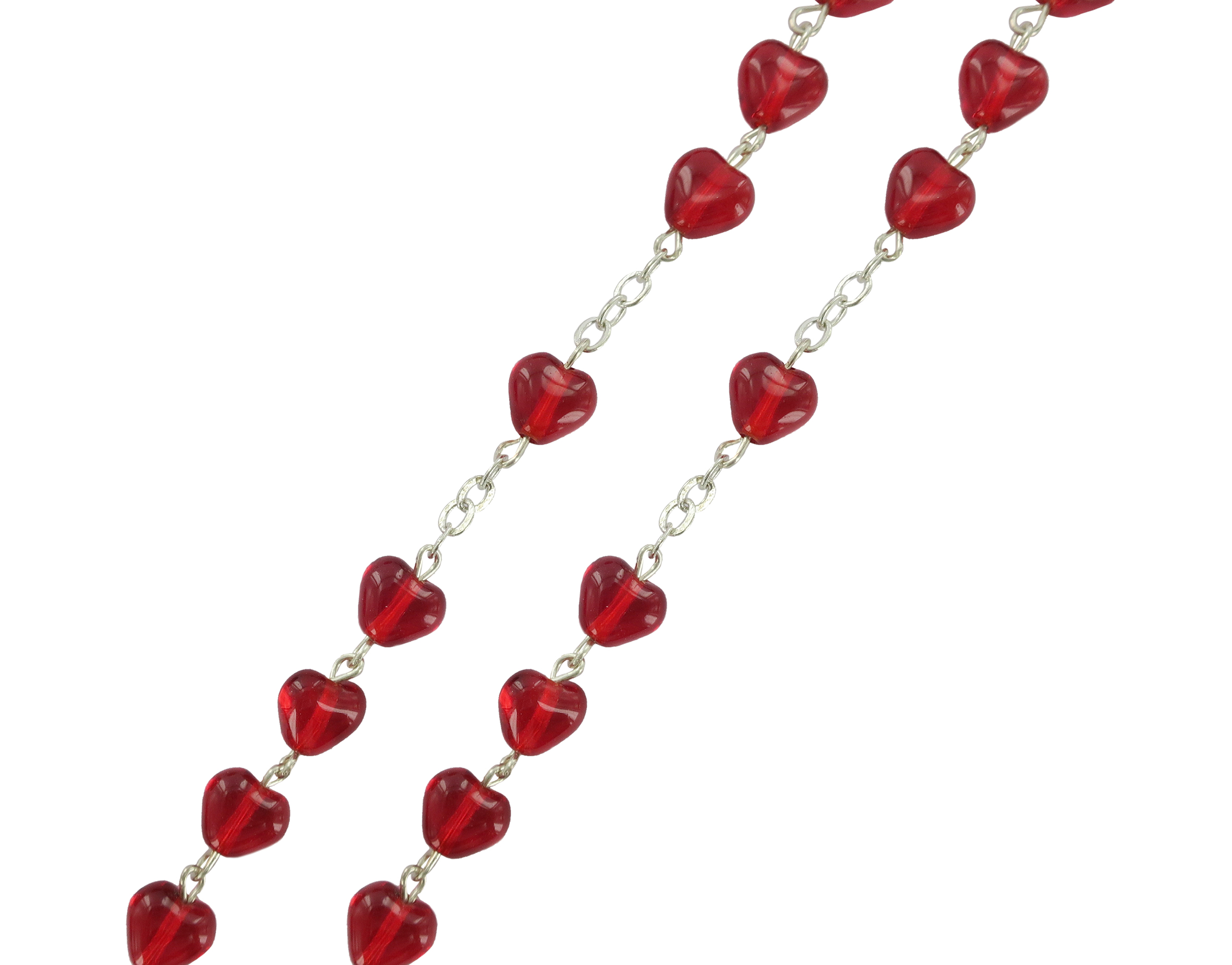 Rosario con legatura fatta a mano con grani in vetro a forma di cuoricino di colore rosso rubino. Sulla Crociera è visibile da un lato l'immagine della Madonna e dall'altro l'immagine del Sacro cuore di Gesù. Il prodotto è completamente realizzato in Italia. Il Santo Rosario è stato l'oggetto delle più vigile attenzione e premurosa sollecitudine da parte di tutti i Pontefici, che hanno visto il Rosario come una preghiera contemplativa che è insieme di lode e di supplica, efficace nel promuovere la vita cristiana e l'impegno apostolico. Anche Paolo VI e Giovanni Paolo II più volte hanno rivolto ai cristiani un appello perché fossero innalzate supplici preghiere alla Beata Vergine del Rosario, per implorare da Dio il bene supremo della pace e il risveglio della vita cristiana.