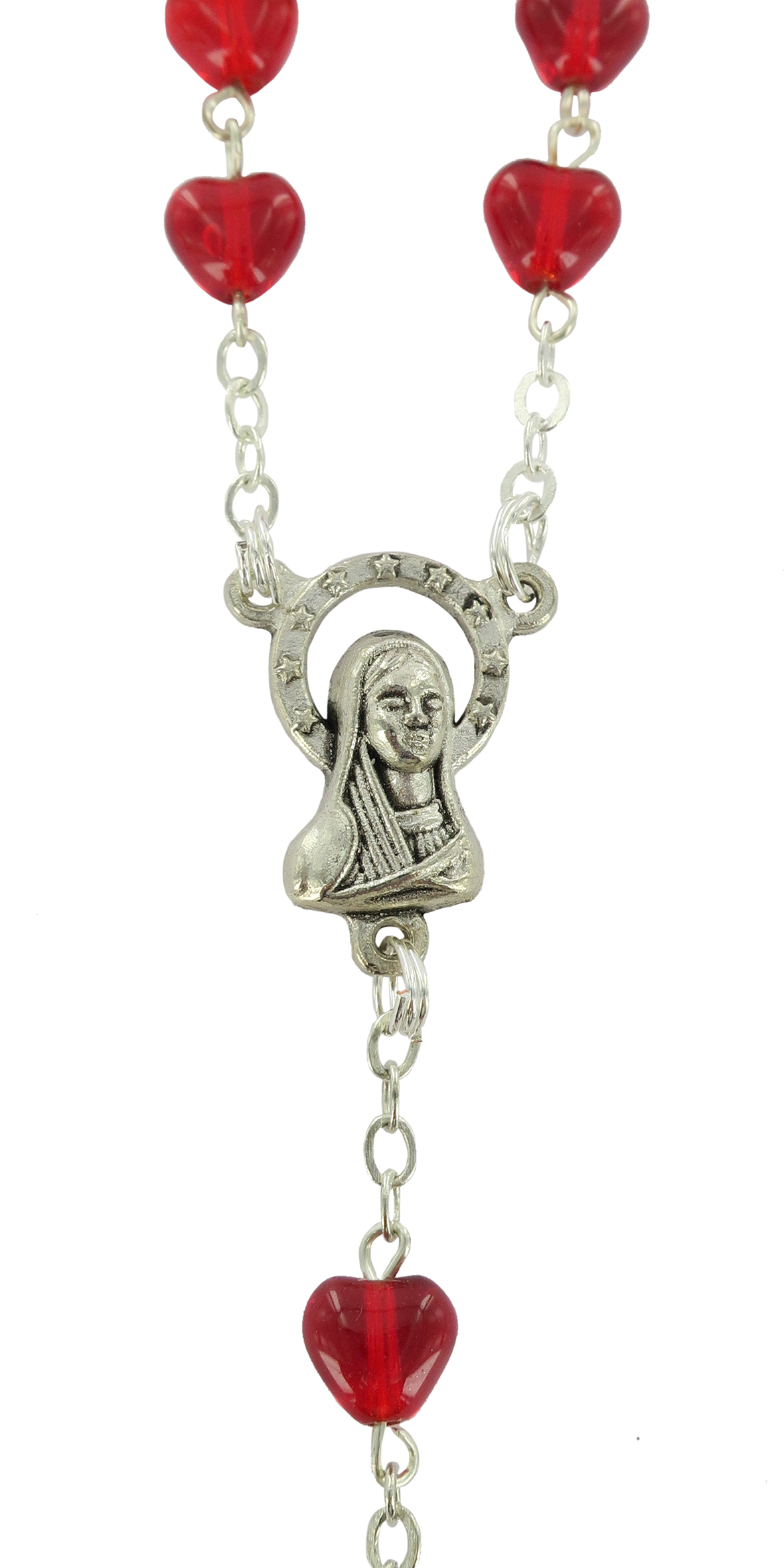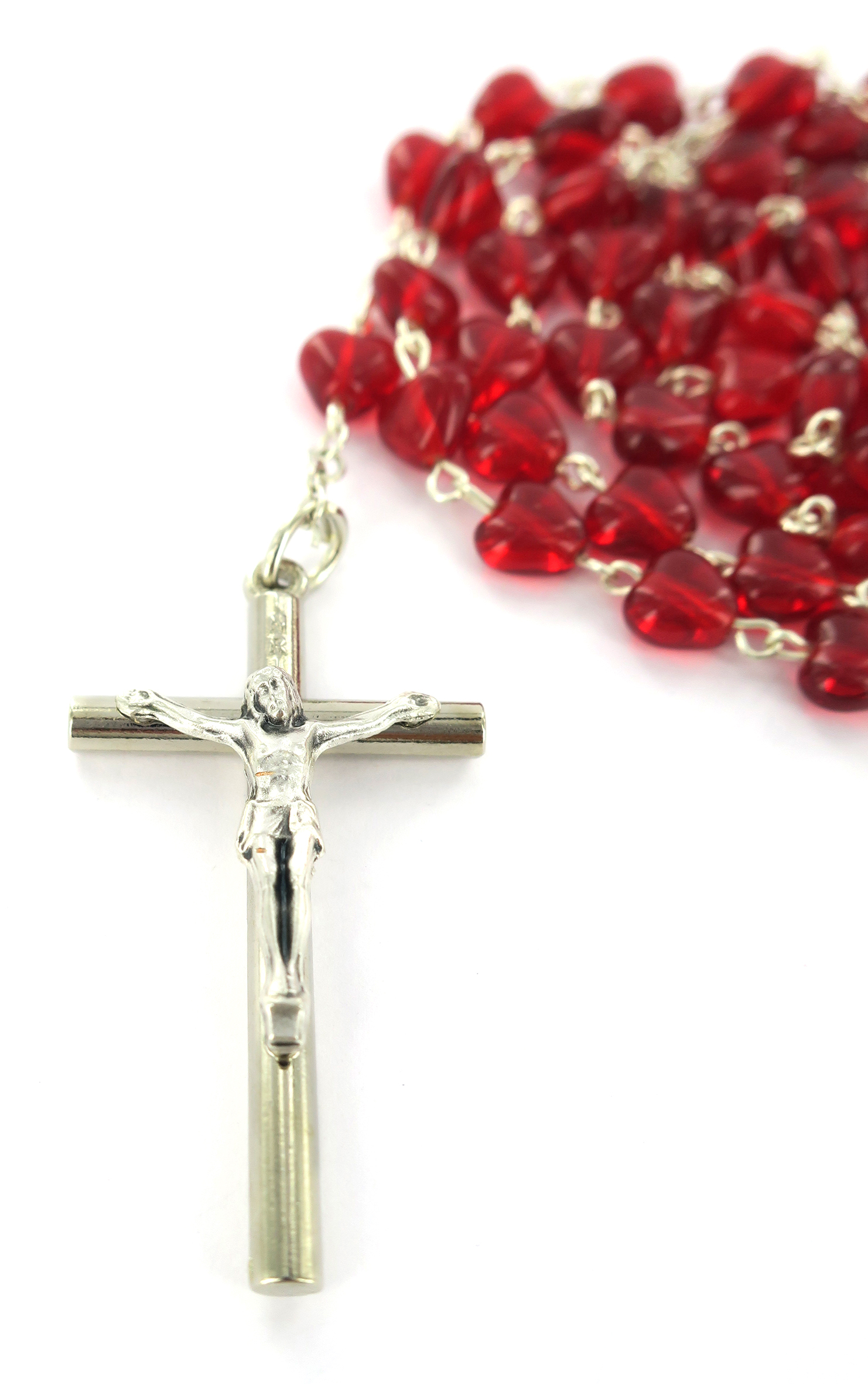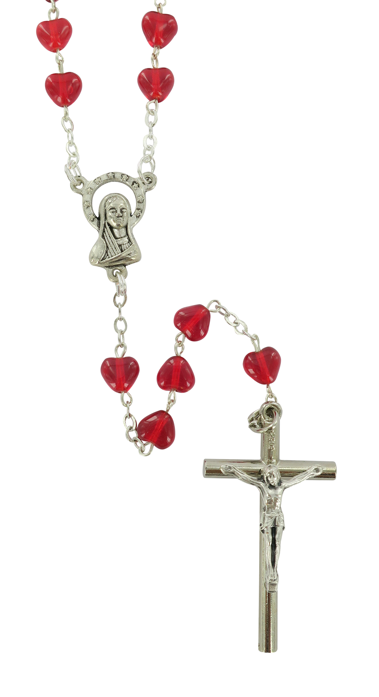 Rosario con legatura fatta a mano con grani in vetro a forma di cuoricino di colore rosso rubino. Sulla Crociera è visibile da un lato l'immagine della Madonna e dall'altro l'immagine del Sacro cuore di Gesù. Il prodotto è completamente realizzato in Italia. Il Santo Rosario è stato l'oggetto delle più vigile attenzione e premurosa sollecitudine da parte di tutti i Pontefici, che hanno visto il Rosario come una preghiera contemplativa che è insieme di lode e di supplica, efficace nel promuovere la vita cristiana e l'impegno apostolico. Anche Paolo VI e Giovanni Paolo II più volte hanno rivolto ai cristiani un appello perché fossero innalzate supplici preghiere alla Beata Vergine del Rosario, per implorare da Dio il bene supremo della pace e il risveglio della vita cristiana.