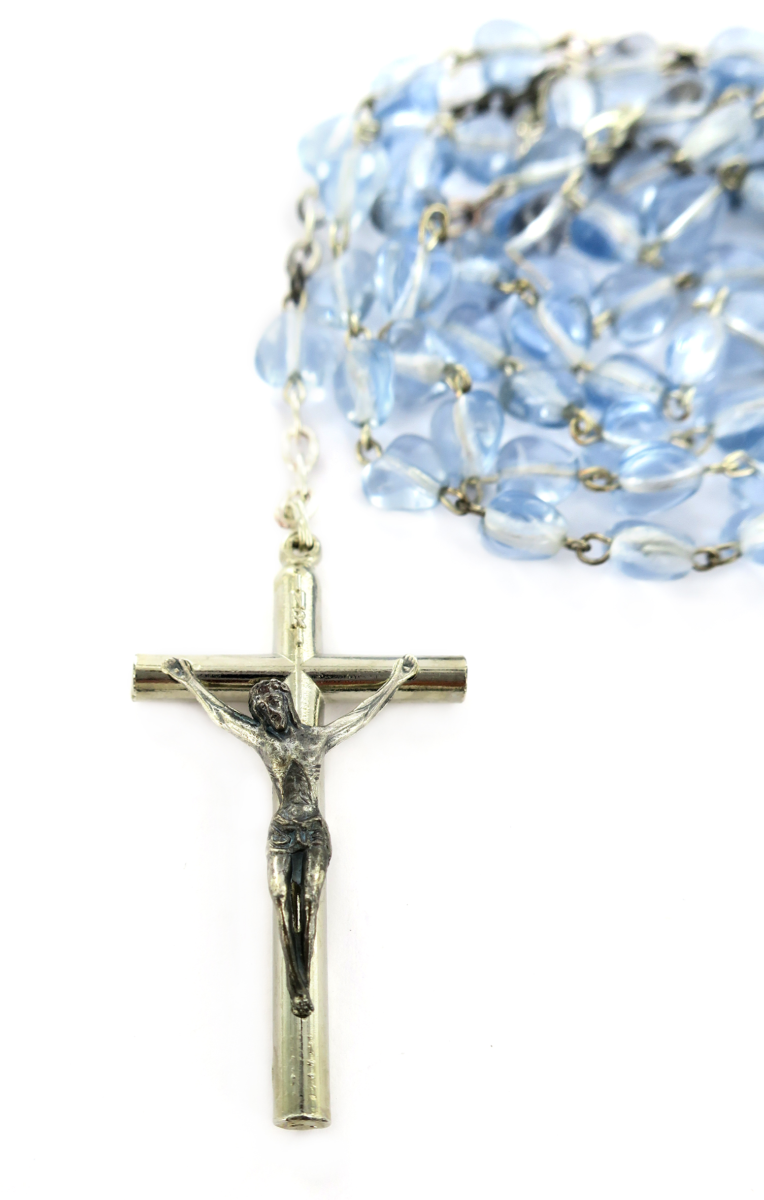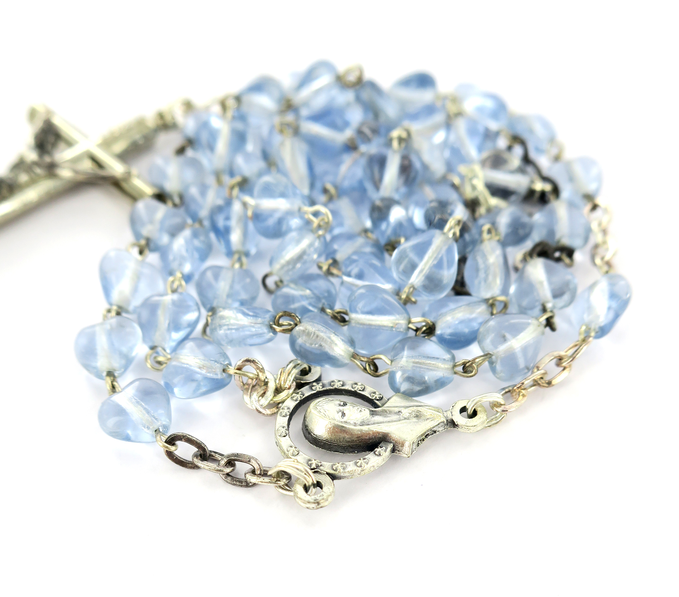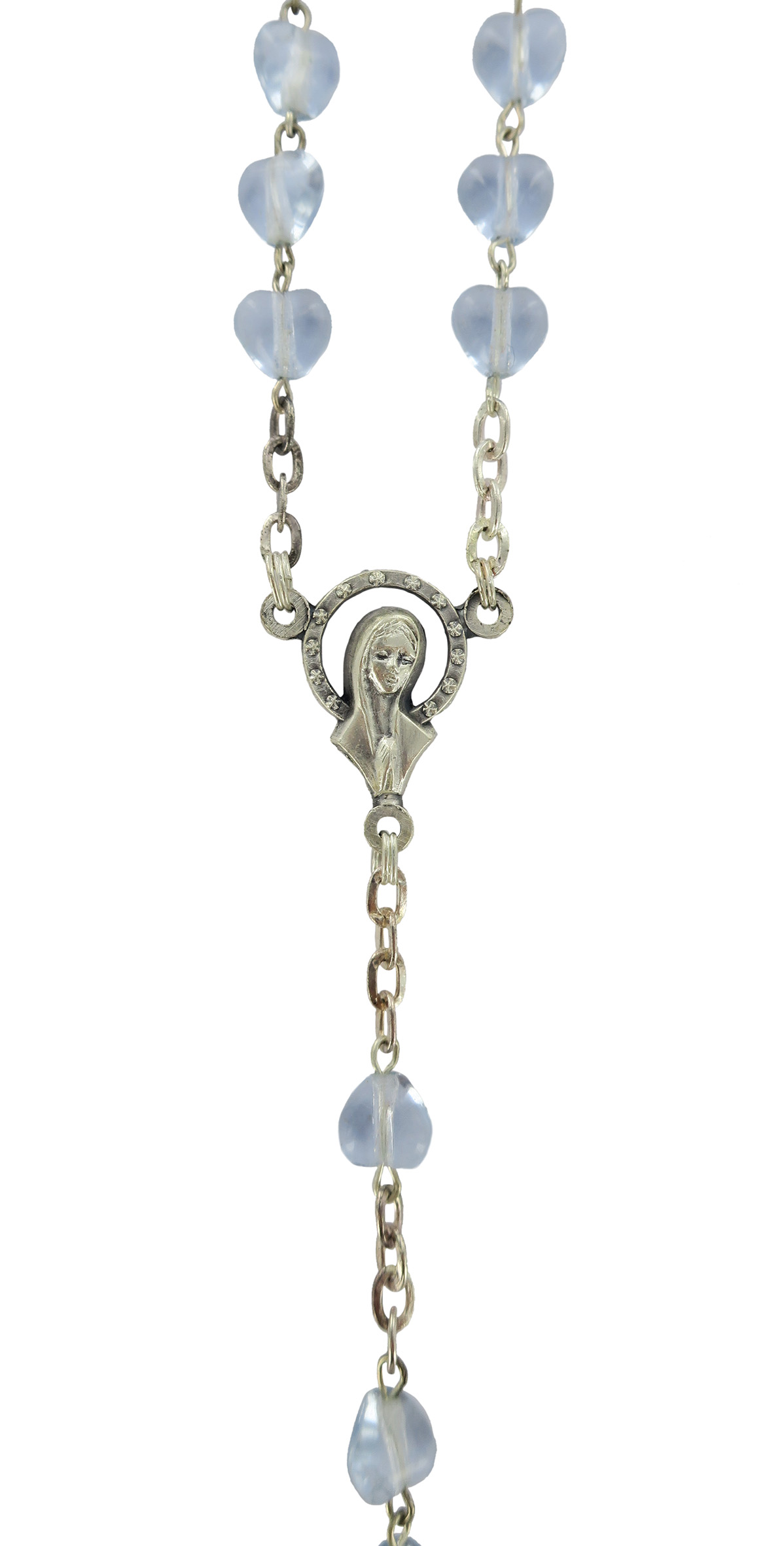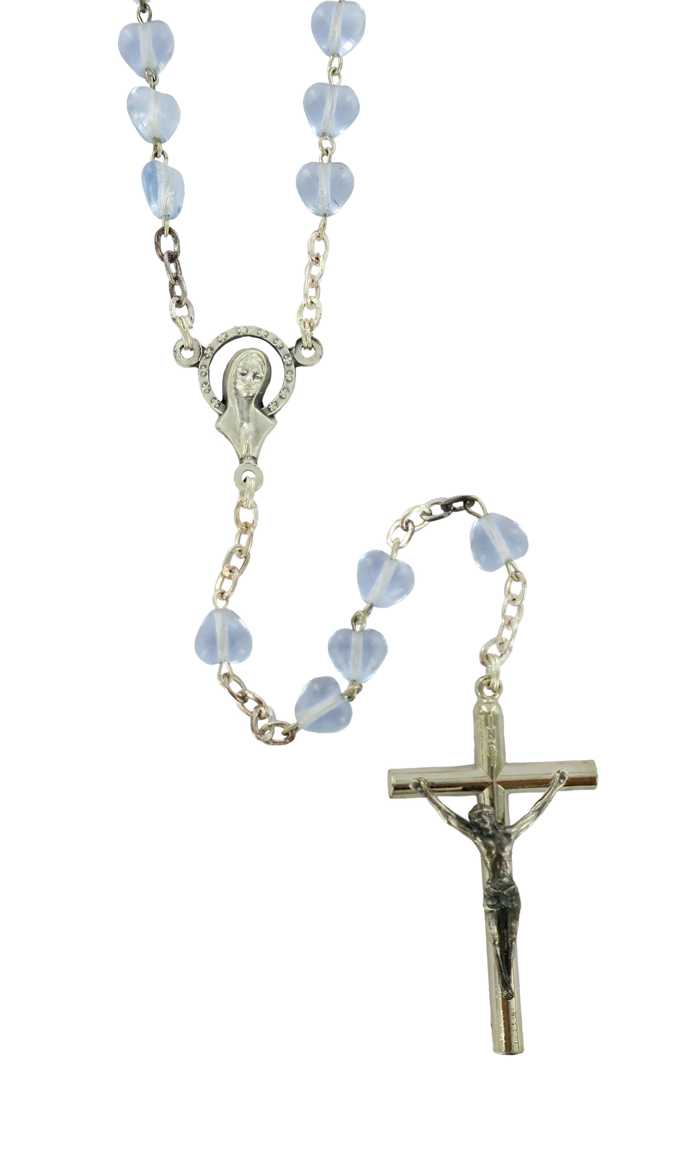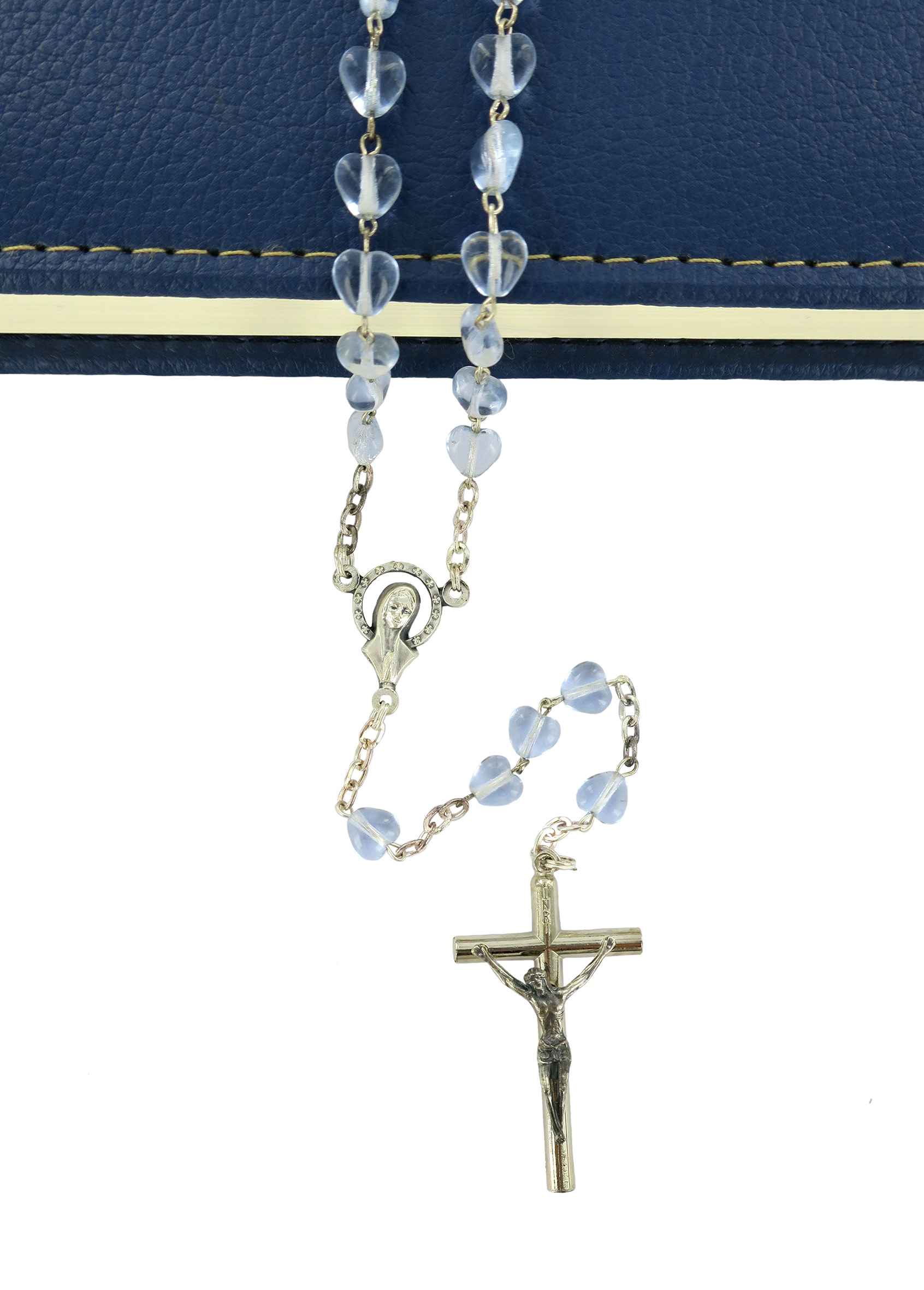 Rosario con legatura fatta a mano con grani in vetro a forma di cuoricino di colore azzurro. Sulla Crociera è visibile da un lato l'immagine della Madonna e dall'altro l'immagine del Sacro cuore di Gesù. Il prodotto è completamente realizzato in Italia. Il Santo Rosario è stato l'oggetto delle più vigile attenzione e premurosa sollecitudine da parte di tutti i Pontefici, che hanno visto il Rosario come una preghiera contemplativa che è insieme di lode e di supplica, efficace nel promuovere la vita cristiana e l'impegno apostolico. Anche Paolo VI e Giovanni Paolo II più volte hanno rivolto ai cristiani un appello perchè fossero innalzate supplici preghiere alla Beata Vergine del Rosario, per implorare da Dio il bene supremo della pace e il risveglio della vita cristiana.
