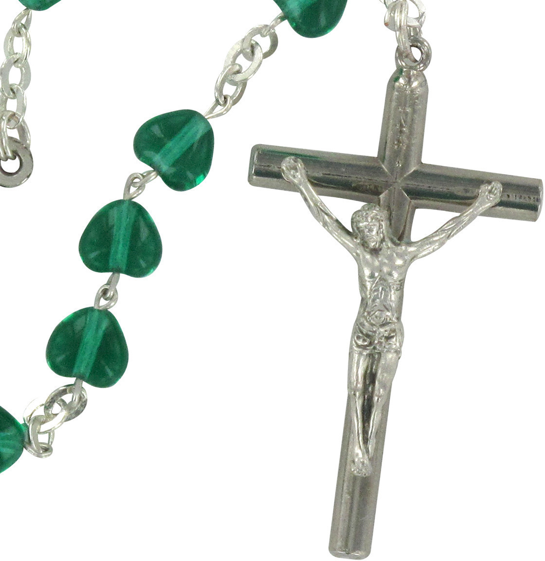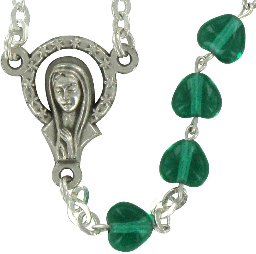 Rosario con legatura fatta a mano con grani in vetro a forma di cuoricino di colore verde.