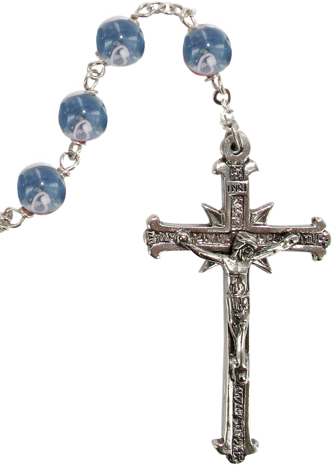 Rosario in argento 925 con grani mm 6 in vetro azzuro con piccole rose