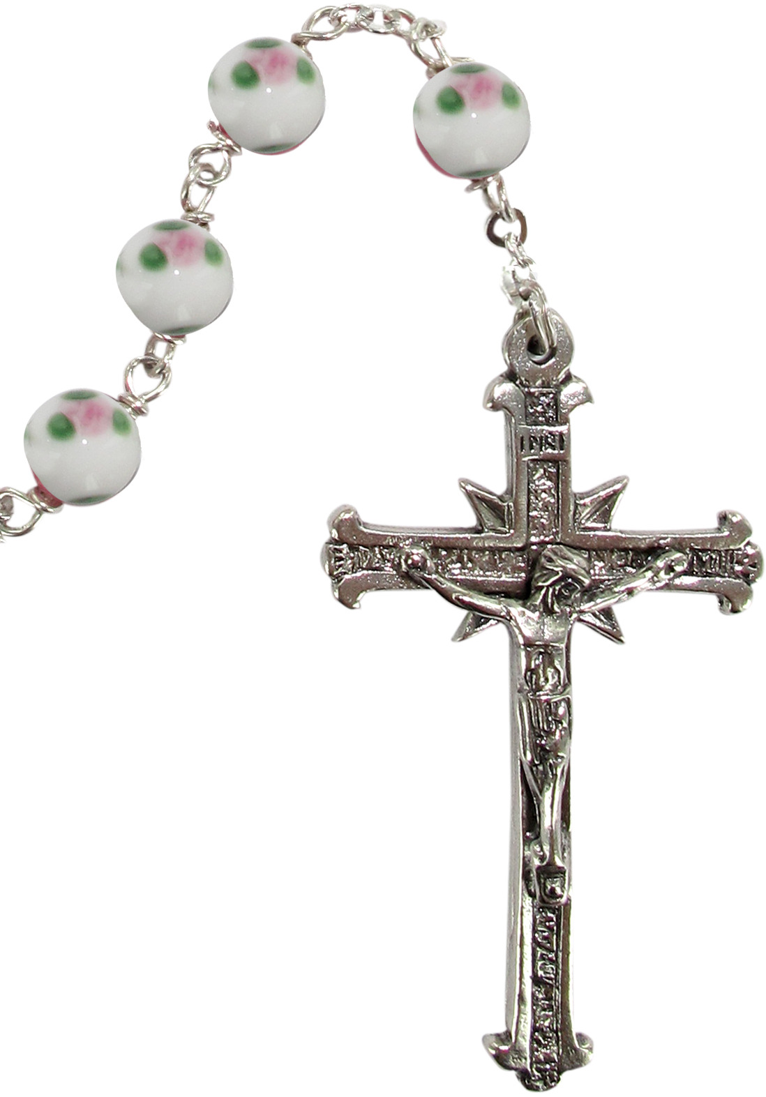 Rosario in argento 925 con grani mm 6 in vetro bianco con piccole rose