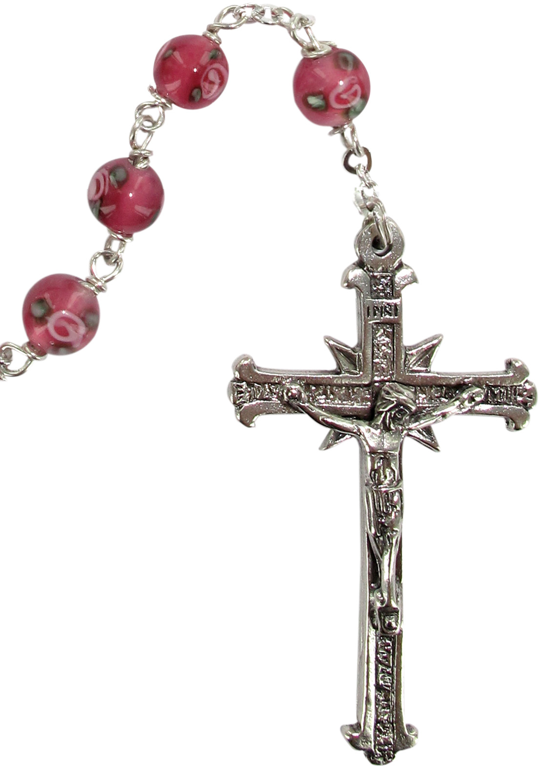 Rosario in argento 925 con grani mm 6 on vetro rosa con piccole rose