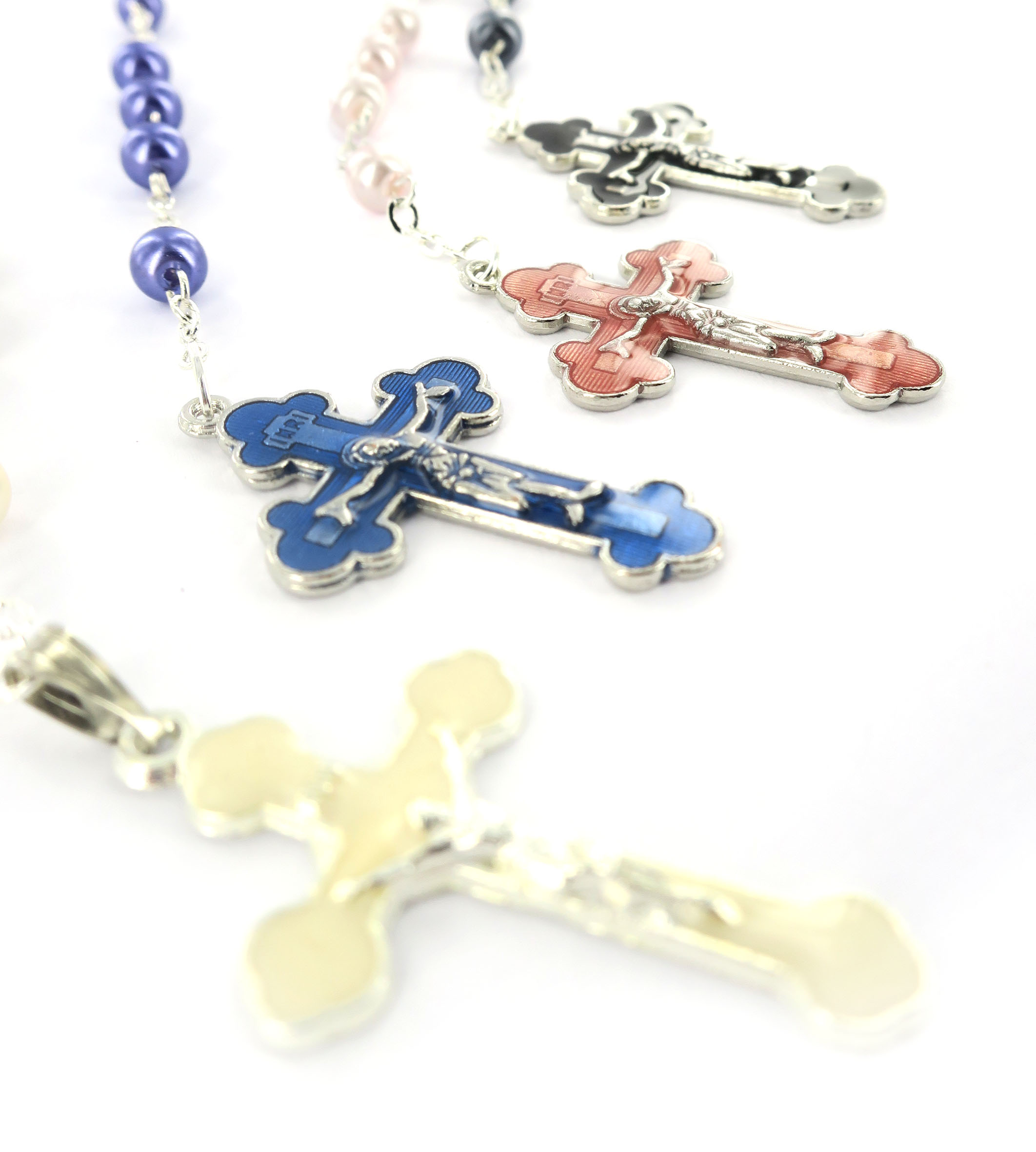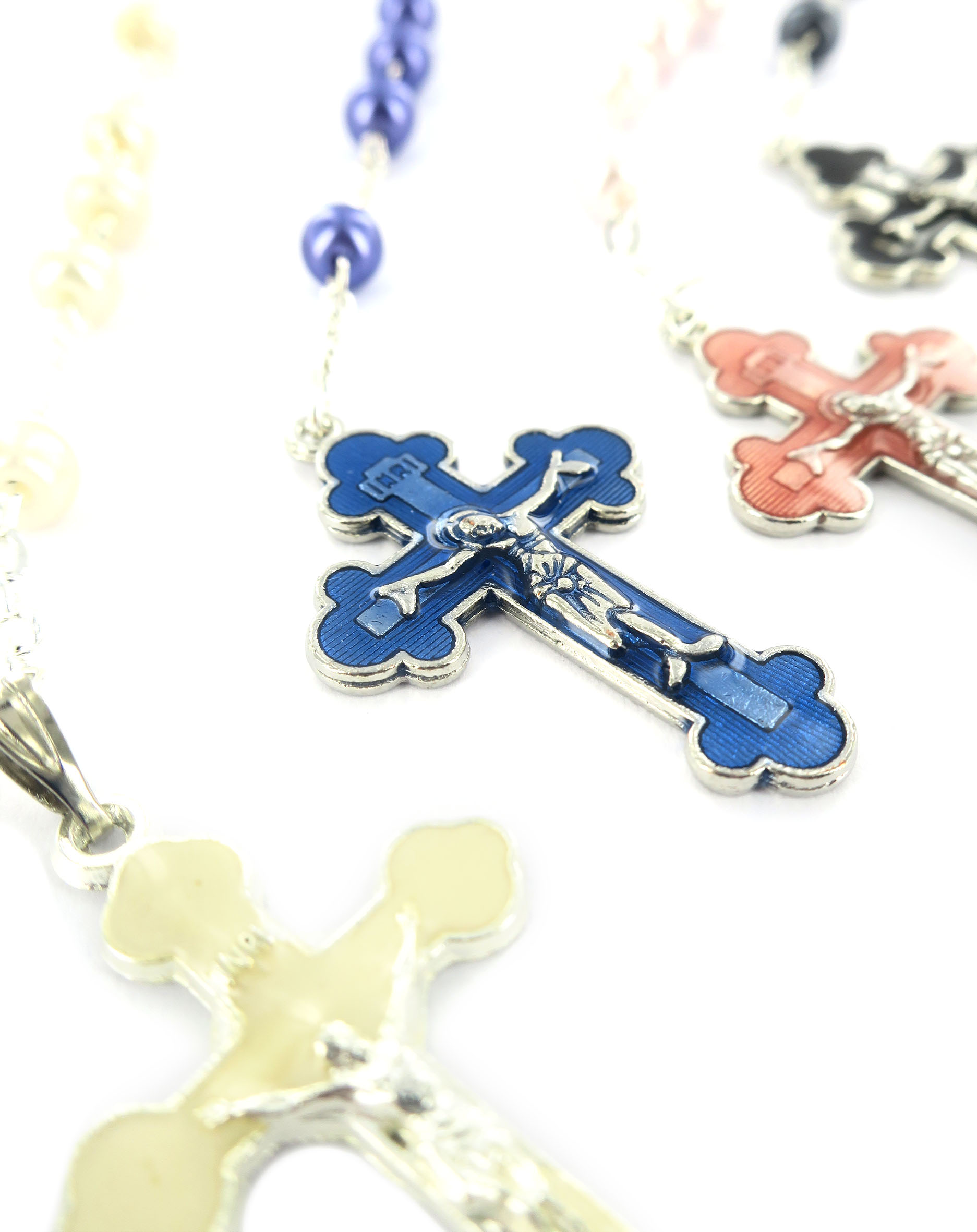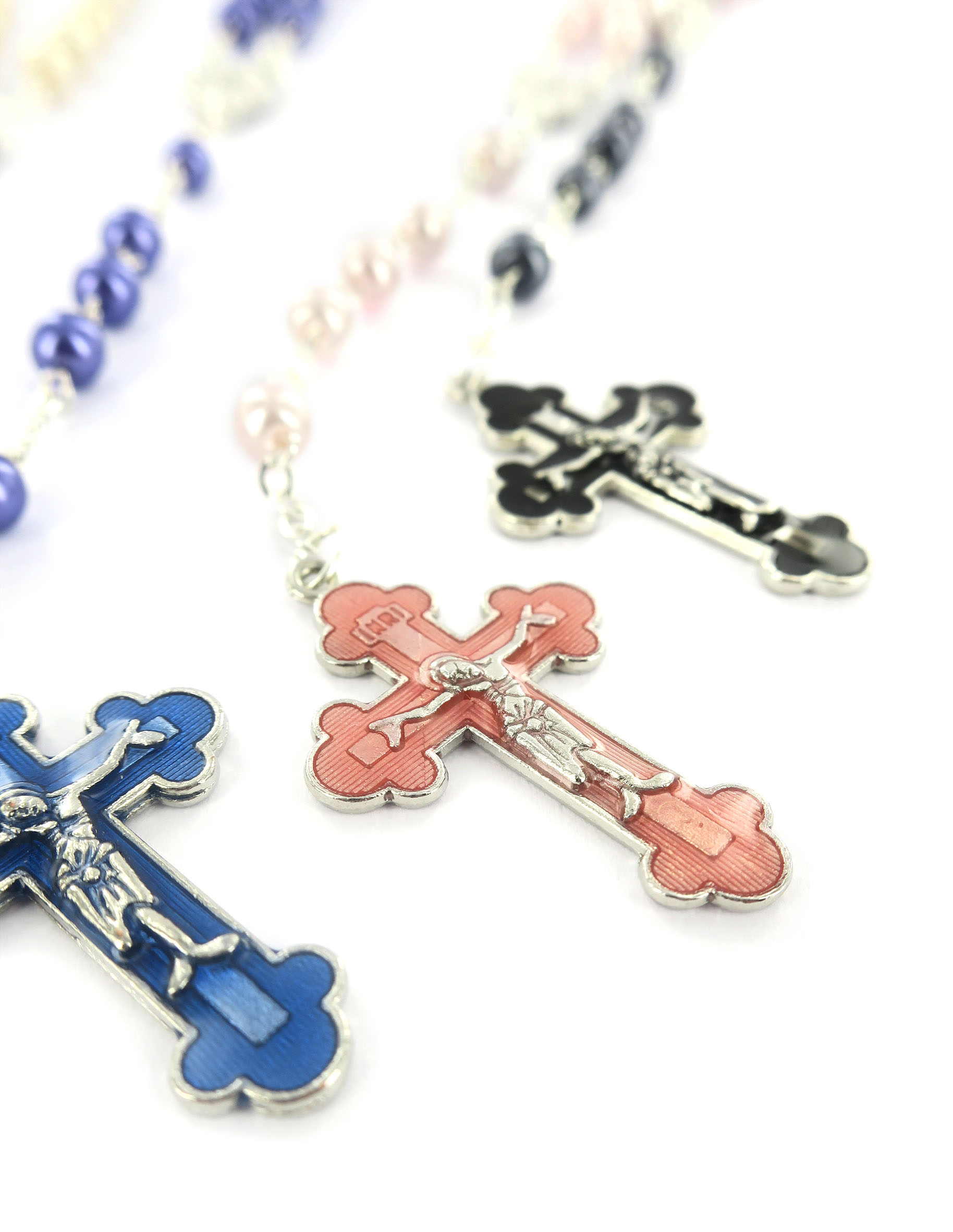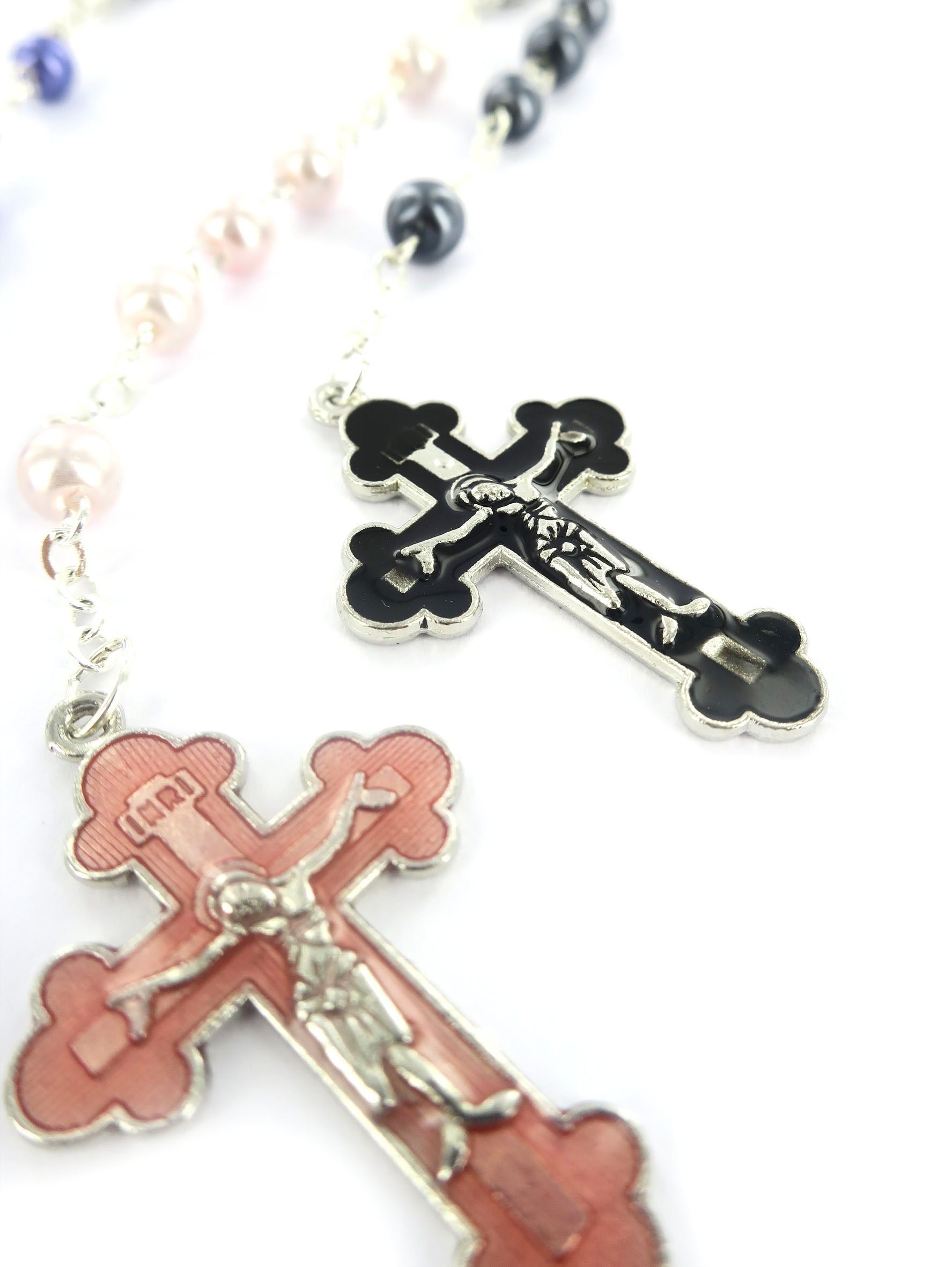 Rosario perlina colori assortiti, rosa, blu, verde acqua, bianco, nero con croce smaltata del colore del grano. La piccola crociera rappresenta la Madonna Miracolosa. Misura totale compresa di croce circa cm 40 il grano misura 5 mm. Tutto made in Italy.