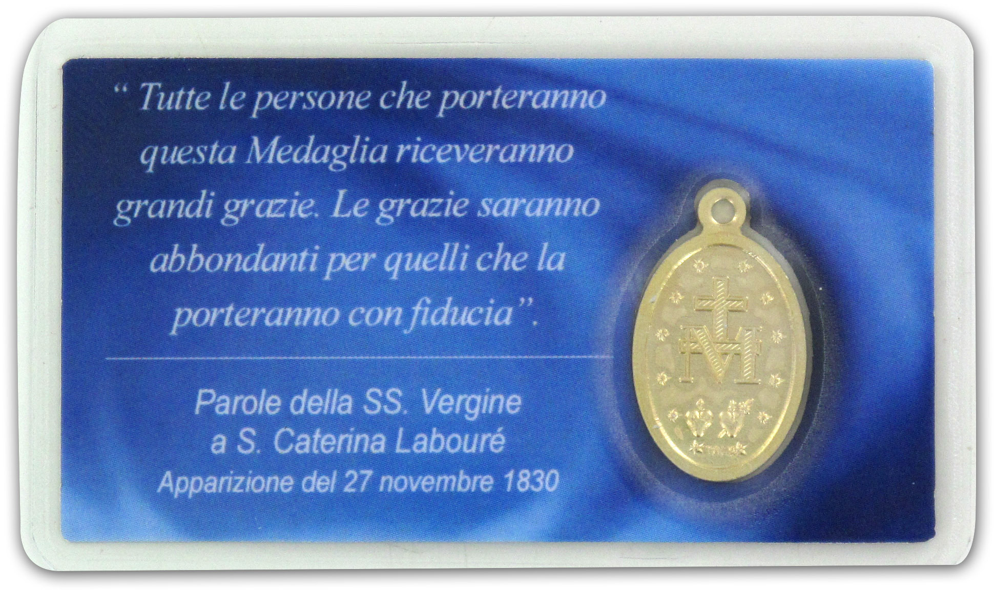 Cartoncino plastificato (6 x 4 cm circa) con medaglia della Madonna Miracolosa.