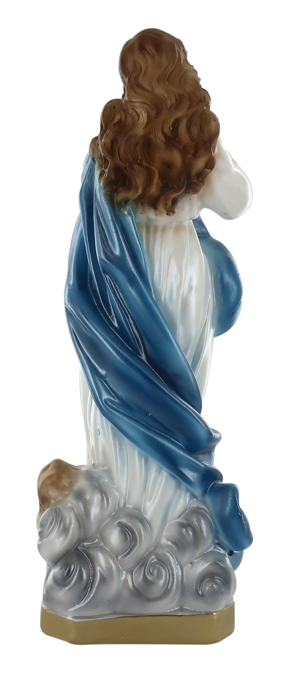 Questa statua della Madonna con angeli da 30 cm è realizzata artigianalmente in Italia e si distingue per la qualità della fattura e per il sapiente uso dei colori, adeguatamente dosati. L'effetto madreperlato rende le tinte molto lucenti e arricchisce la figura di suggestivi riflessi, donandole un aspetto elegante e pregevole. Adatta anche a piccole nicchie in ambienti dedicati al culto, la statuetta di Santa Maria degli Angeli è ideale per essere esposta in casa come soprammobile o in una vetrinetta, e può essere una gradita idea regalo per i devoti mariani. La luce delle fiammelle dei lumini o dei faretti esalterà l'effetto iridescente della sua rifinitura madreperlacea.