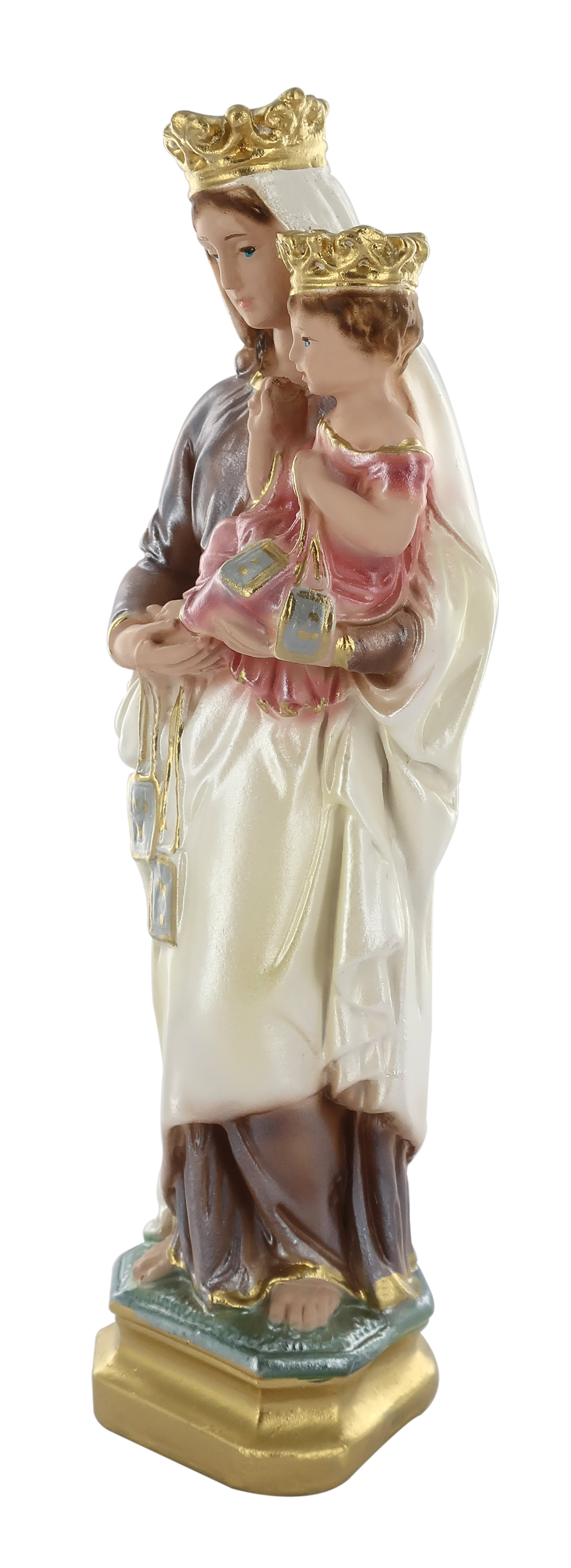 Dedicata alla patrona dei carmelitani e alla protettrice di chi indossa lo scapolare, questa statua della Madonna del Carmine da circa 20 cm è realizzata artigianalmente in Italia e si distingue per la qualità della fattura e per il sapiente uso dei colori. L'effetto madreperlato rende le tinte molto lucenti e arricchisce la figura di suggestivi riflessi, donandole un aspetto elegante e raffinato.