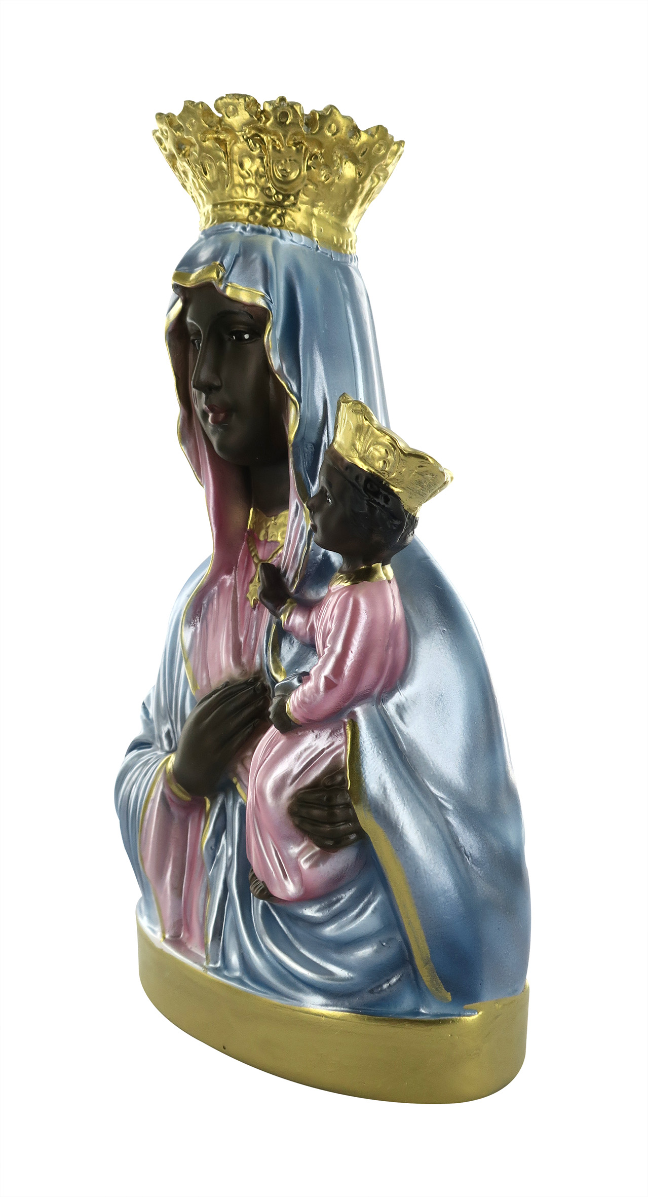 La statua, in gesso finemente dipinto a mano e impreziosito da una rifinitura madreperlata, raffigura la Madonna Nera di Czestochowa, rappresentazione tratta da un dipinto della Vergine custodito nel santuario di Jasna Gòra, vicino alla cittadina polacca di Czestochowa. Il dipinto si dice che sia stato realizzato da S. Luca utilizzando del legno originariamente appartenuto e utilizzato dalla Sacra Famiglia. Il soggetto principale, che poggia su un piedistallo color oro tondeggiante, è qui ritratto a mezzobusto, con il Bambino in braccio. Le vesti, nei colori dell'azzurro e dell'arancio, sono ricche di pieghe. Entrambi i volti dei soggetti, di carnagione scura, sono ulteriormente accentuati dalla corona color oro che indossano.