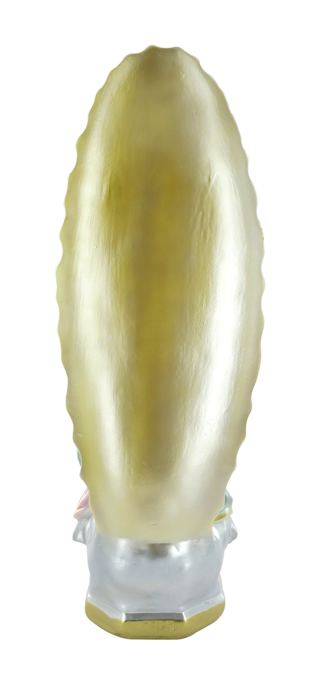 Questa statua della Nostra Signora di Guadalupe da circa 30 cm è realizzata artigianalmente in Italia e si distingue per la qualità della fattura e per il sapiente uso dei colori. L'effetto madreperlato rende le tinte molto lucenti e arricchisce la figura di suggestivi riflessi, donandole un aspetto elegante e raffinato.