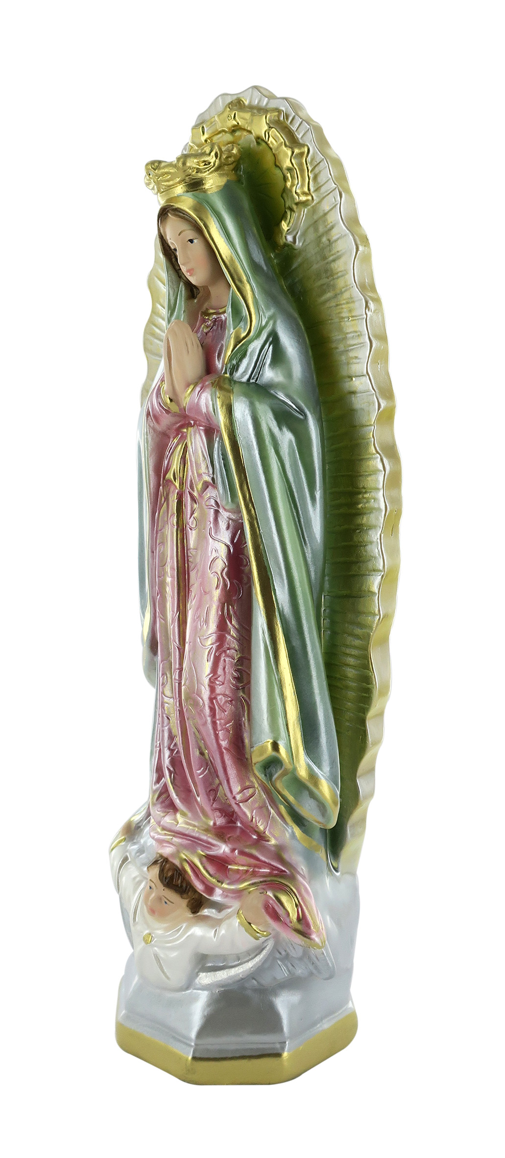 La statua, in gesso dipinto a mano e impreziosito da una rifinitura madreperlata, raffigura la Madonna di Guadalupe a mani conserte. A farle da sfondo, un'aura di color oro che contorna la sua figura. In questa rappresentazione, la "Morenita" appare all'indio Juan Diego: indossa un velo verde sfumato con un orlo color oro sopra una preziosa tunica rosa dai decori elaborati. Nella parte inferiore, sopra la base, trova posto il un bambino vestito di bianco e a braccia aperte, con delle ali color argento.