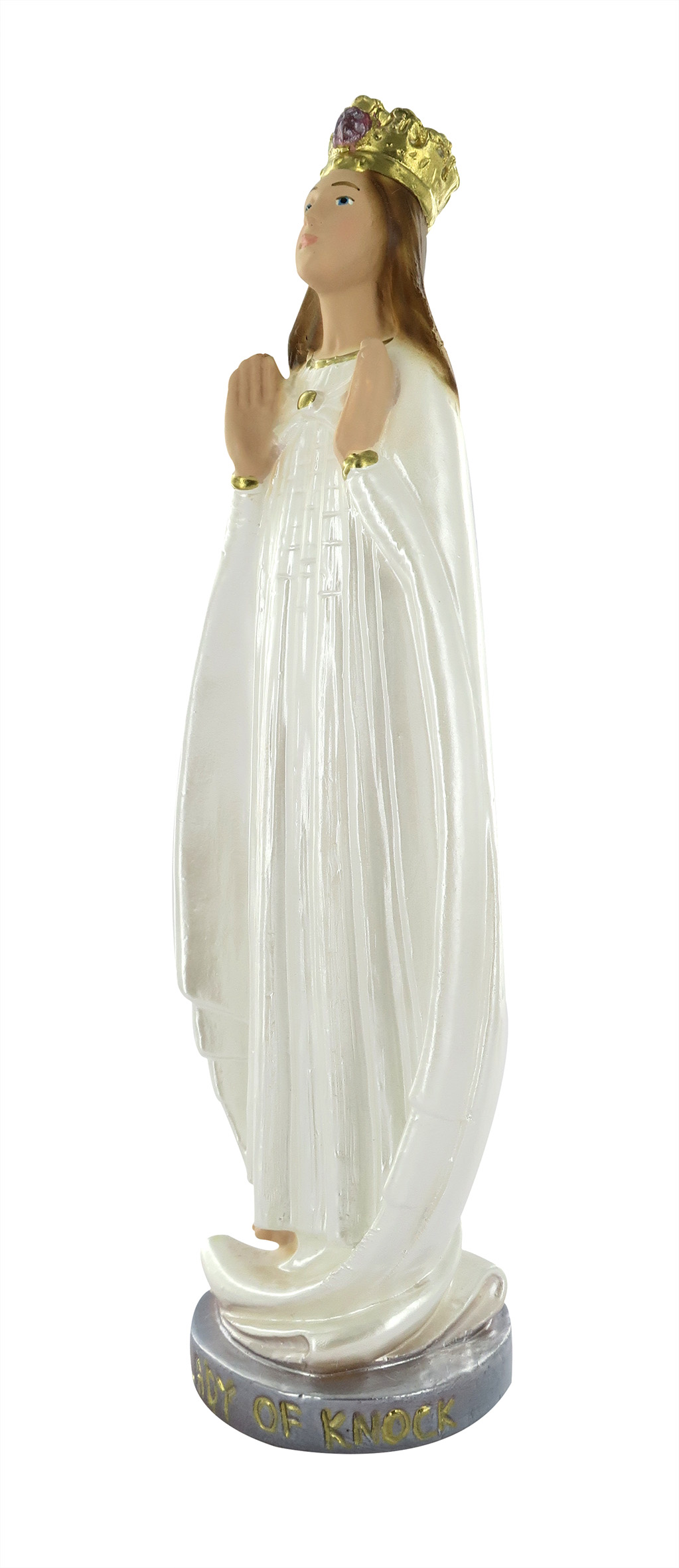 La statua, in gesso finemente dipinto a mano e impreziosito da una rifinitura madreperlata, raffigura la Madonna di Knock e celebra l'apparizione mariana avvenuta nell'agosto del 1879 nella località di Knock, in Irlanda, diventata la meta di pellegrinaggio cattolico principale dell'isola. Indossa una veste bianchissima molto semplice e ricca di pieghe, impreziosita da dettagli in color oro e una corona. Secondo il racconto della testimone, Mary McLoughlin, la Madonna apparve insieme a S. Giuseppe e a S. Giovanni.
