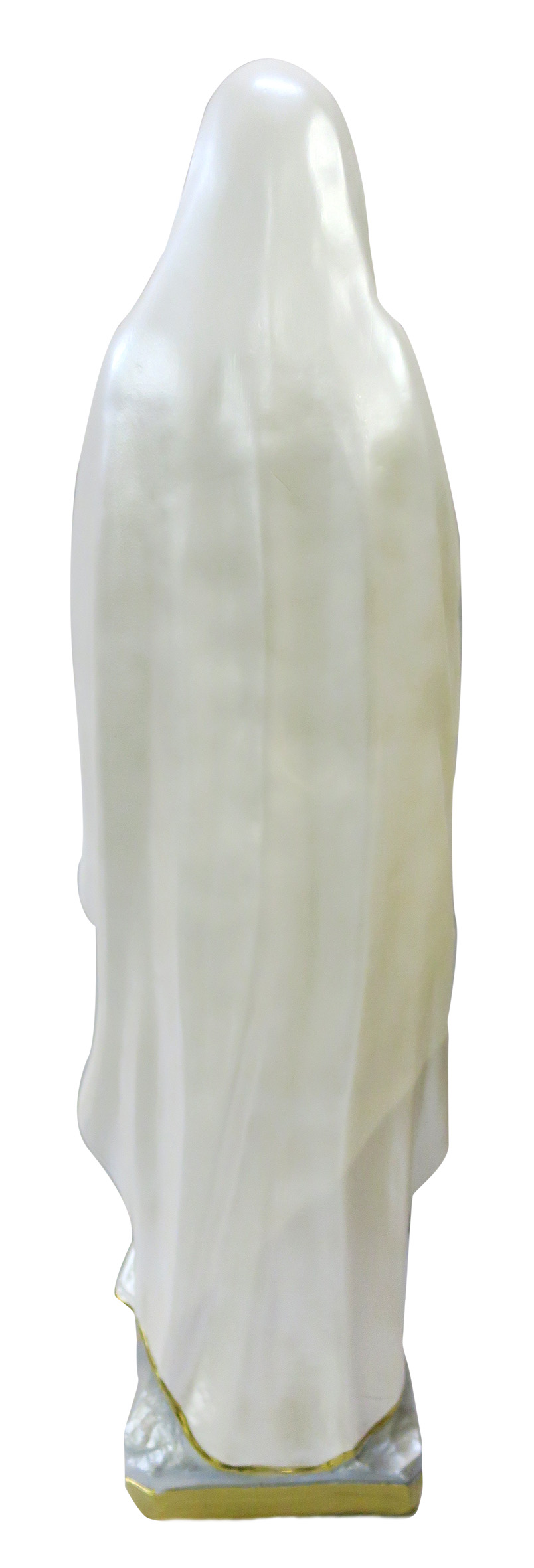 La statua, in gesso finemente dipinto a mano e impreziosito da una rifinitura madreperlata, raffigura la Madonna di Lourdes scalza e a mani congiunte sopra a un piedistallo grigio che riproduce le fattezze di una superficie rocciosa. Rappresentata come apparì a Bernadette Soubirous nella nota località francese di Lourdes nel 1858, la Nostra Signora del Rosario indossa una veste bianca coperta da un lungo copricapo del medesimo colore, bordato di color oro. A cingerle la vita, una cintura azzurra che spicca sullo sfondo immacolato insieme al rosario al braccio. I suoi indumenti vantano un'attenzione particolare alla resa delle pieghe e delle delicate sfumature, che donano grande plasticità e pregio alla rappresentazione.