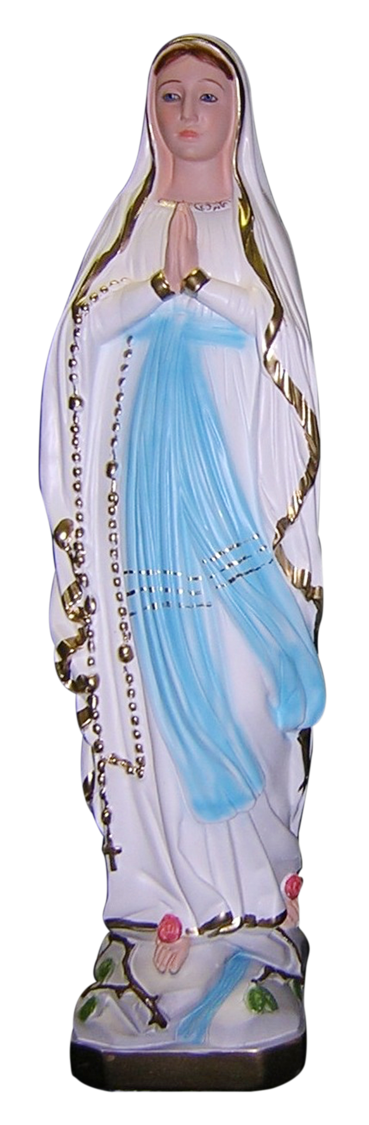 La statua, in gesso finemente dipinto a mano e impreziosito da una rifinitura madreperlata, raffigura la Madonna di Lourdes scalza e a mani congiunte sopra a un piedistallo grigio che riproduce le fattezze di una superficie rocciosa. Rappresentata come apparì a Bernadette Soubirous nella nota località francese di Lourdes nel 1858, la Nostra Signora del Rosario indossa una veste bianca coperta da un lungo copricapo del medesimo colore, bordato di color oro. A cingerle la vita, una cintura azzurra che spicca sullo sfondo immacolato insieme al rosario al braccio. I suoi indumenti vantano un'attenzione particolare alla resa delle pieghe e delle delicate sfumature, che donano grande plasticità e pregio alla rappresentazione.