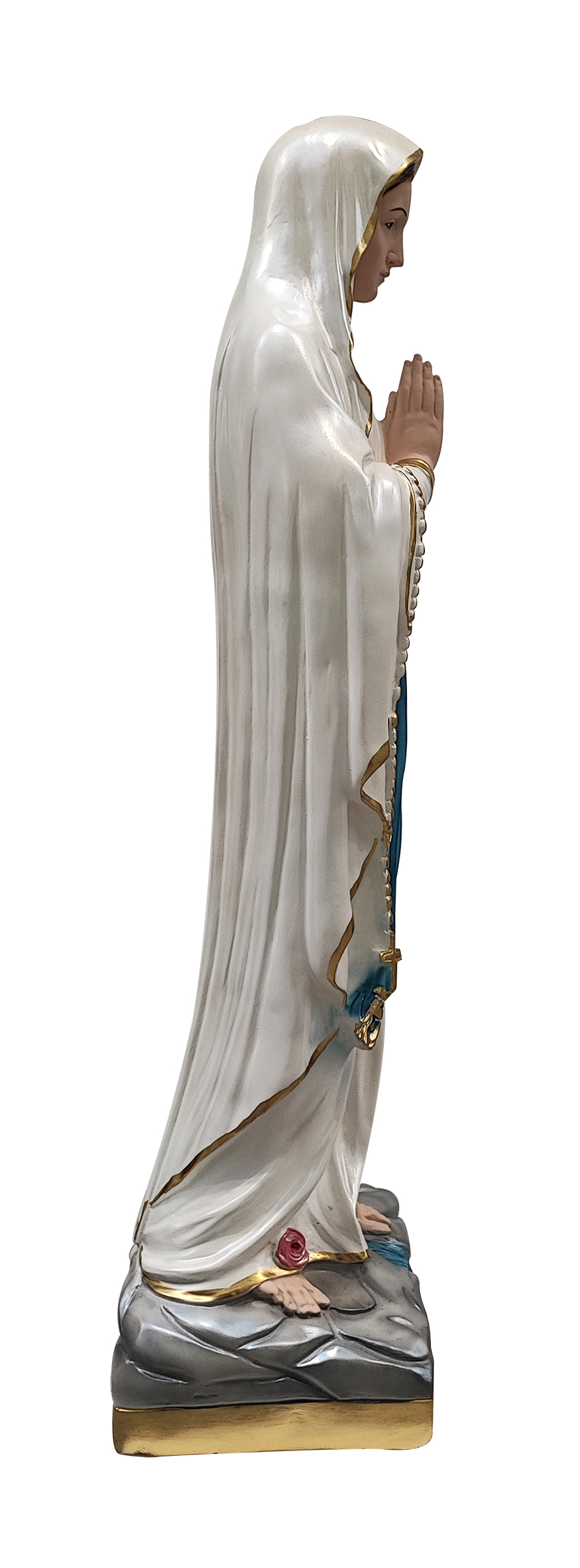 La statua, in gesso finemente dipinto a mano e impreziosito da una rifinitura madreperlata, raffigura la Madonna di Lourdes scalza e a mani congiunte sopra a un piedistallo grigio che riproduce le fattezze di una superficie rocciosa. Rappresentata come apparì a Bernadette Soubirous nella nota località francese di Lourdes nel 1858, la Nostra Signora del Rosario indossa una veste bianca coperta da un lungo copricapo del medesimo colore, bordato di color oro. A cingerle la vita, una cintura azzurra che spicca sullo sfondo immacolato insieme al rosario al braccio. I suoi indumenti vantano un'attenzione particolare alla resa delle pieghe e delle delicate sfumature, che donano grande plasticità e pregio alla rappresentazione.