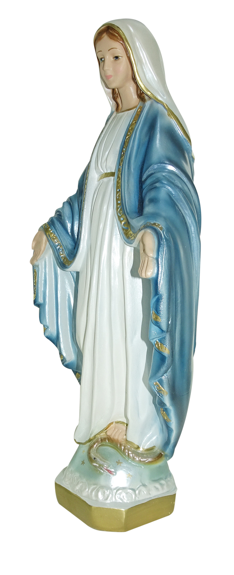 Questa statua della Madonna Miracolosa da 33 cm è stata realizzata artigianalmente in Italia e si distingue per la qualità della fattura e per il sapiente uso dei colori. L'effetto madreperlato rende le tinte molto lucenti e arricchisce la figura di suggestivi riflessi, donandole un aspetto elegante e raffinato. La statua della Madonna Miracolosa è ideale per nicchie o ambienti dedicati al culto. La luce delle fiammelle dei lumini o dei faretti esalterà l'effetto iridescente della sua rifinitura madreperlacea.