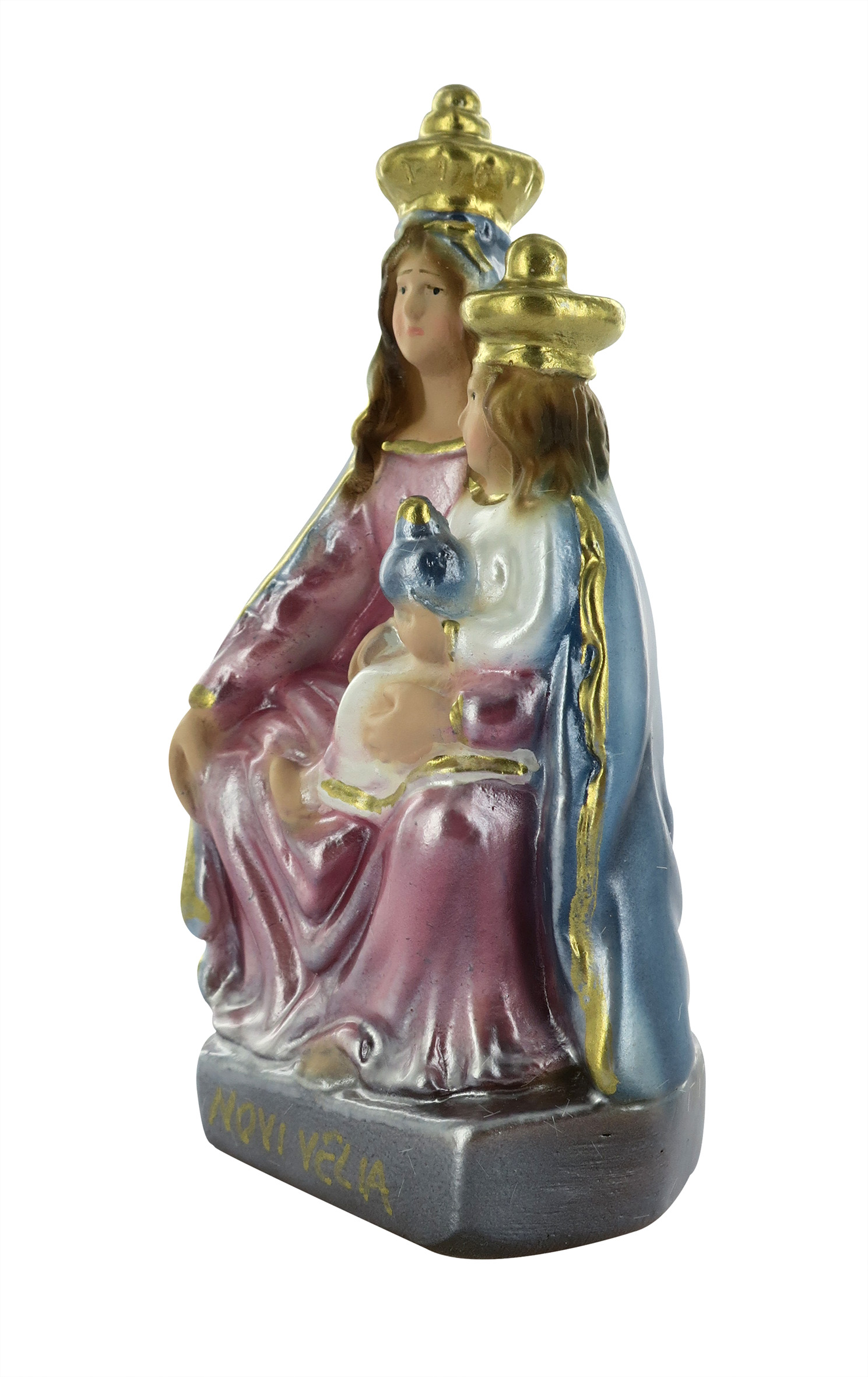 La statua, in gesso finemente dipinto a mano e impreziosita da una rifinitura madreperlata, raffigura la Madonna di Novi Velia, figura mariana del Santuario del Sacro Monte edificato nel 1323 sul Monte Gelbison, in provincia di Salerno. In questa rappresentazione, la Madonna divide la scena con il Bambino, da lei tenuto in braccio. La donna indossa una veste rosa coperta da un mantello azzurro, mentre Gesù Bambino spicca in una piccola veste bianca. La Madonna di Novi Velia apparve ad un gruppo di muratori, annunciando il suo desiderio di vedere la cappella che stavano costruendo dedicata agli angeli. I lavori, prima di quell'episodio, non vedevano grandi progressi, visto che quanto costruito di giorno veniva ritrovato distrutto la mattina successiva.