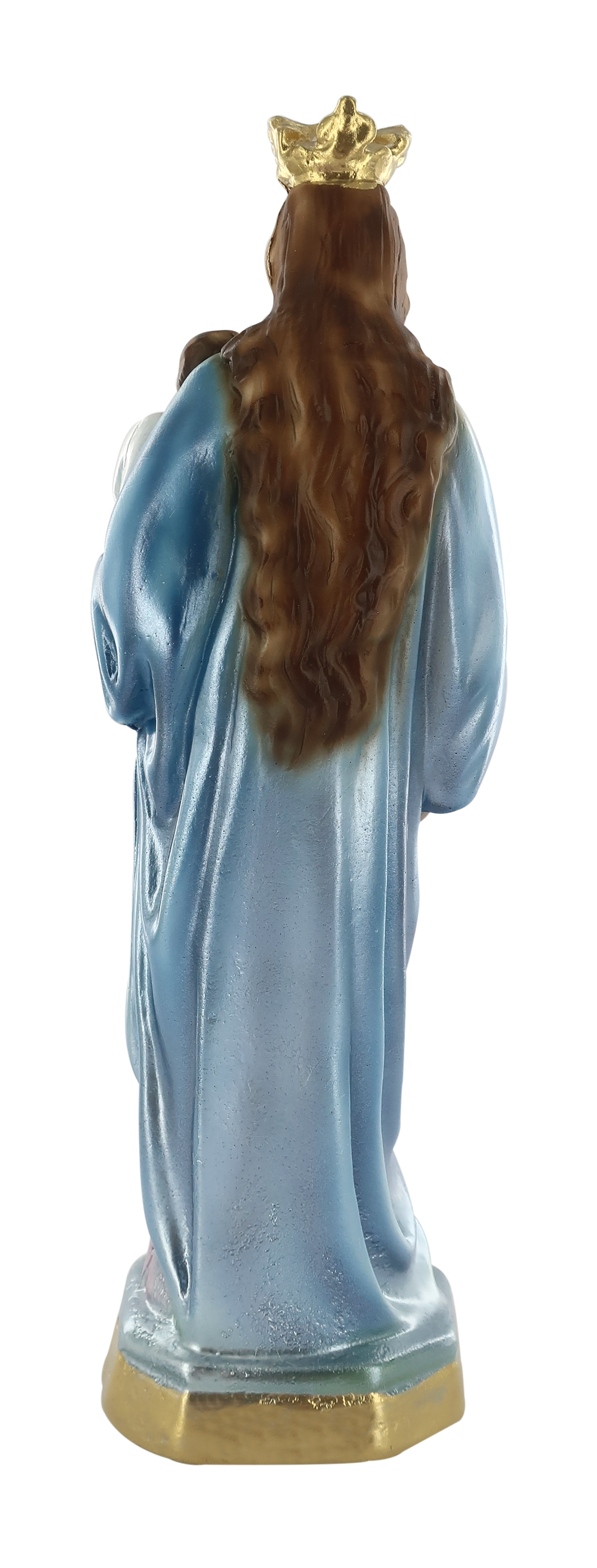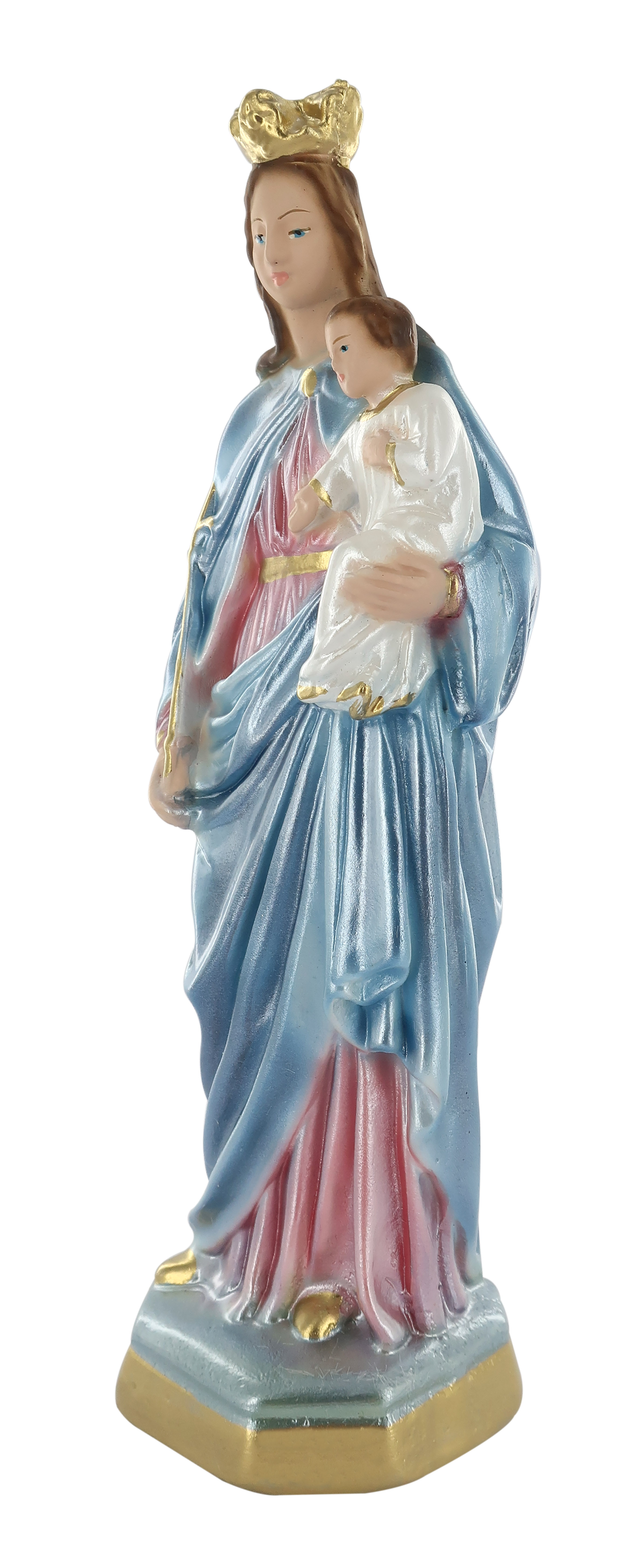 Questa statua di Maria Aiuto dei Cristiani da circa 20 cm è realizzata artigianalmente in Italia e si distingue per la qualità della fattura e per il sapiente uso dei colori. Le linee delle vesti e la resa delle loro pieghe donano plasticità alla figura e la rendono suggestiva. Adatta anche a piccole nicchie in luoghi di culto, la statuetta della Madonna Ausiliatrice risulta anche indicata per essere esposta a casa come soprammobile o in una vetrinetta. Per i devoti mariani, può essere anche una gradita idea regalo. La luce delle fiammelle dei lumini o dei faretti esalterà la fisicità del soggetto e ne aumenterà l'impatto visivo.