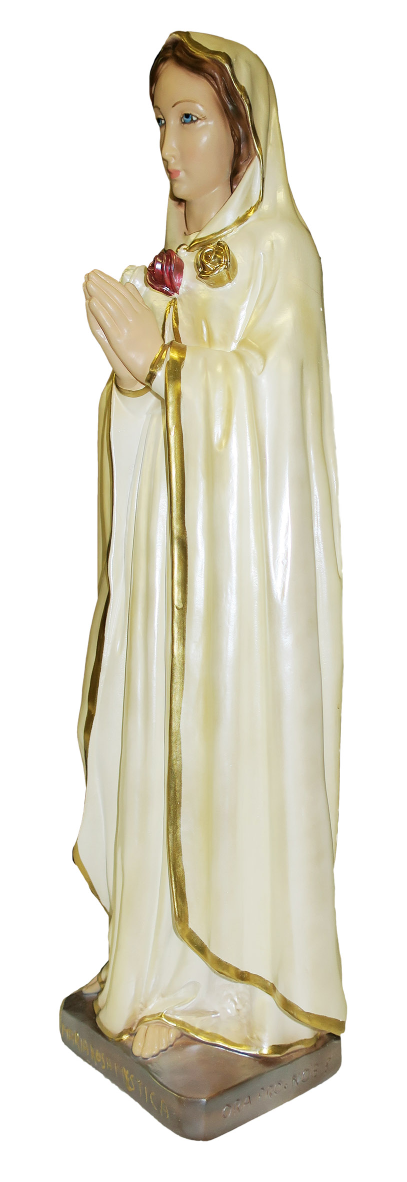 La statua, in gesso finemente dipinto a mano e impreziosito da una rifinitura madreperlata, raffigura la Madonna in una delle sue rappresentazioni: Rosa Mistica. Ritratta scalza su un piedistallo color argento che reca il suo nome, la Vergine indossa una veste color panna con copricapo del medesimo delicato colore, con bordi in color oro e abbellita da tre rose, volte a rappresentare la preghiera (bianca), il sacrificio (rossa) e la penitenza (gialla). Gli indumenti vantano un'attenzione particolare alla resa delle pieghe e delle delicate sfumature, che donano grande plasticità e profondità alla rappresentazione.