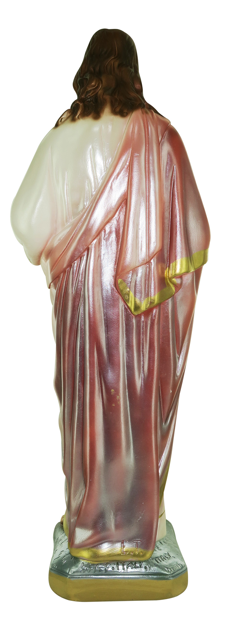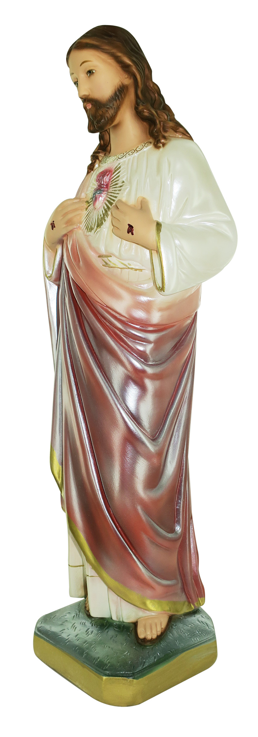 La statua, in gesso finemente dipinto a mano e impreziosito da una rifinitura madreperlata, raffigura il Sacro Cuore di Gesù, devozione molto cara ai cattolici. Cristo è su un piedistallo color oro e verde; sulle mani, appoggiate al petto, porta il segno della Crocifissione. Rappresentato con la barba e i capelli lunghi, Gesù indossa una veste bianca coperta da un mantello rosato, ricchissimo di pieghe e bordato di color oro. Sulla candida tunica spicca il cuore rosso con le fiamme e una corona di spine, rispettivamente volte a simboleggiare l'ardore misericordioso che il Salvatore prova nei confronti dei peccatori e la sofferenza del suo sacrificio. I suoi indumenti vantano un'attenzione particolare alla resa delle pieghe e delle delicate sfumature, che donano grande plasticità e pregio alla rappresentazione.