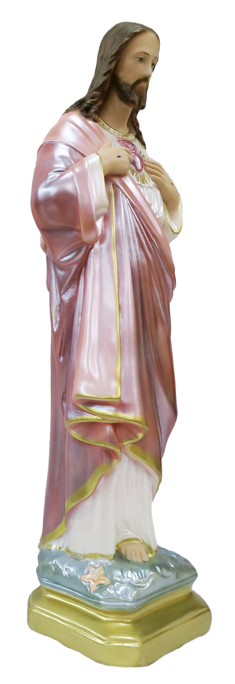 La statua, in gesso finemente dipinto a mano e impreziosito da una rifinitura madreperlata, raffigura il Sacro Cuore di Gesù, devozione molto cara ai cattolici. Cristo è su un piedistallo color oro; sulle mani, appoggiate al petto, porta il segno della Crocifissione. Rappresentato con la barba e i capelli lunghi, Gesù indossa una veste bianca coperta da un mantello rosato, ricchissimo di pieghe e bordato di color oro. Sulla candida tunica spicca il cuore con una croce e delle fiamme volte a simboleggiare l'ardore misericordioso che il Salvatore prova nei confronti dei peccatori. I suoi indumenti vantano un'attenzione particolare alla resa delle pieghe e delle delicate sfumature, che donano grande plasticità e pregio alla rappresentazione.