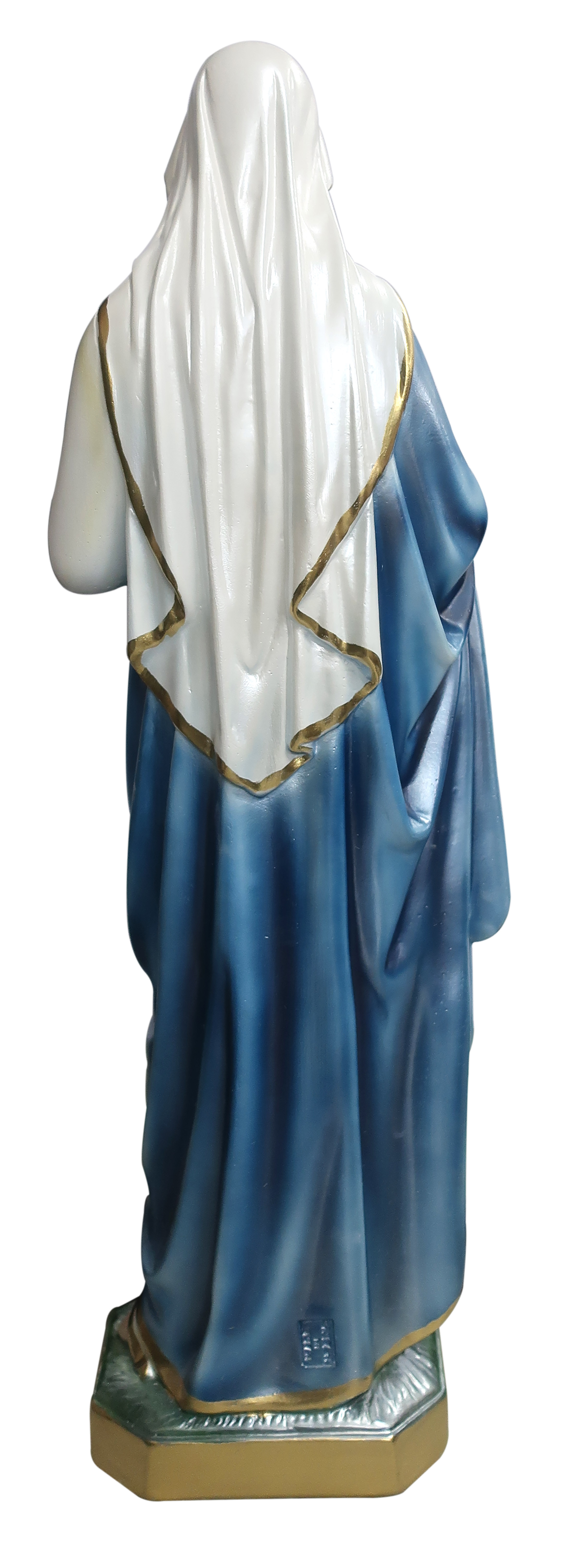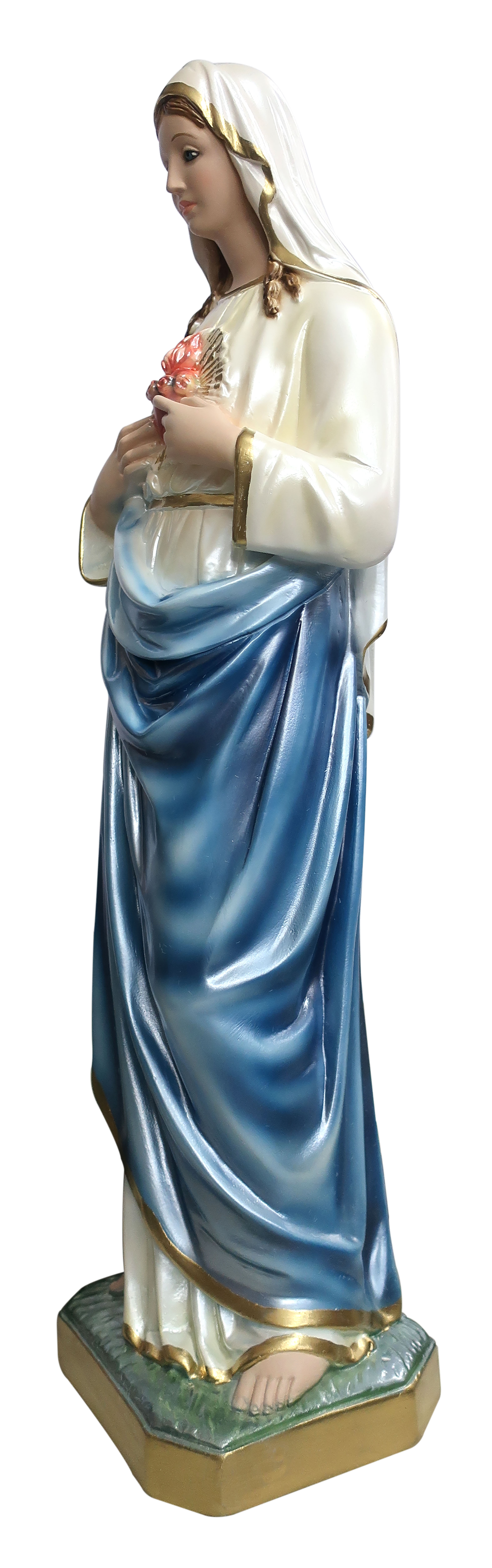 La statua, in gesso finemente dipinto a mano impreziosito da una rifinitura madreperlata, raffigura la Vergine e il Sacro Cuore di Maria, devozione molto cara ai cattolici. Il cuore della Santa Madre, chiamato anche “Cuore Immacolato di Maria”, simboleggia il dolore provato per la morte del figlio ed è qui rappresentato con delle fiammelle, trafitto dalla lama di un'arma e circondato da una corona di rose. Gli indumenti vantano un'attenzione particolare alla resa delle pieghe e delle delicate sfumature, che donano grande plasticità e realismo alla figura.