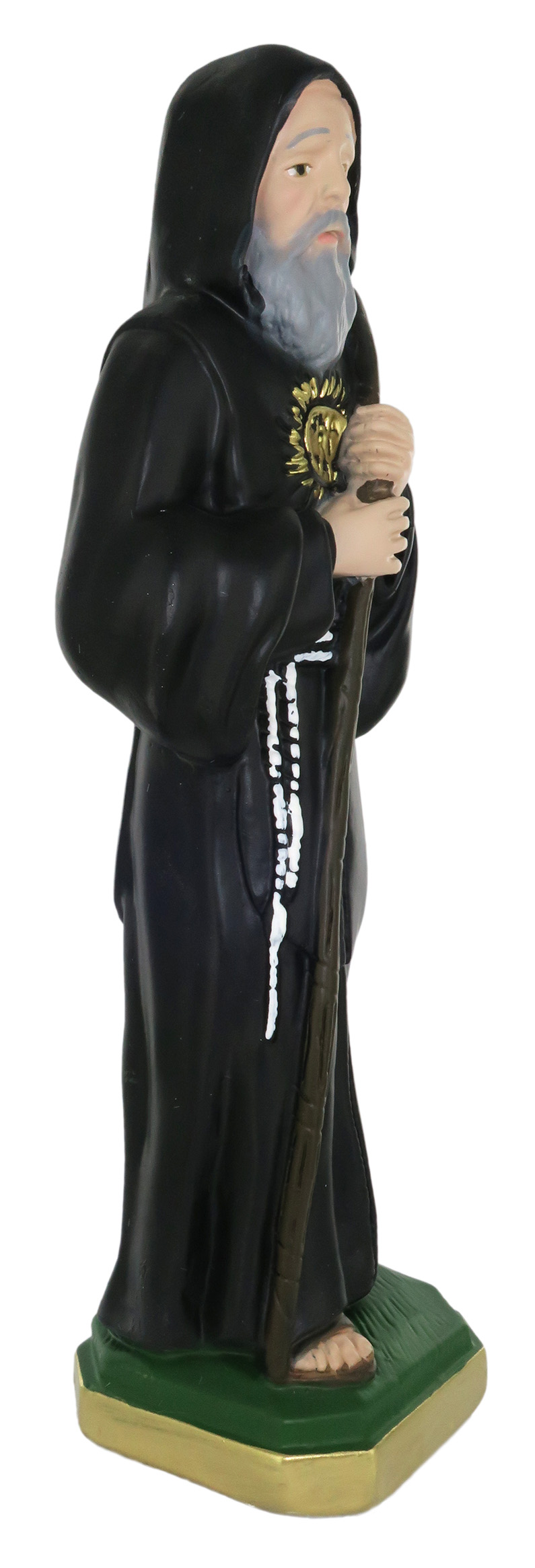 Questa statua di S. Francesco di Paola da 30 cm è realizzata artigianalmente in Italia e si distingue per la qualità della fattura e per il sapiente uso dei colori. Gli indumenti, di un colore nero molto coprente, vantano un'attenzione particolare alla resa delle pieghe, che donano grande plasticità alla rappresentazione.