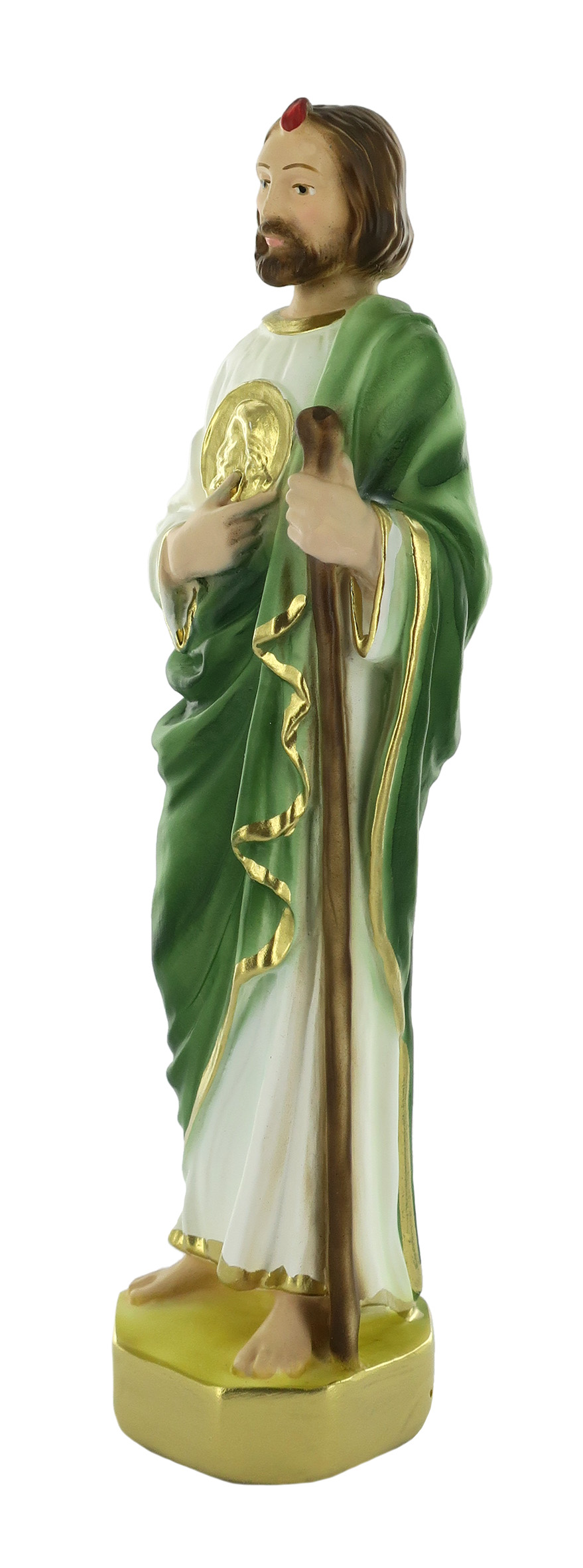 Questa statua di S. Giuda Taddeo da circa 20 cm è realizzata artigianalmente in Italia e si distingue per la qualità della fattura e per il sapiente uso dei colori. Le linee delle vesti e la resa delle loro pieghe donano plasticità alla figura e la rendono suggestiva. Adatta anche a piccole nicchie di luoghi di culto, la statuetta di San Giuda può essere esposta in casa come soprammobile o in una vetrinetta. Sarà particolarmente apprezzata come idea regalo dai devoti di questo personaggio. La luce delle fiammelle dei lumini o dei faretti esalterà la fisicità del soggetto, aumentandone l'impatto visivo.