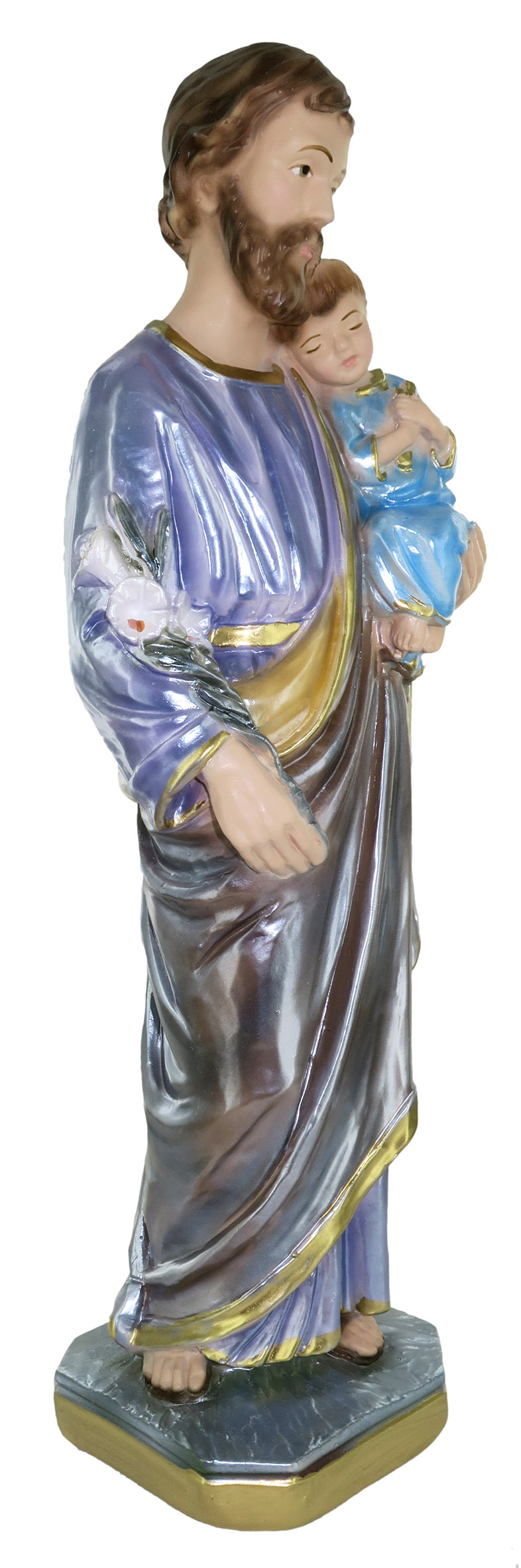 Questa statua di San Giuseppe da 30 cm è realizzata artigianalmente in Italia e si distingue per la qualità della fattura e per il sapiente uso dei colori. L'effetto madreperlato rende le tinte molto lucenti e arricchisce la figura di suggestivi riflessi, donandole un aspetto elegante e pregiato. La statua di S. Giuseppe è ideale per nicchie o luoghi di culto dedicati a San Giuseppe, ma può anche essere esposta in casa come soprammobile o in una vetrinetta. Sarà sicuramente un’idea regalo particolarmente apprezzata dai devoti a questo santo, dichiarato patrono della Chiesa cattolica dal beato Pio IX l'8 dicembre 1870. La luce delle fiammelle dei lumini o di faretti esalterà ulteriormente l'effetto iridescente della sua rifinitura madreperlacea.