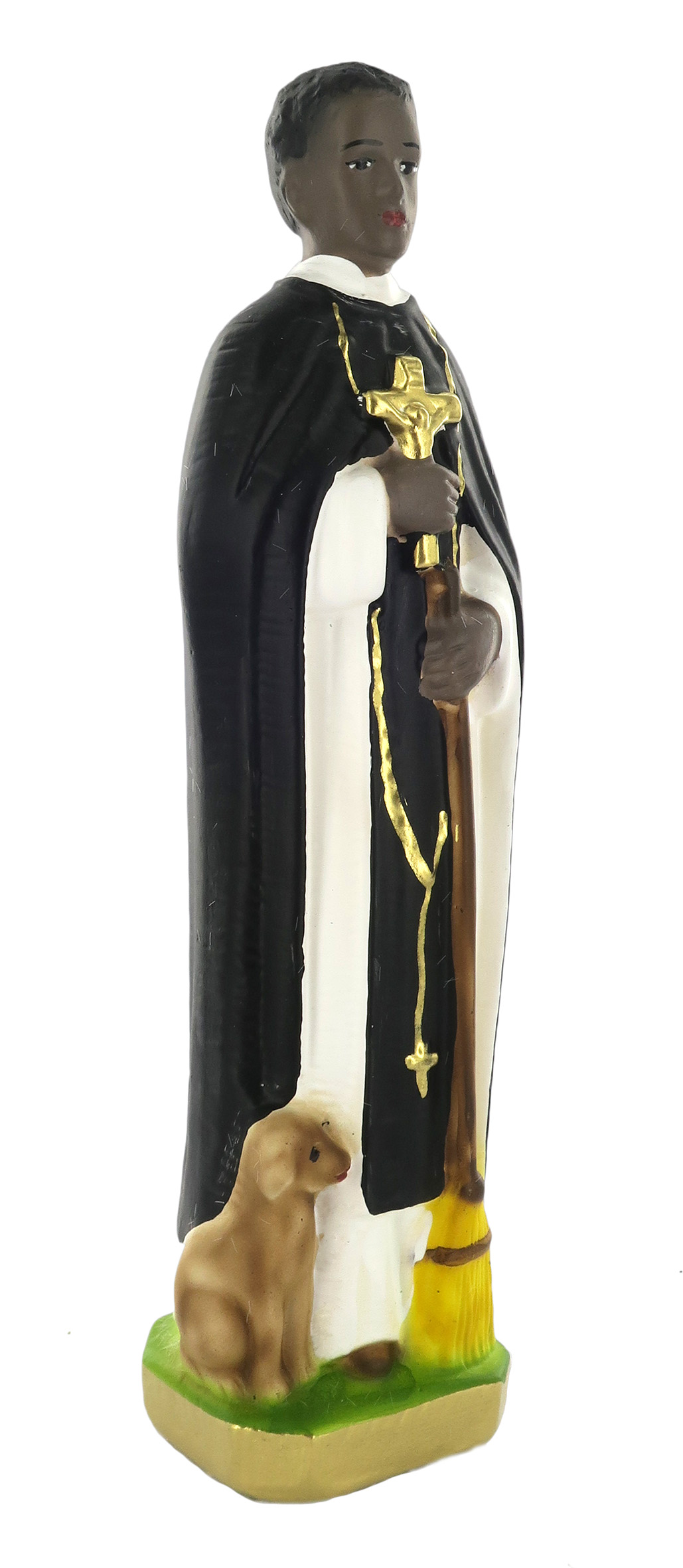 La statua, in gesso finemente dipinto a mano, raffigura San Martino de Porres (Martín de Porres Velázquez), religioso dell'Ordine Dominicano. Nato nella capitale peruviana Lima, è considerato il primo santo di colore della Chiesa cattolica. Da giovane fa pratica presso un barbiere, ma la volontà di unirsi all'ordine prevale. A causa del colore della sua pelle, S. Martino de Porres cominciò il proprio percorso come semplice terziario e gli furono affidati compiti umili. Da qui, la sua diffusa rappresentazione con la scopa. Tra le sue opere, c'è la fondazione di un collegio per bambini poveri a Lima. È il patrono di parrucchieri e poveri.