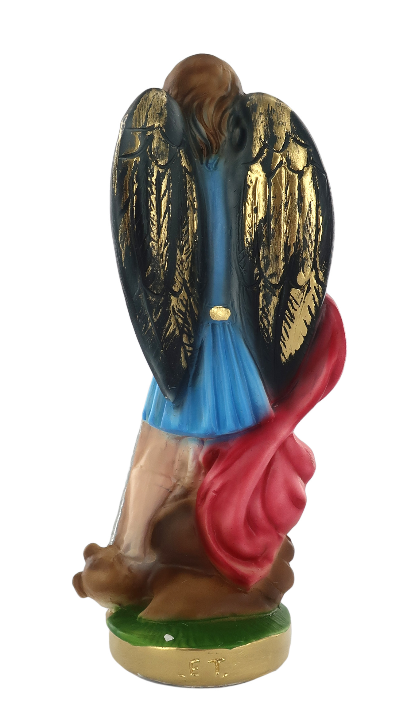 Questa statua di San Michele Arcangelo da 15 cm è realizzata artigianalmente in Italia e si distingue per la qualità della fattura e per il sapiente uso dei colori. Le tonalità cromatiche usate donano plasticità alla figura, celebrata il 29 settembre. La statua è ideale per piccole nicchie, ma può anche essere esposta in casa come soprammobile o in una vetrinetta. La luce delle fiammelle dei lumini o dei faretti esalterà la fisicità del soggetto, aumentandone l'impatto visivo.