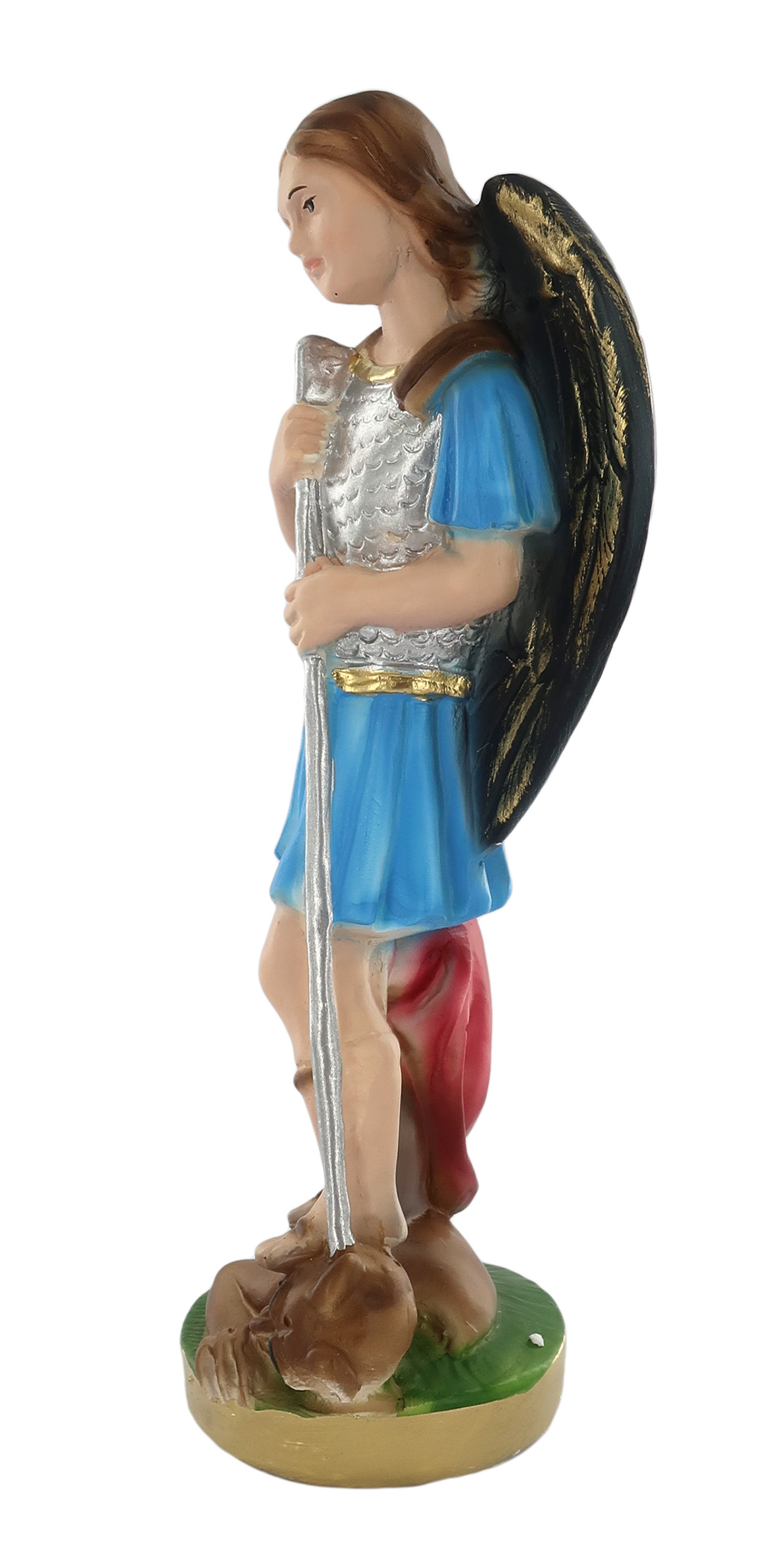 La statua, in gesso finemente dipinto a mano, raffigura San Michele, Arcangelo e Principe delle milizie celesti. Lo stesso titolo di Arcangelo è stato attribuito a S. Gabriele e a S. Raffaele. La sua funzione è quella di difesa della fede in Dio contro le orde di Lucifero (diventato Satana), da cui Michele si è distaccato dopo la scissione degli Angeli da Dio. Il soggetto alato, che imbraccia la propria lancia, è qui rappresentato mentre calpesta il male, rappresentato da una creatura oscura.
