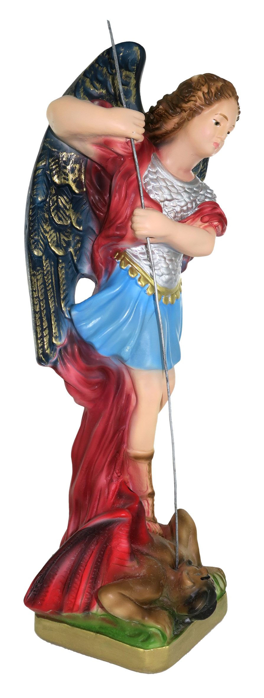 La statua, in gesso finemente dipinto a mano, raffigura San Michele, Arcangelo e Principe delle milizie celesti. Lo stesso titolo di Arcangelo è stato attribuito a S. Gabriele e a S. Raffaele. La sua funzione è quella di difesa della fede in Dio contro le orde di Lucifero (diventato Satana), da cui Michele si è distaccato dopo la scissione degli Angeli da Dio. Il soggetto alato, che imbraccia la propria lancia, è qui rappresentato mentre calpesta il male, rappresentato da una creatura marrone dalle ali rosse. Michele veste un mantello rosso da cui spiccano due ali sfumate da tocchi di color oro e indossa un'armatura color argento.