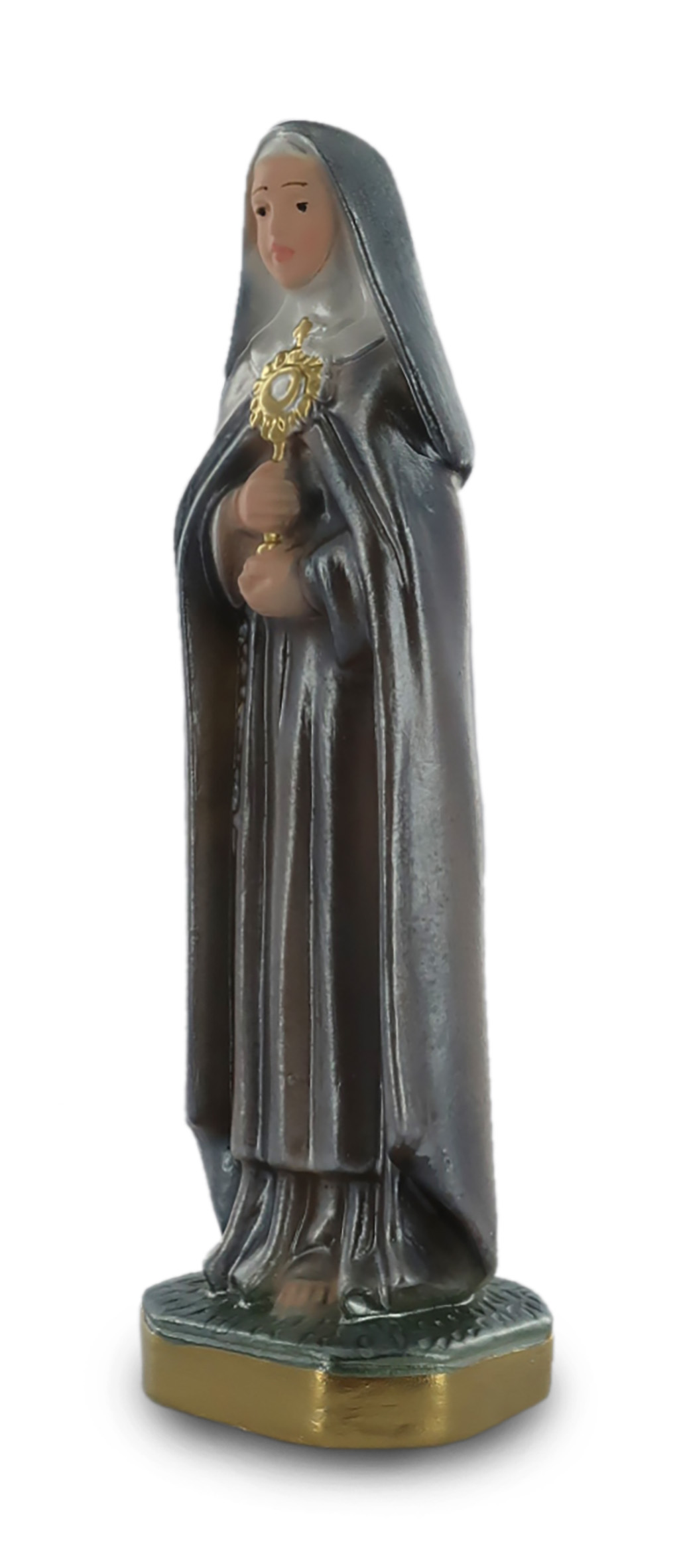 La statua, in gesso finemente dipinto a mano e impreziosito da una rifinitura madreperlata, raffigura Santa Chiara. Fondatrice e badessa dell'Ordine femminile delle «povere recluse» (che in seguito sarebbero diventate "Clarisse"), S. Chiara si distinse per il culto verso l'Eucarestia, simbolo molto spesso a lei attribuito. Ad Assisi, infatti, cittadina minacciata militarmente dall'imperatore Federico II che tra le sue fila schierava anche soldati saraceni, fu fatta entrare Chiara con in mano la pisside e il Santissimo Sacramento. A tale vista, si racconta che l'esercito batté la fuga.