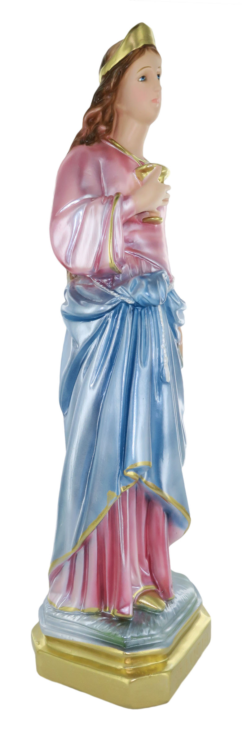 Questa statua di S. Lucia da 40 cm è realizzata artigianalmente in Italia e si distingue per la qualità della fattura e per il sapiente uso dei colori, adeguatamente dosati. L'effetto madreperlato rende le tinte molto lucenti e arricchisce la figura di suggestivi riflessi, donandole un aspetto elegante e pregevole. Adatta a nicchie in ambienti dedicati al culto, la statua di Santa Lucia risulterà ancora più bella se illuminata dalla luce di lumini o di faretti, che esalterà l'effetto iridescente della sua rifinitura madreperlacea.